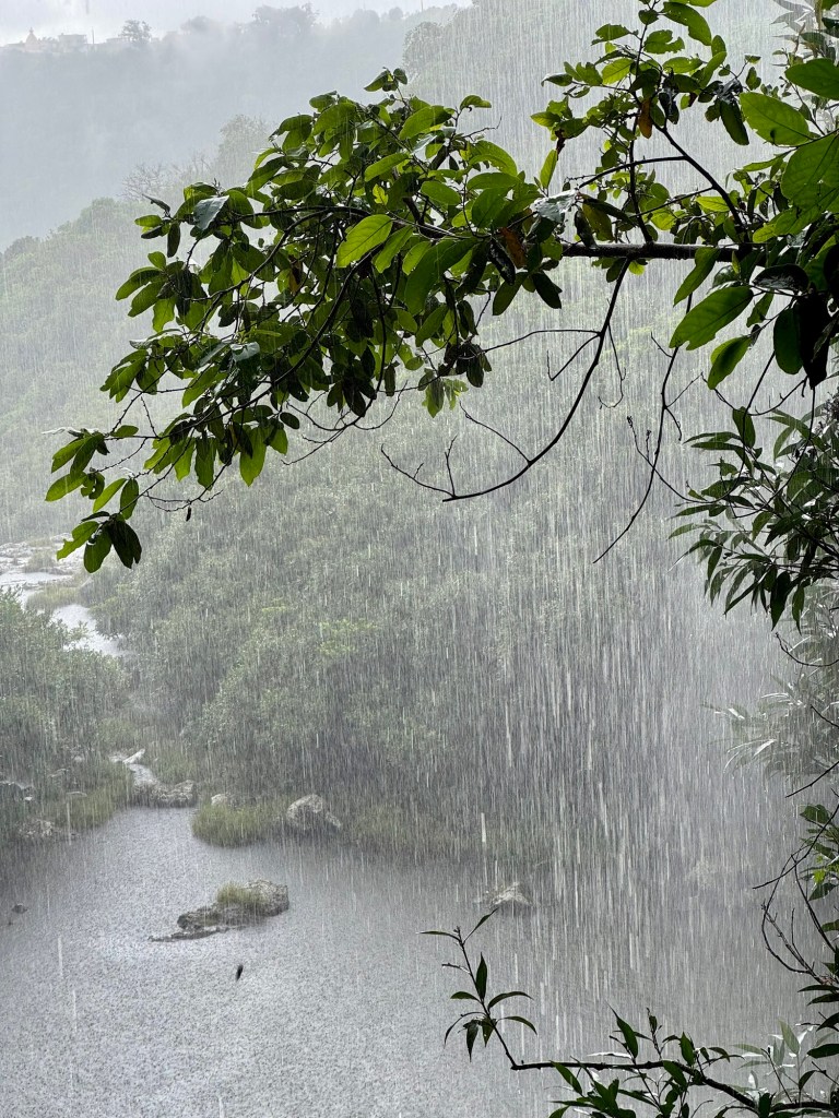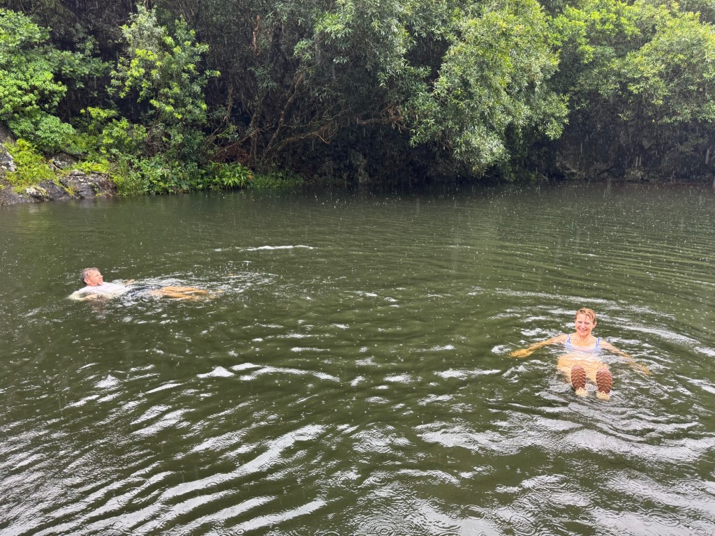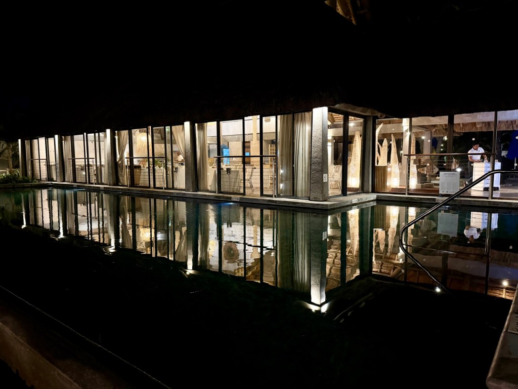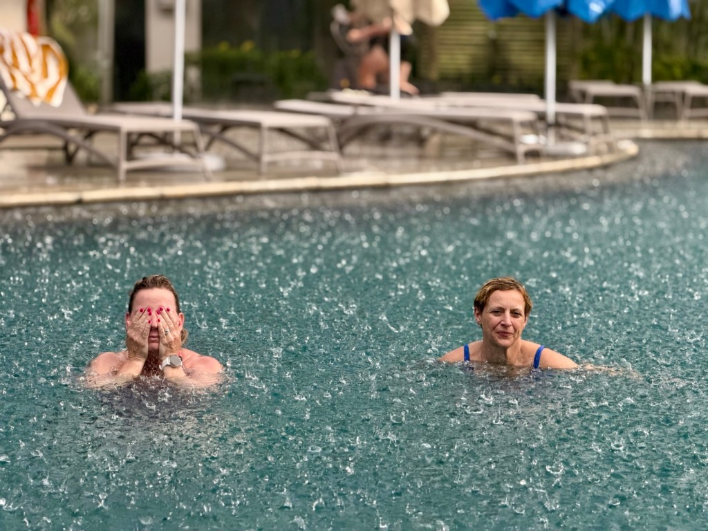 Úgy értünk vissza a szállásra, hogy vacsora előtt volt még időnk medencézni egyet, bár ahogy beléptünk a kellemesen meleg vízbe, eleredt az eső. Hagytuk, hogy ne a medence vize, hanem az eső mossa tisztára a hajunk. Nagy eső volt, de nem tartott hosszan.
