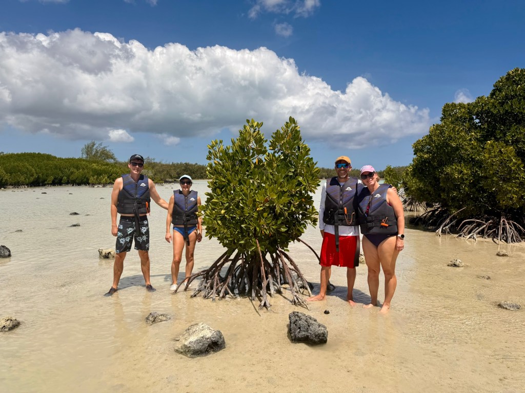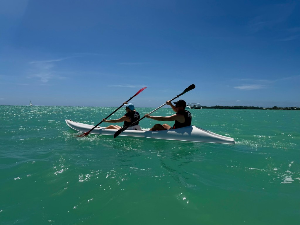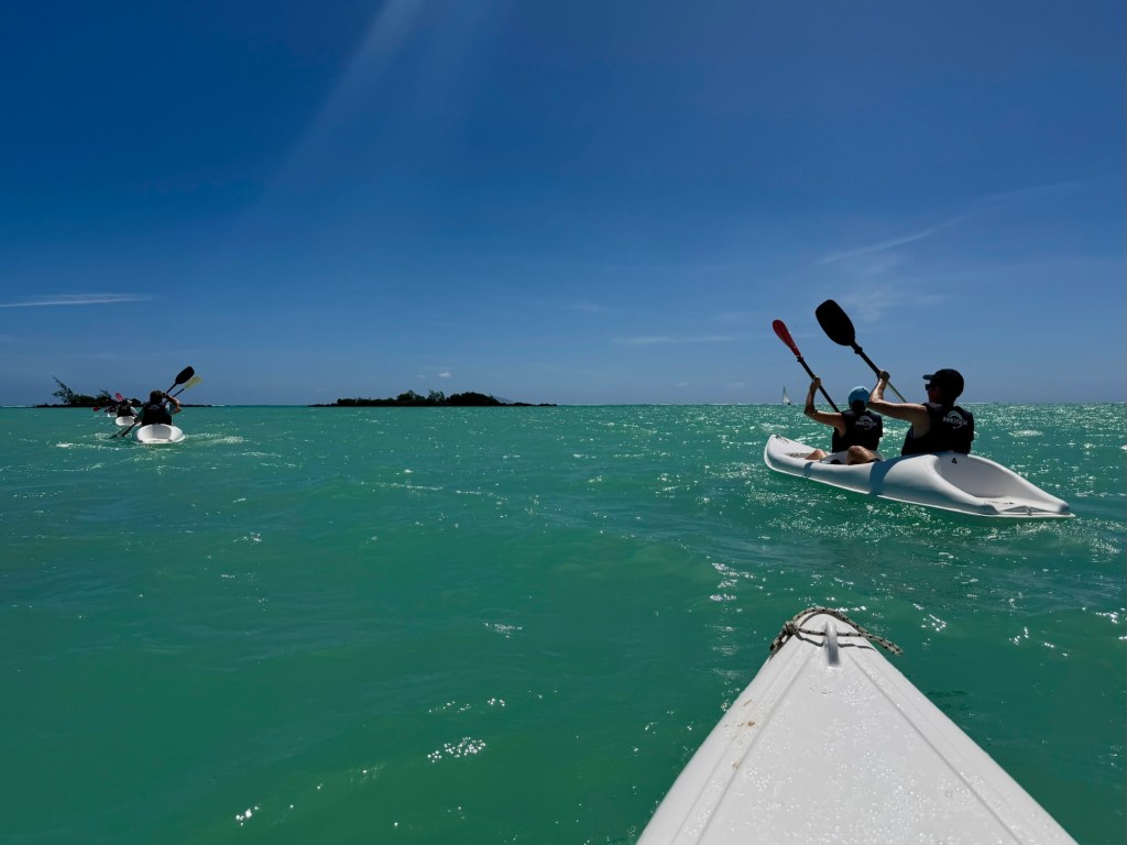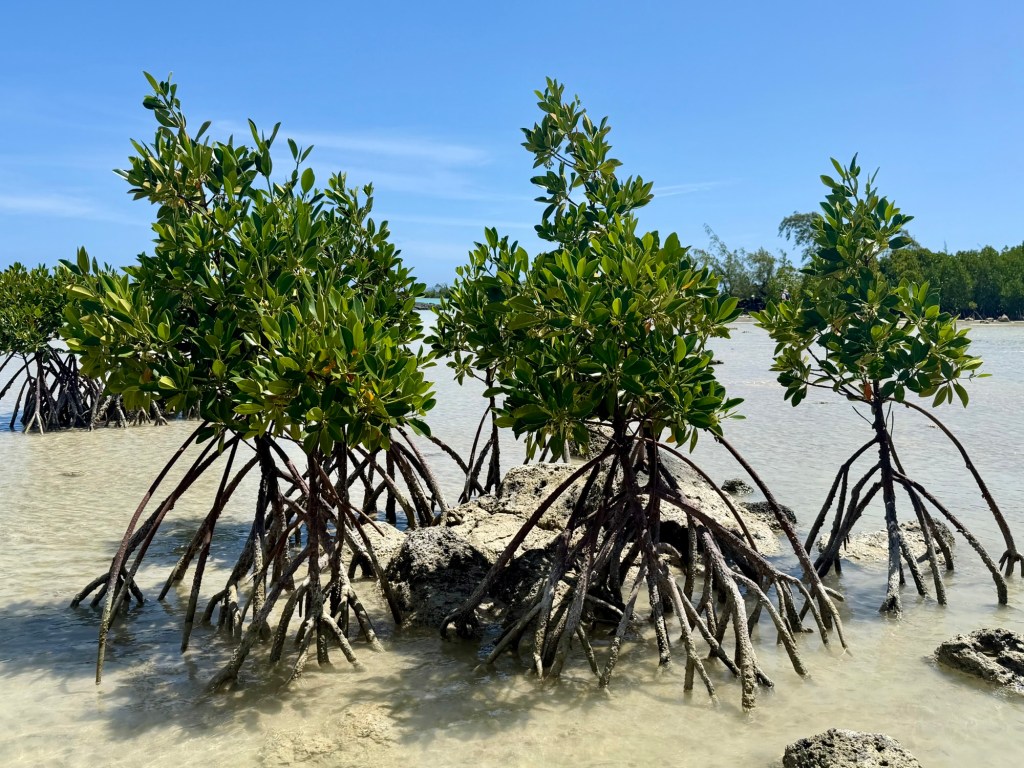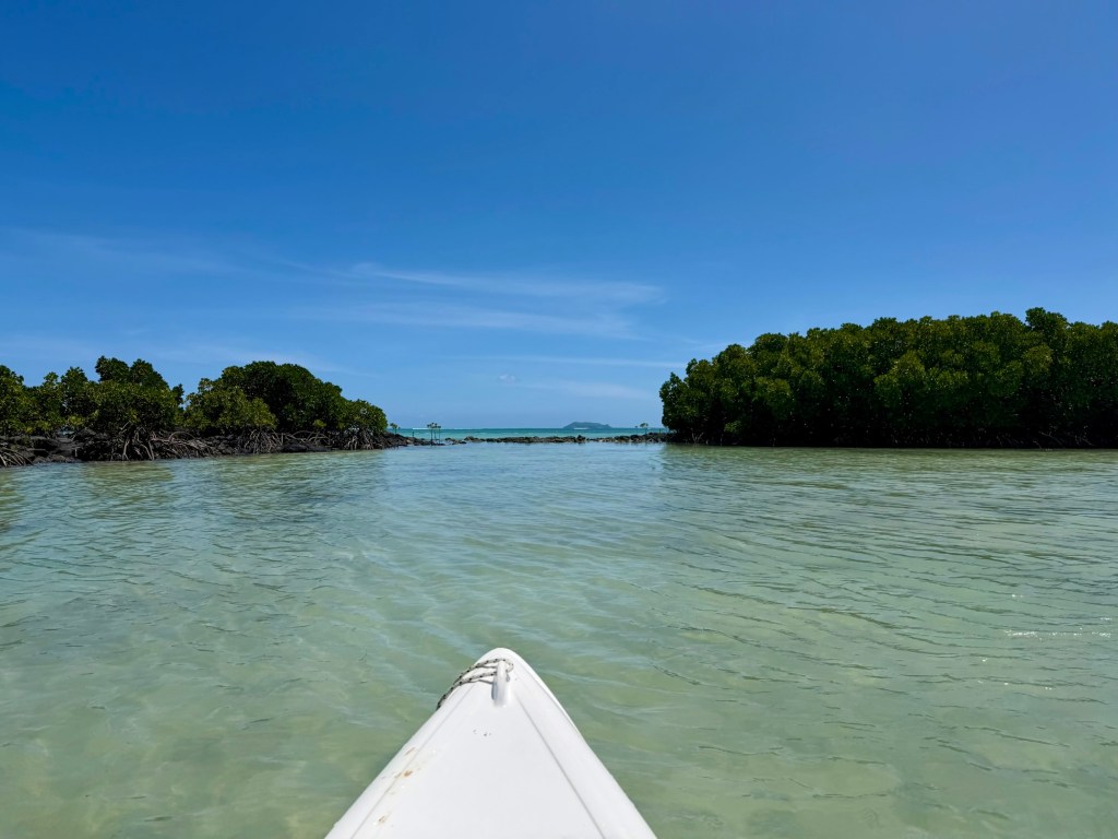 A szálloda szervezett egy kajaktúrát a közeli mangrove erdőbe, amire korábban már szerettünk volna becsatlakozni, de nem volt hely, ezért a mai csapatot tudtuk erősíteni. Ez a program végül sokkal másabb volt, mint vártam. A mangrovék világa mindig is tetszett. Itt a víz néhol annyira alacsony volt, hogy ki tudtunk szállni a kajakokból, és a bokáig érő, langyos vízben gázolva fedeztük fel a növényvilágot. Máshol viszont mélyebb szakaszokon csendesen siklottunk a türkizkék óceán hol homokos, hol köves talaja felett. Elképesztő ez az ökoszisztéma, mintha a szárazföld és a tenger folyamatosan szkanderezne egymással.
