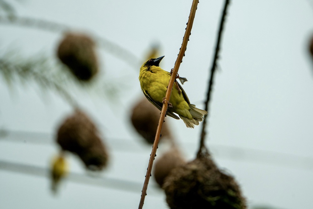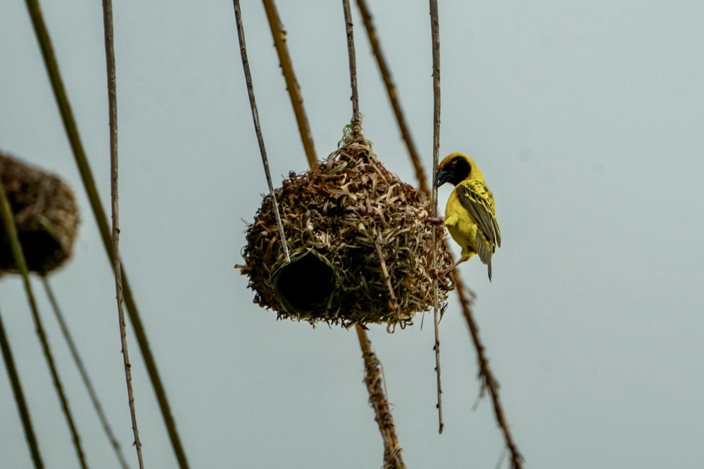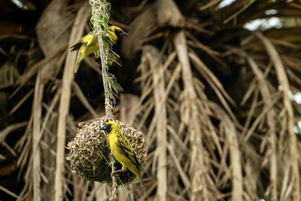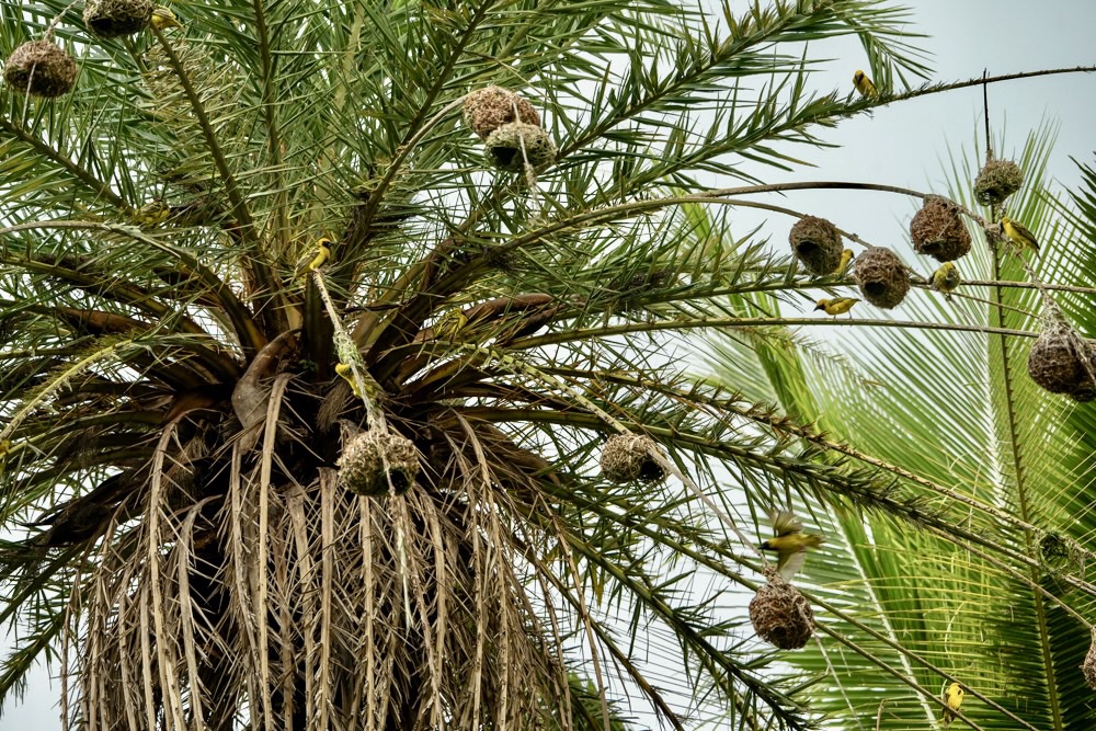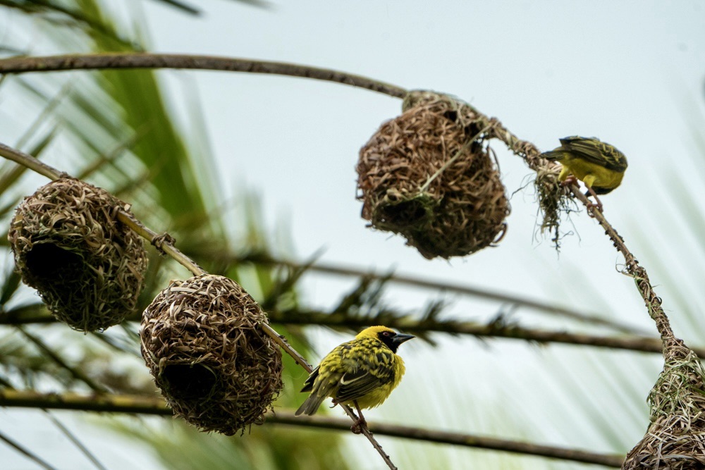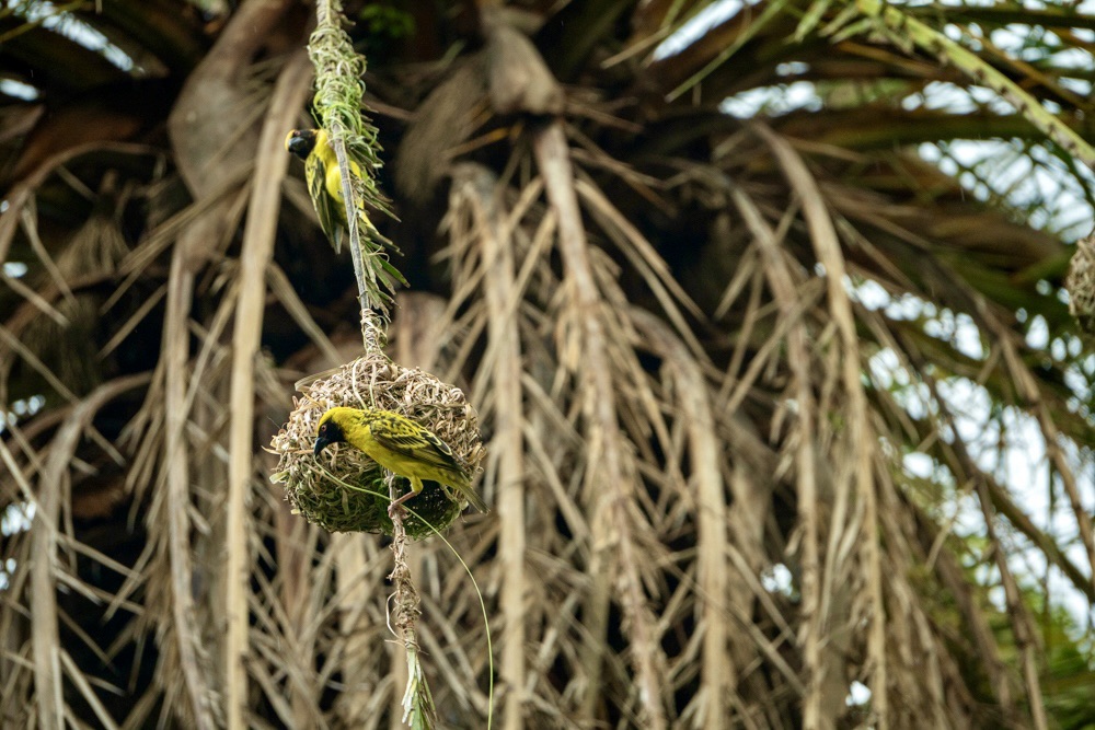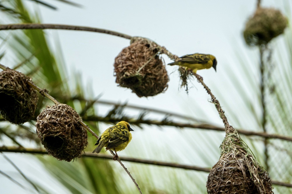 A pálmafák ágai nem csak a széltől mozognak: tucatnyi élénk kis fodi lakberendezési lázban ég ilyenkor. Ez a kis madár nem csak a színével (a hímek ilyenkor pompás sárga-narancs díszben feszítenek) hívja fel magára a figyelmet, hanem elképesztő építészeti tehetségével is.