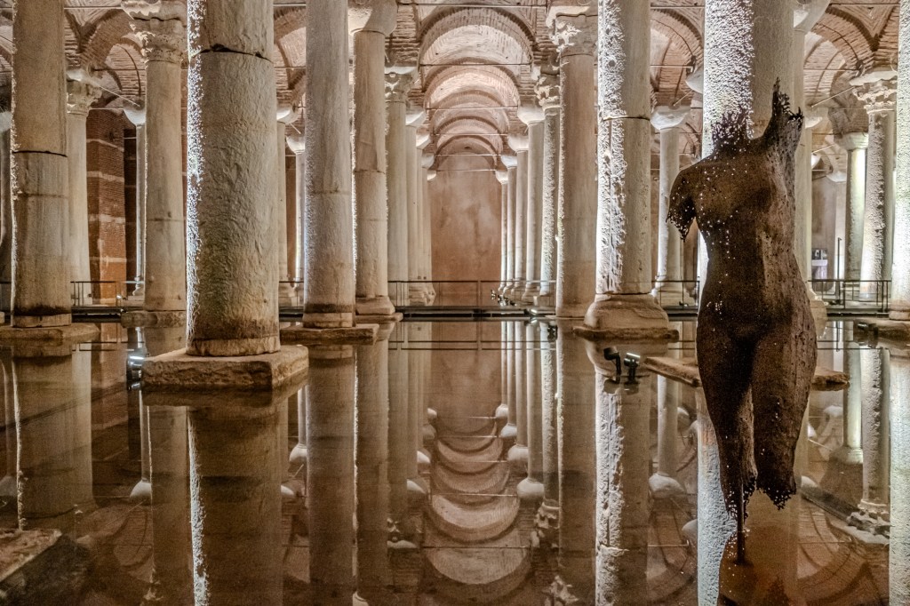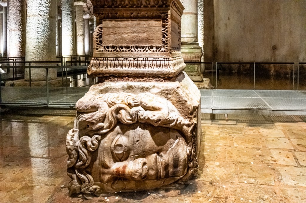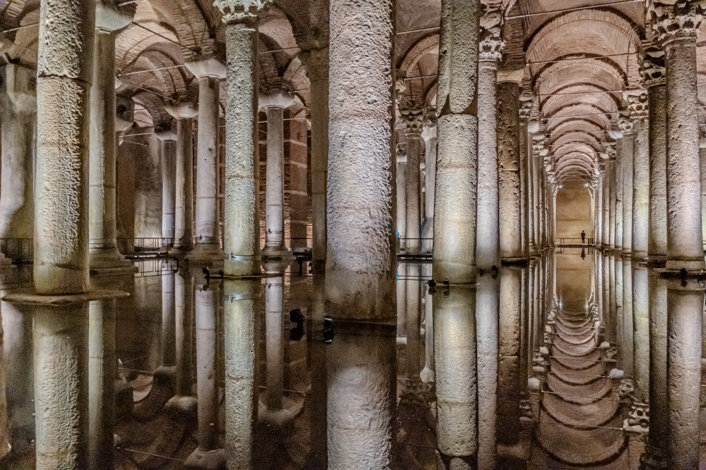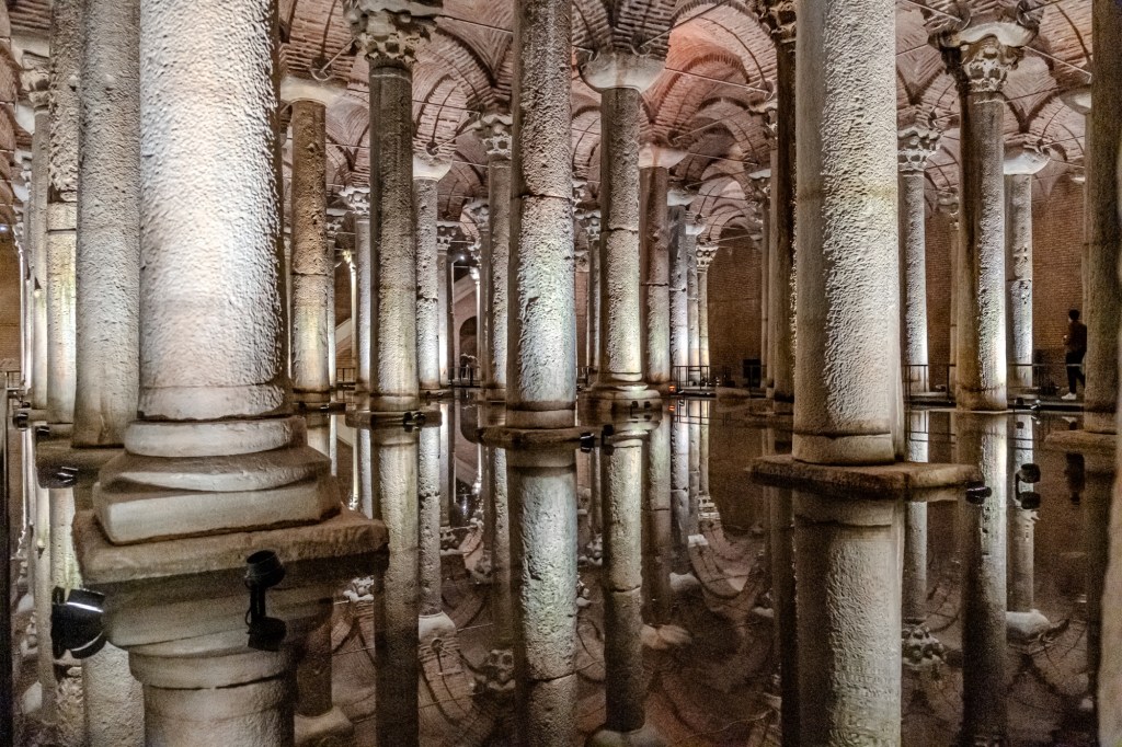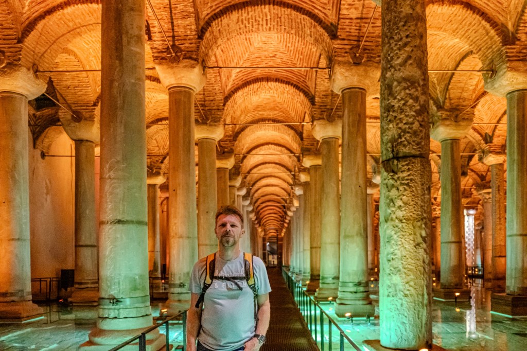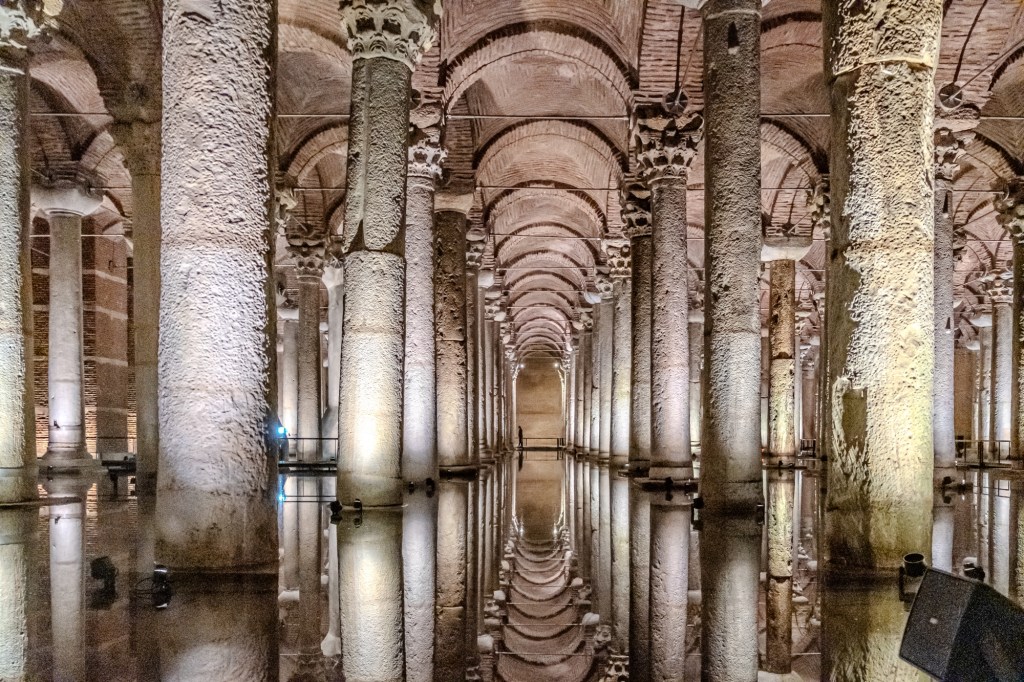 Mikor kijöttünk a mecsetből a térképet nézegetve, rájöttünk, hogy ahol kora délután egész hosszú sor állt az utcán, az nem más, mint az Elsüllyedt Palota (más néven Bazilika Ciszterna). Az egyik legnagyobb a több száz hajdani víztározó közül, melyek ma is ott fekszenek Isztambul alatt. 2 percre voltunk tőle. Ráadásul úgy tűnt este 10-ig nyitva van (9 óra volt). Drága a belépő, mert 1000 török líra, ami 13.000,- Ft, de abba a szuper helyzetben voltunk, hogy nem hogy nem volt sor a bejáratnál, hanem rajtunk kívül max 6 ember volt. A víztározót I. Justinianus bizánci császár építtette 532-ben. A 143×54 méteres termet 336 darab 8 méternél is magasabb márvány oszlop tartja. A legtöbb oszlopot korinthoszi oszlopfő koronázza, ez is alátámasztja azt a feltevést, hogy hajdani épületek elbontásával teremtettek nyersanyagot az Elsüllyedt Palota építéséhez. Az Isztambuli Városi Múzeum által végzett 1985-ös helyreállítás után 1987-ben megnyitott víztározó különböző szobrokkal és megvilágításokkal játszik, ezzel is megmutatva a hely különlegességét.