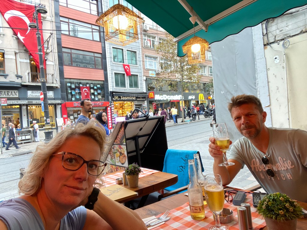 Isztambulban kellemes idő várt minket: 21 fok, de párás füledt volt az idő. Nem fáztunk. A reptér 40 kilométerre van a belvárostól. Be lehet menni a városba tömegközlekedéssel, akkor az bő két óra, vagy lehet taxizni, ami meg forgalomtól függően 50-60 perc. A taxit választottuk: lehet kártyával fizetni a taxisnál és az óra ketyeg, nem hasraütésszerűen mond egy összeget a végén a sofőr. Kilencezer valahányszáz volt a viteldíj. Otthoni árakhoz képest a taxi olcsóbb.