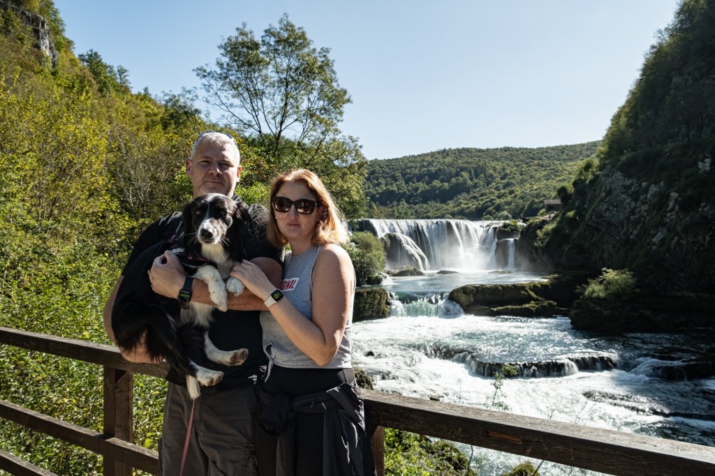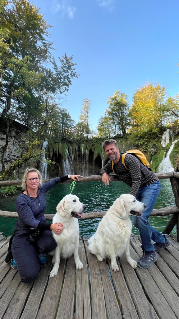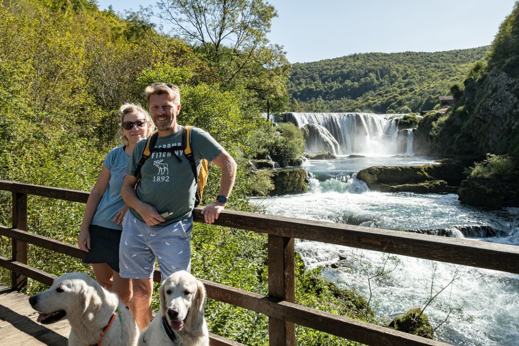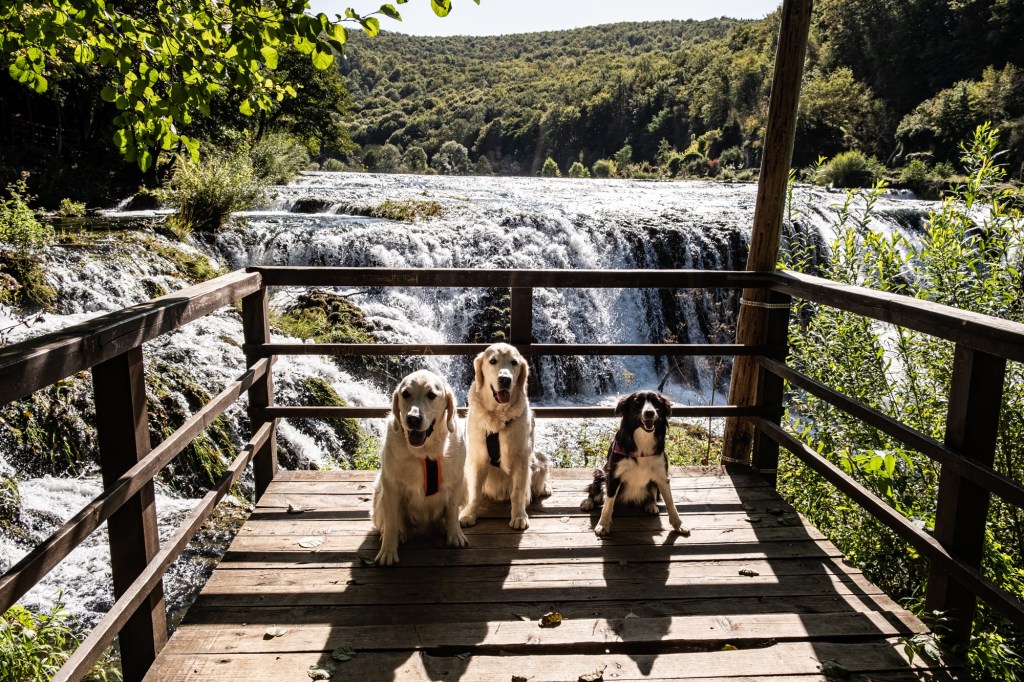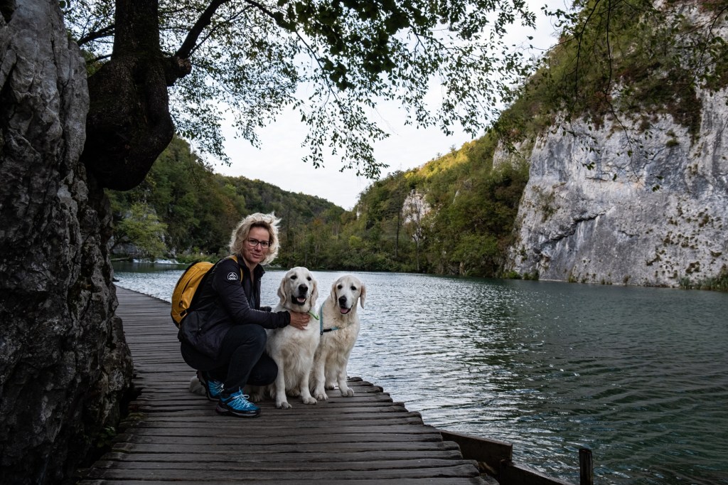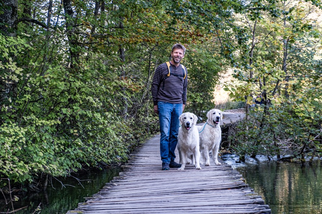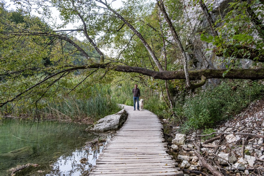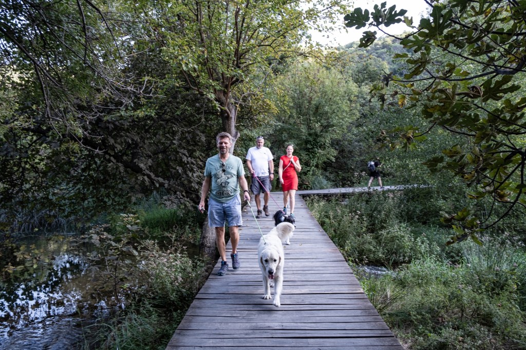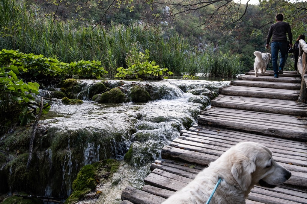 A bosnyák-horvát határon legalább nem volt sor! Sőt, jó helyen tudtunk parkolni a Nemzeti Parknál és még nem volt ott sem tömeg. Egy négy órás túrát csináltunk, 8 kilométert mentünk. Több szempontból is jól sikerült, hogy ilyen korán kellett érkezzünk: ugyan reggel még kicsit csípős volt az idő, de a 25 fokban, csudi napsütésben a kutyáknak már sok lett volna ez a túra. Egyértelműen kevesebben vannak nyitáskor, kényelmesebben lehetett menni a kiépített pallókon.