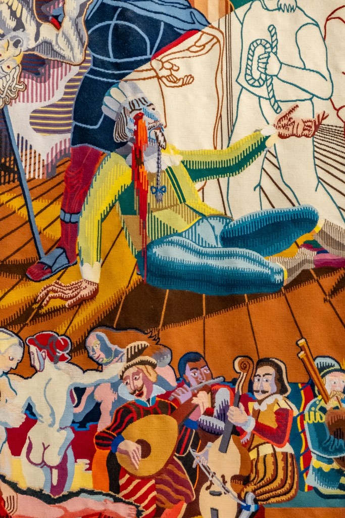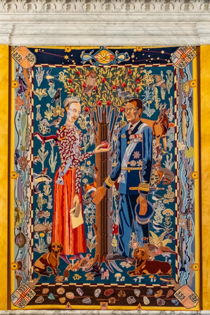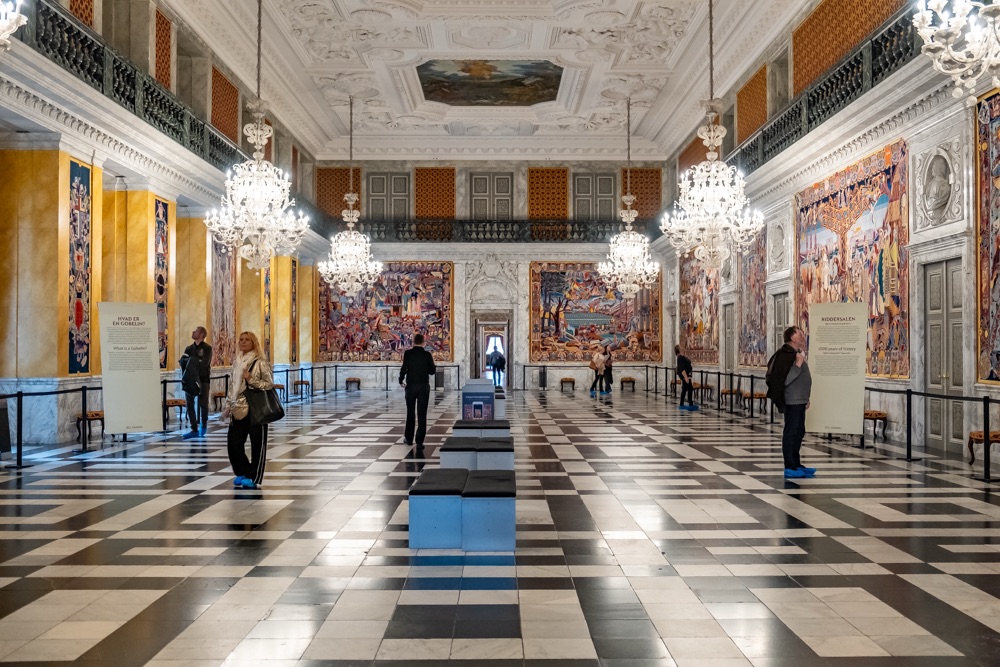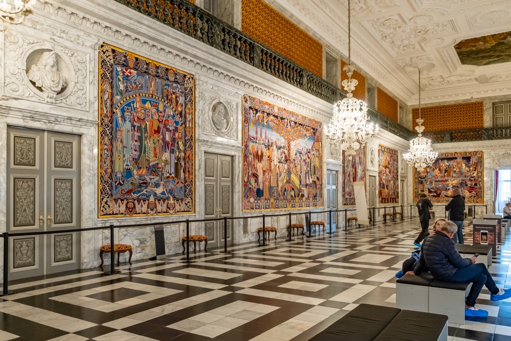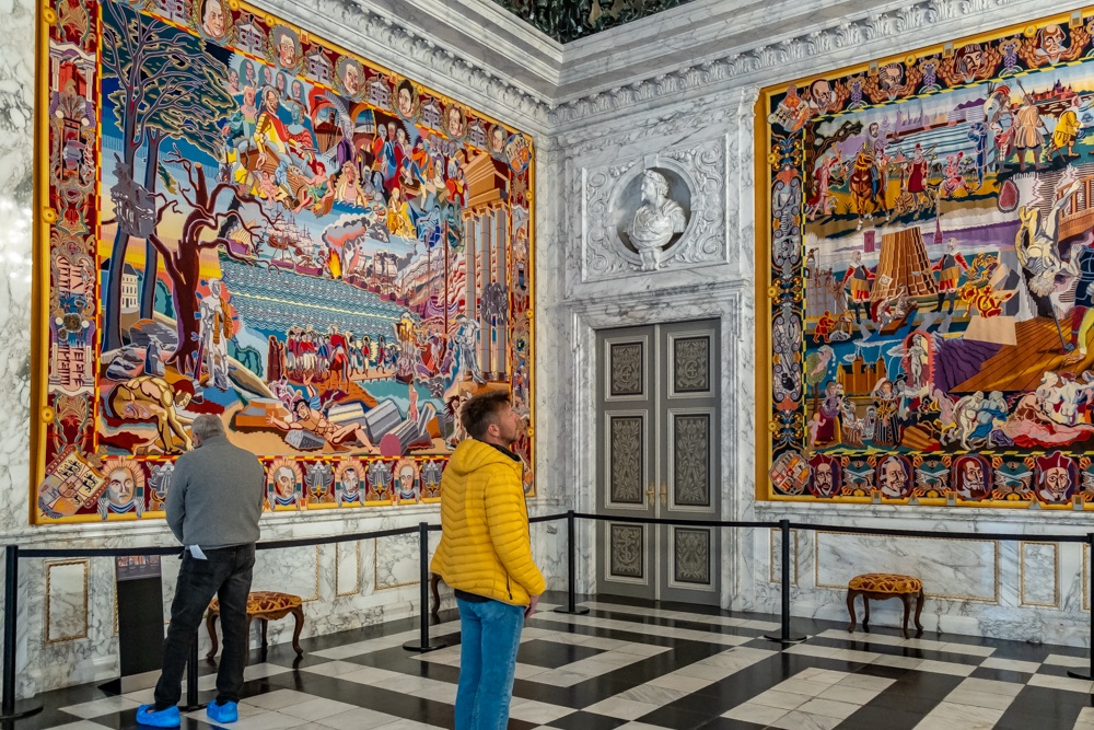 Délután Christiansborg Palotához sétáltunk el, ami a kormányzati palota Koppenhága belvárosában. Itt található a dán parlament, a miniszterelnöki hivatal és Dánia legfelsőbb bírósága is, valamint a királyi fogadó termek. A lovagterem falait Bjørn Nørgaard színes faliszőnyegei díszítik, amelyek a dán történelem 1000 évét mutatják be képekben a viking kortól napjainkig. A 17 fali szőnyeget II. Margit királynő kapta az 50-dik születésnapjára. Egyik oldalról a fali szőnyegek nagyon részlet gazdagok, színesek, érdekesek, iszonyat munkát tartalmazóak, másik oldalról meg all az ember a szőnyeg előtt és abszurd részleteket szúr ki. Nekem nagyon tetszettek.