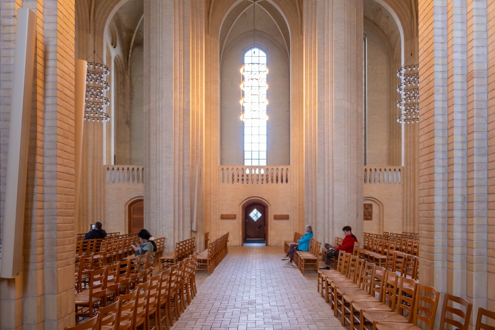 A Grundtvig templomnak két szószéke és két orgonája van, mivel a templomot két szakaszban építették. Hosszan épült, végleges formáját 1940-ben érte el. A város egyik legszebb templomának tartják, építész tanulók mellett kőműves tanoncokat is rendszeresen hoznak ide megtekinteni a templomot.