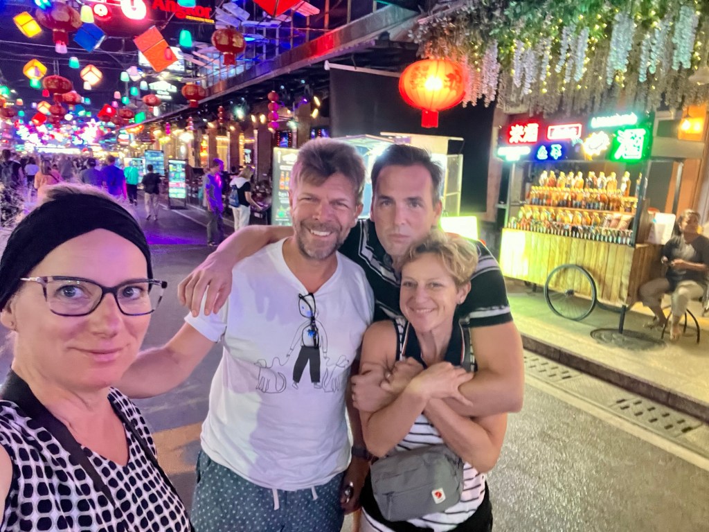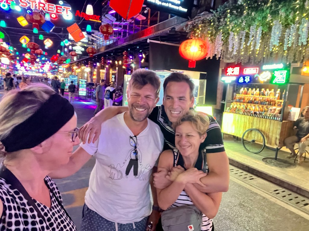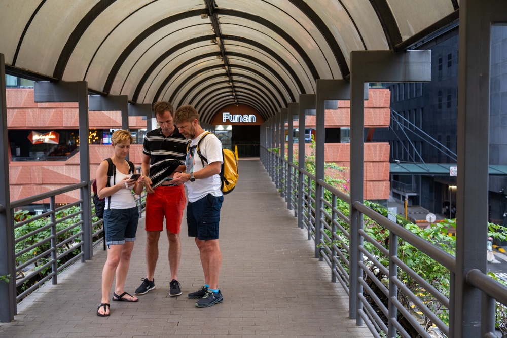 Miután lepakoltunk, elindultunk felfedezni a várost. Már nem esett az eső. Céltalanul mentünk, csak meg akartuk ízlelni az új város milyenségét. Iszonyatosan nagy kontraszt Hanoi és Siem Reaphoz képest. De Budapesthez viszonyítva is. Minden úgy modern és fejlett, hogy már a szállodában való bejutásnál is rácsodálkoztunk dolgokra. Előre le kellett tölteni egy applikációt, amiben a szállodai bejelentkezést félig meg is lehetett csinálni. Itt már csak befejezték nekünk, és aktiválták az app-ban a szoba számot, meg az ajtó nyitót. Vagyis mobillal nyitjuk az ajtót és a lift is azzal indul a szintünkre.