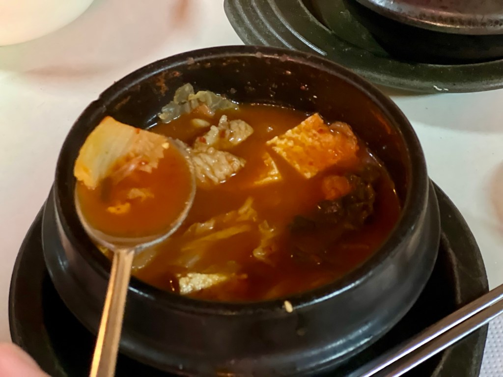 Ennek a kis áthelyezéses manővernek az lett az eredménye, hogy valóban kettesével, kényelmesen ültünk, de az ebéd osztásnál annyira a sor végére kerültünk, hogy étel választási lehetőségünk már nem maradt. A csirkés bármi (nem tudtuk meg, hogy mi volt) elfogyott, nekünk a marha gulyás maradt. Nem hittem a fülemnek, amikor a srác elnézést kérve, kezembe nyomva az ételt angolul nevén nevezte azt. Ilyen jó gulyást utoljára Ausztriában ettünk (talán még ott se). Nem a magyar, leveses verzió volt, hanem az osztrák sűrű, pörkölt szerű, kellemesen fűszeres, krumplival. Meg is állapítottuk, hogy micsoda hazai ízek.