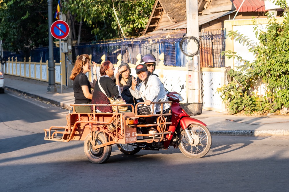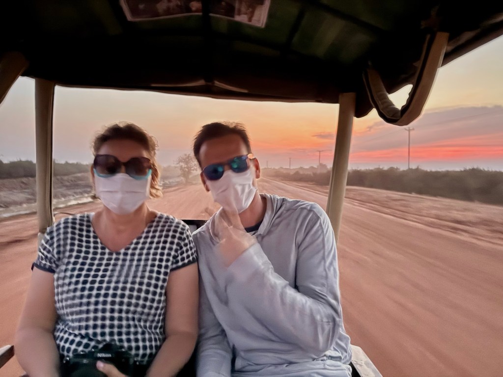 Reggel órára keltünk fél 7-kor, hogy elsők legyünk a 7-kor nyitó reggelizőben, mert 7:45-re jött értünk a kocsi. A reptér egy órányira van kocsival. Mab két nappal ezelőtt lelkesen felajánlotta, hogy ő majd kivisz minket a “hintóján”, de hát a bőröndök száma is több volt annál, meg hirtelen elképzeltük, hogy a kocsival egy órás út mennyivel lenne több, és mennyivel lenne hűvösebb. A reptérre menet láttunk ilyen párt, aki a tuk-tuk végében a bőröndjeinkkel takarózva várták, hogy érjenek már ki a reptérre.