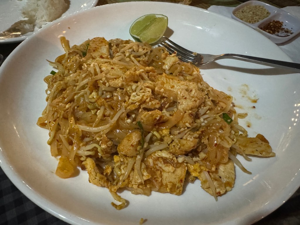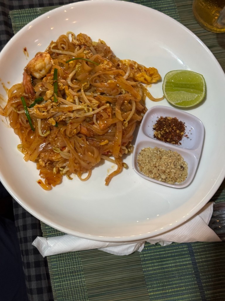 A naplementét elértük, megcsodáltuk, majd ahogy lement a nap rájöttünk, hogy kicsit alul öltözve jöttünk el, mert nem csak a nap nem melegített már de a motorcsónakban is és aztán a “hintón” is kaptuk a friss levegőt bőven. Szécsiék egy-egy vékony pulcsit bedobtak, de mi még azt se. Orsi viszont vett egy keresztbe megkötős szoknyát, ami hirtelen nagyon jól jött: négyünk térdét takartuk be vele. Majd a maszkokat felkaptuk és rácsűrtük a napszemüveget is, hiába volt már sötét. Mab a városba vitt minket, ahol kiszállva a hintóból mindenki furcsa felesleges por réteget érzett magán és egyben látott a másikon. A hajunk összeállt a portól, ruháink vöröses színben éktelenkedett. Éhesek voltunk, így igyekeztünk nem ezzel foglalkozni, inkább beültünk egy német pasi thai éttermébe. Mint kiderült, a felesége thai, így azért valamennyire oldalhelyes volt az ötlet, hogy ilyen éttermet nyisson.