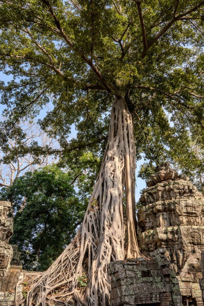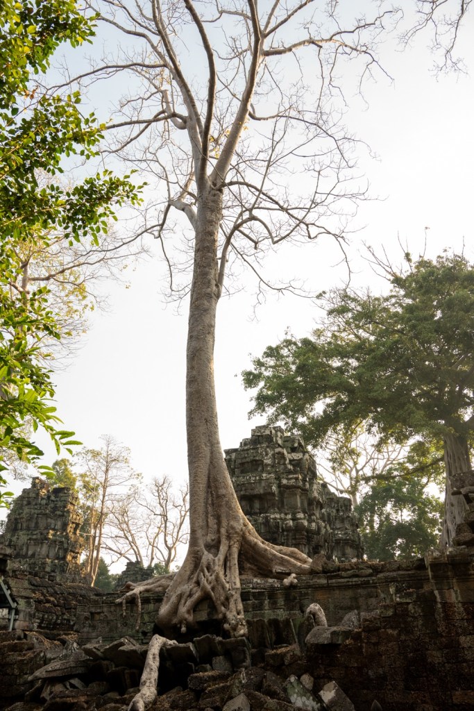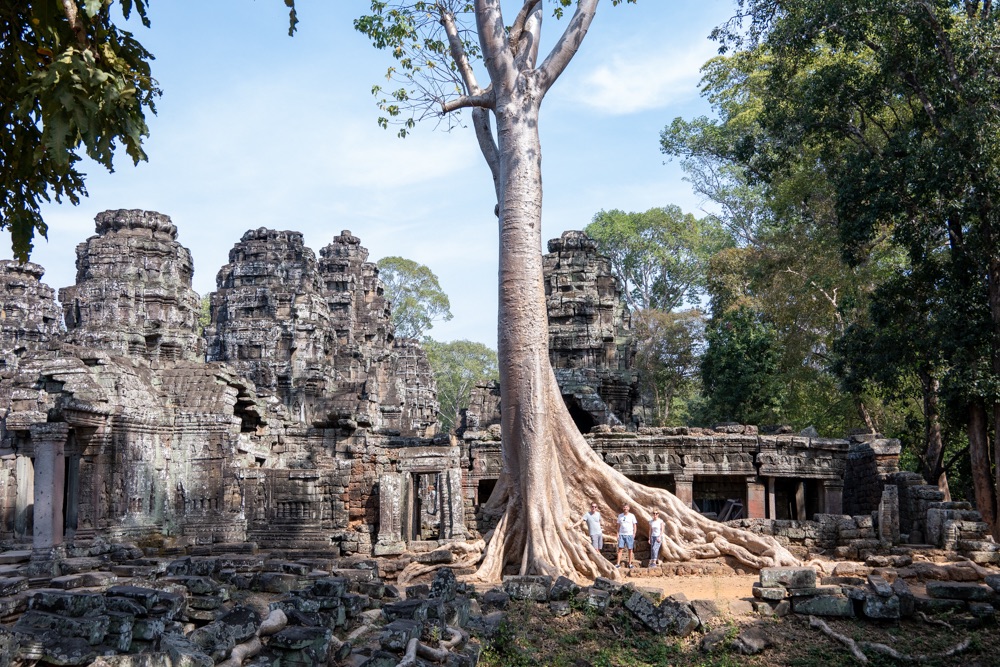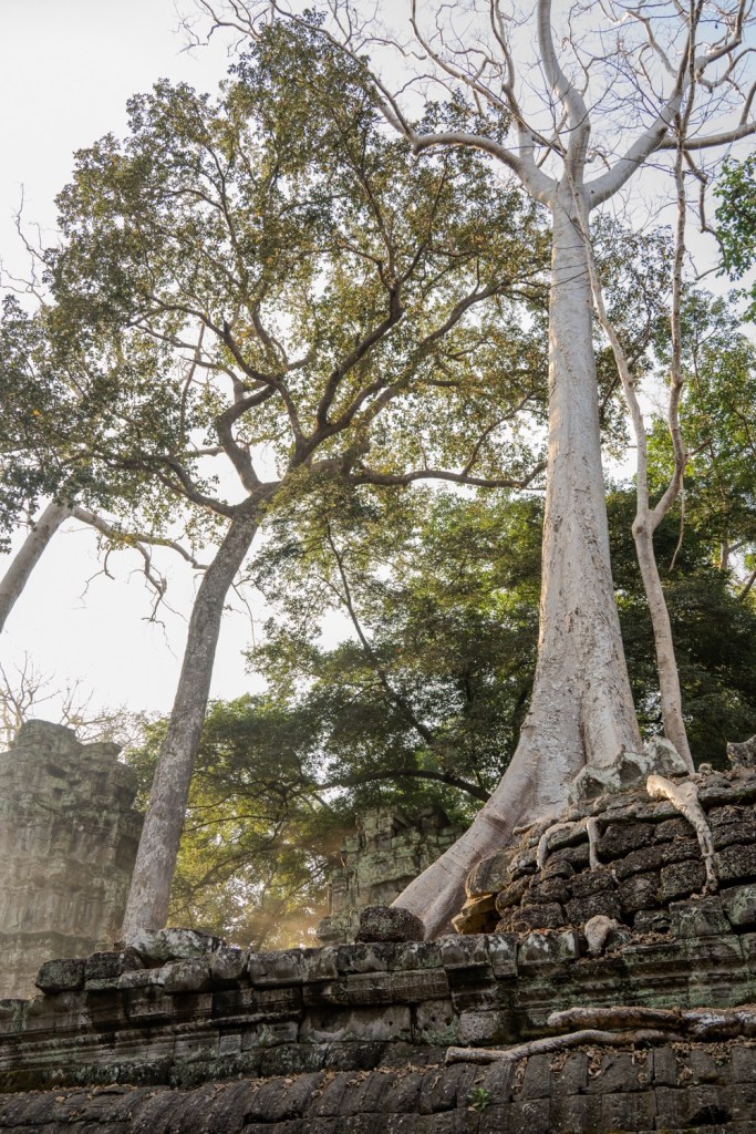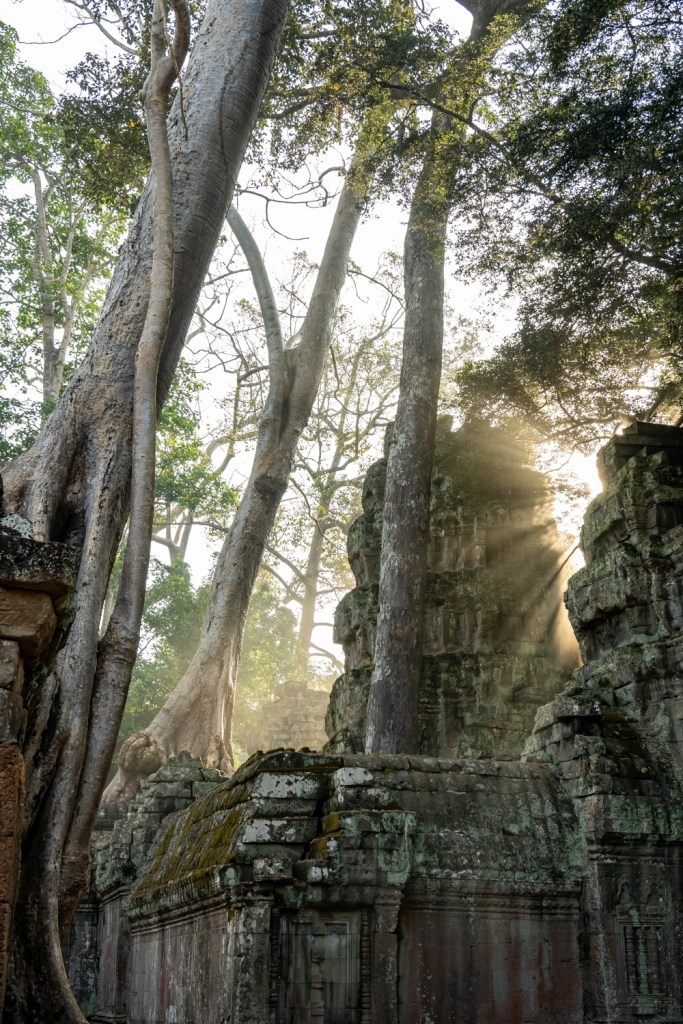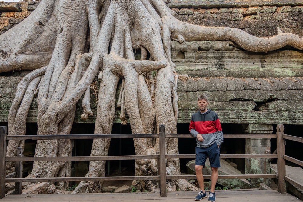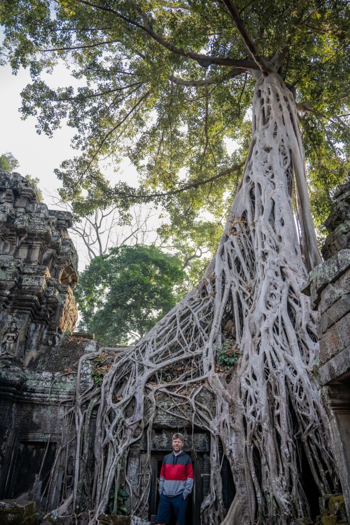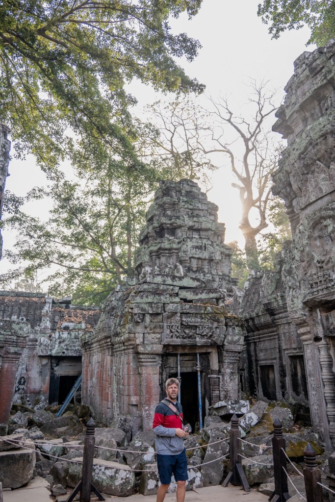 Néhány fotóval később átmentünk a Bandi templomához, Ta Prohmhoz. Nagyon jól alakult, közel sehol senki nem volt, és a reggeli fények is nekünk kedveztek. Tényleg izgalmas a rom templom a dzsungel több száz éves fáinak gyökereivel, amely tekereg és aláfúrja magát a régi épület kövei között, majd hatalmasra nőve rendezi át az ember alkotta dolgokat. Ebben a versenyben egyértelműen a természet győzött, de így együtt gyönyörű.