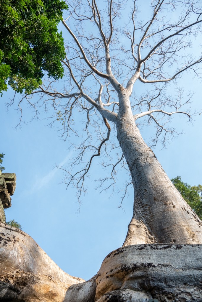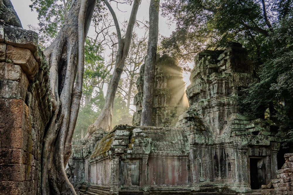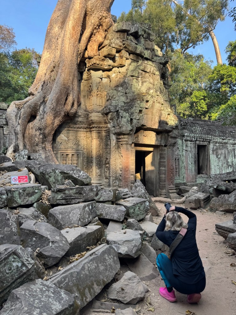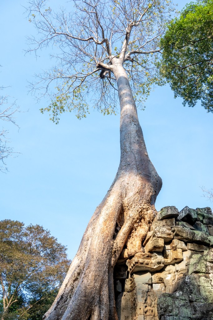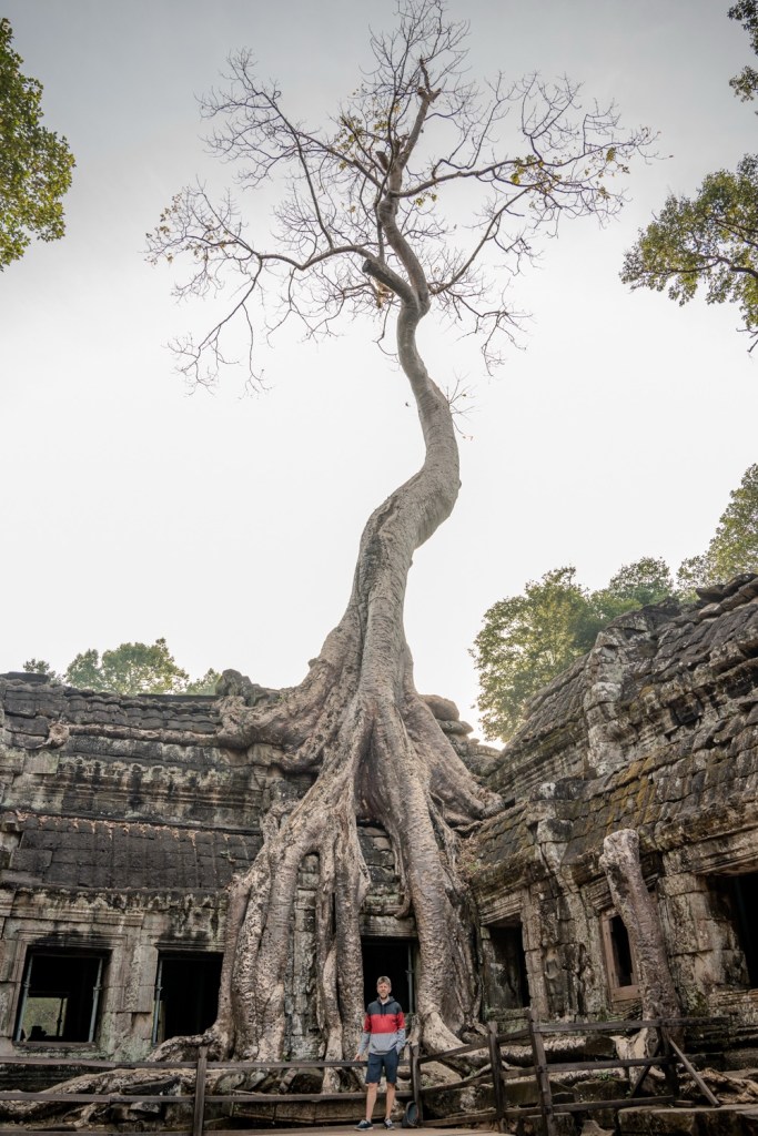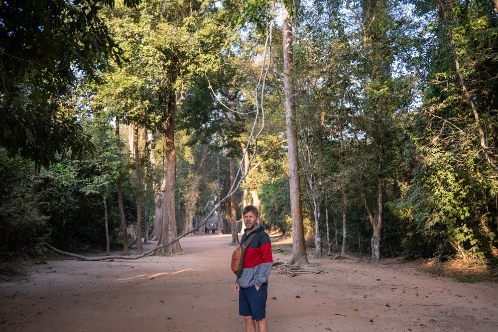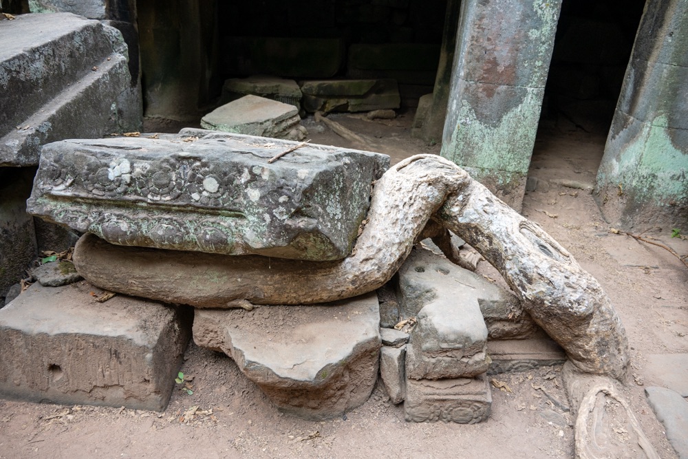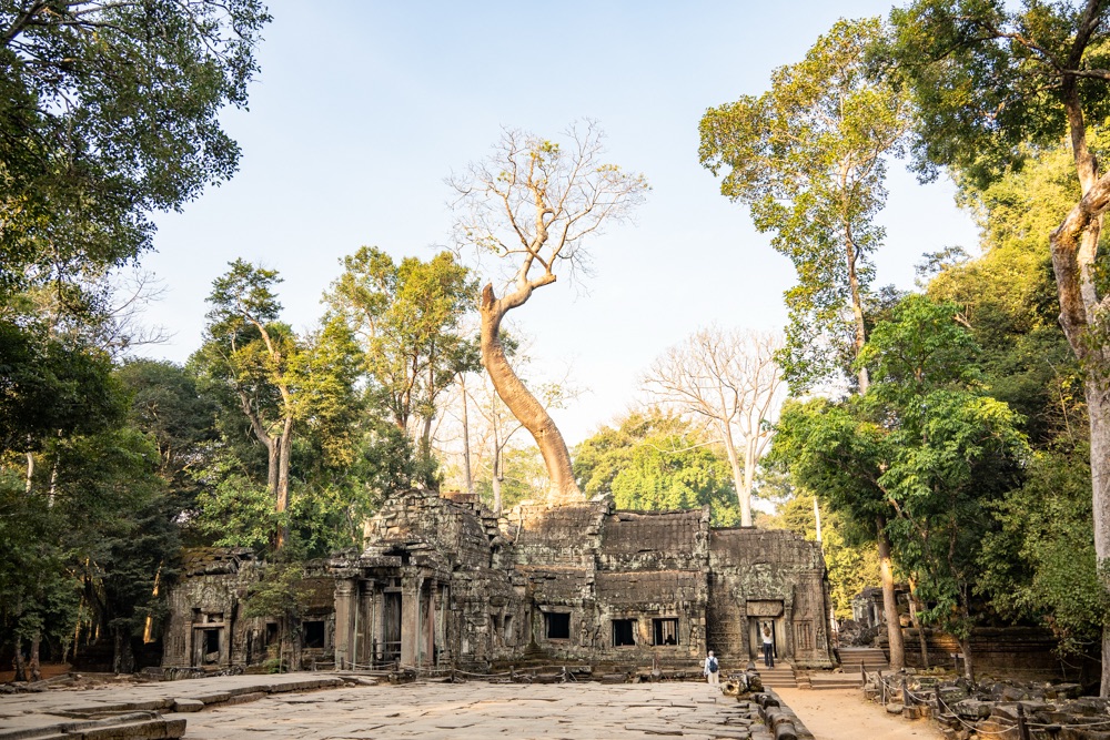 Néhány fotóval később átmentünk a Bandi templomához, Ta Prohmhoz. Nagyon jól alakult, közel sehol senki nem volt, és a reggeli fények is nekünk kedveztek. Tényleg izgalmas a rom templom a dzsungel több száz éves fáinak gyökereivel, amely tekereg és aláfúrja magát a régi épület kövei között, majd hatalmasra nőve rendezi át az ember alkotta dolgokat. Ebben a versenyben egyértelműen a természet győzött, de így együtt gyönyörű.