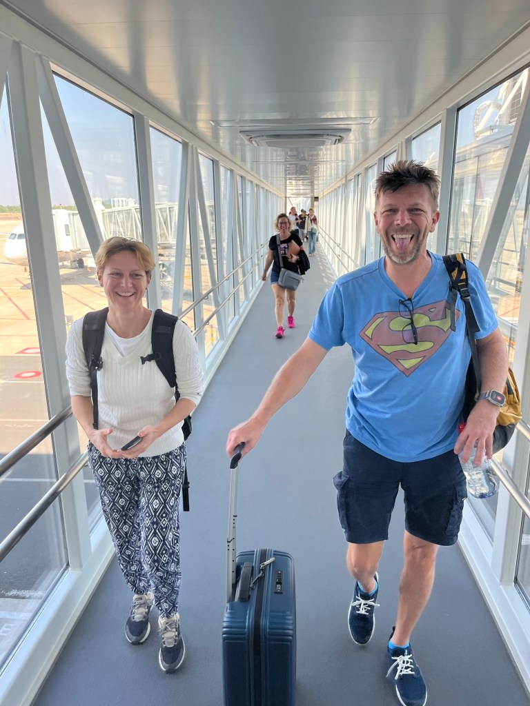 45 percet vártunk, hogy elinduljon a check-in sor, ugyanis nem lehetett online becsekkolni. Majd az útlevél sor, végül a biztonsági ellenőrzés. Mindhárom sor olyan hosszú volt, hogy azt hittük épp csak elérjük a gépet. Ráadásul mindeközben már jó éhesek voltunk, és volt még egy kis helyi pénzünk, amit reggelire terveztünk elkölteni. Futva, de megreggeliztünk a terminálon belül és a kapuhoz is spuriban mentünk, mikor végül kiderült, hogy 30 perces késésben van a gépünk. De aztán  12:00 helyett végül 13:00-kor szálltunk csak fel.