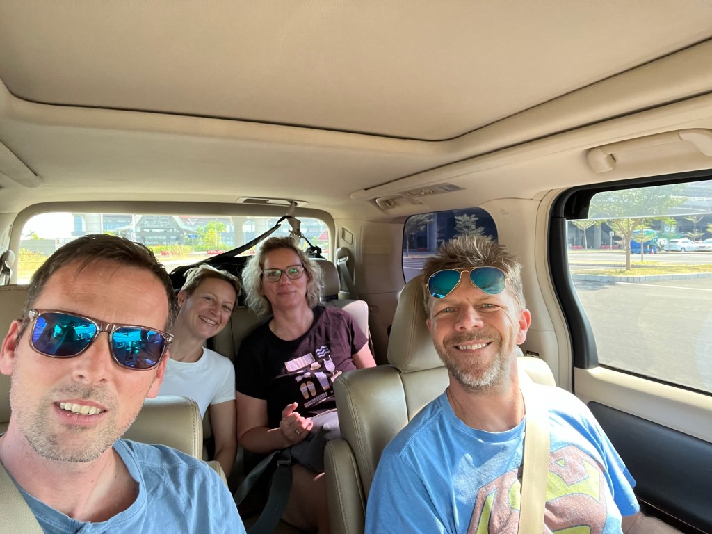 Szingapúrban párás meleg, de esős idő várt minket. Vízum nem kell, de egy e-belépőt mindenkinek ki kell töltenie online a neten előre, hogy aztán az útlevél ellenőrzés flottul menjen. Nem is állt sor, 2 perc alatt kint voltunk, minden digitalizálva van, egy-egy ember van csak segítőként imitt-amott. A bőröndök hamar meg lettek, Bandi meg rendelt egy grabot, amin jelezte, hogy négyen vagyunk és van csomag bőven.