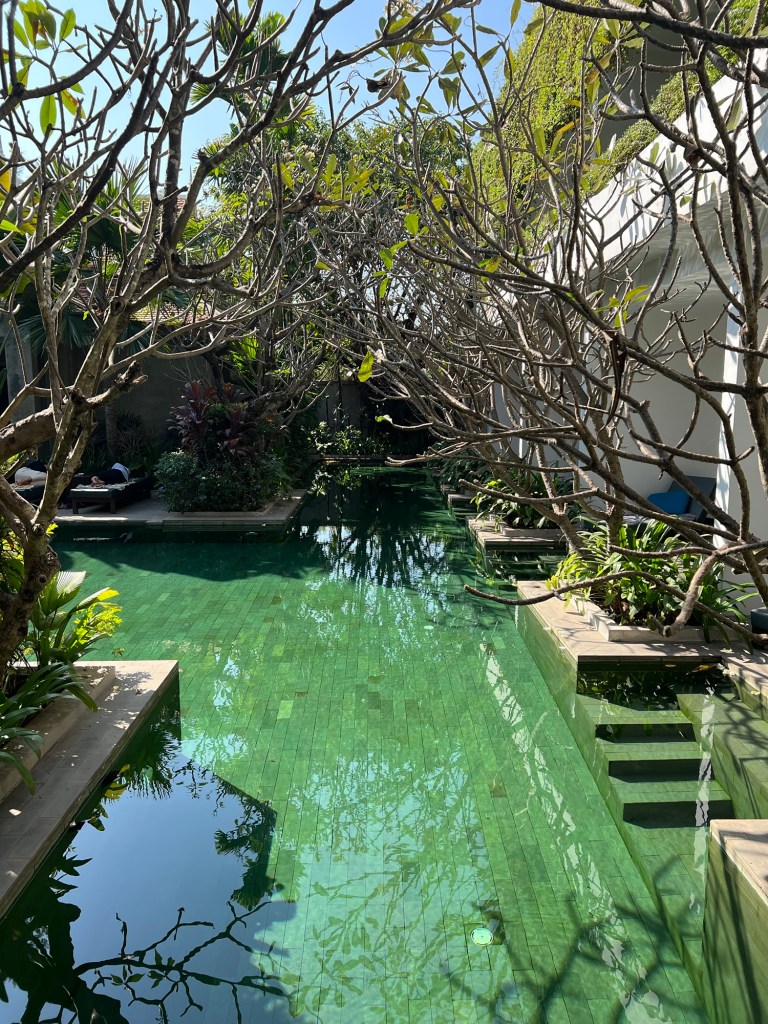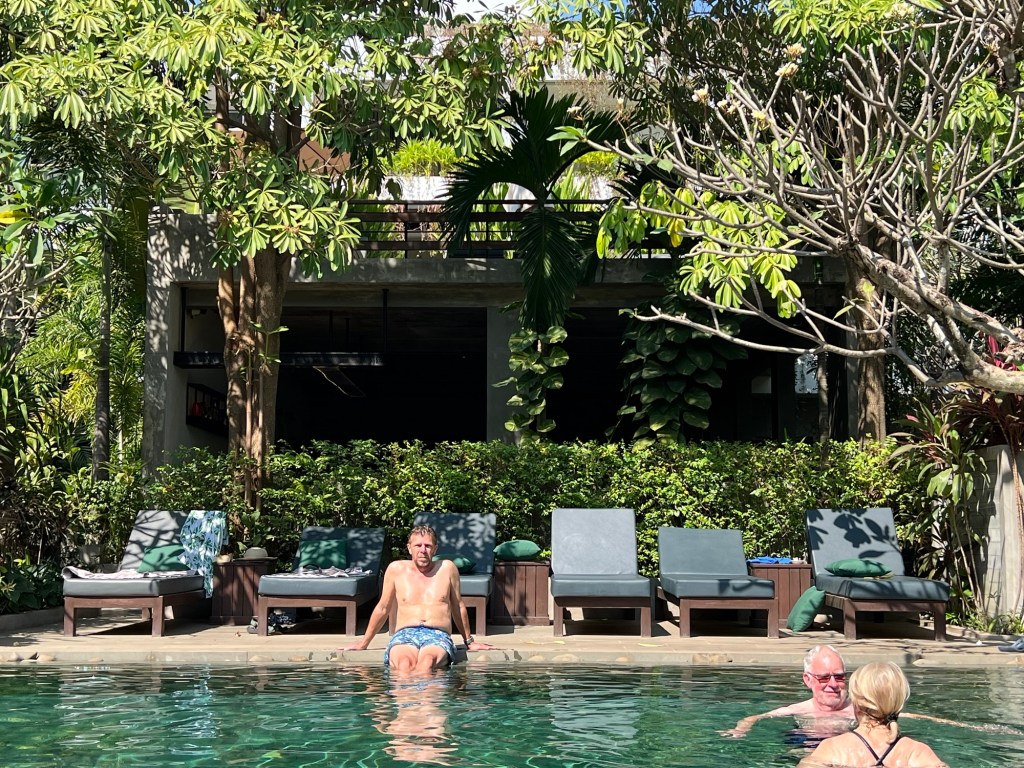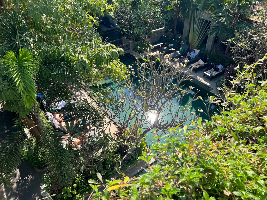 Vasárnap van, az Úr napja, így úgy döntöttünk megpihenünk. Kényelmes 9 órási reggeli után egészen a szálloda medencéjéig merészkedtünk, hogy ott a madarak csicsergése mellett a medence túlfolyójának csobogását élvezzük és ne csináljunk semmit, max olvasással, beszélgetéssel és nézelődéssel töltsük a napot.