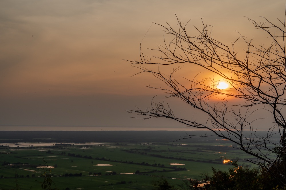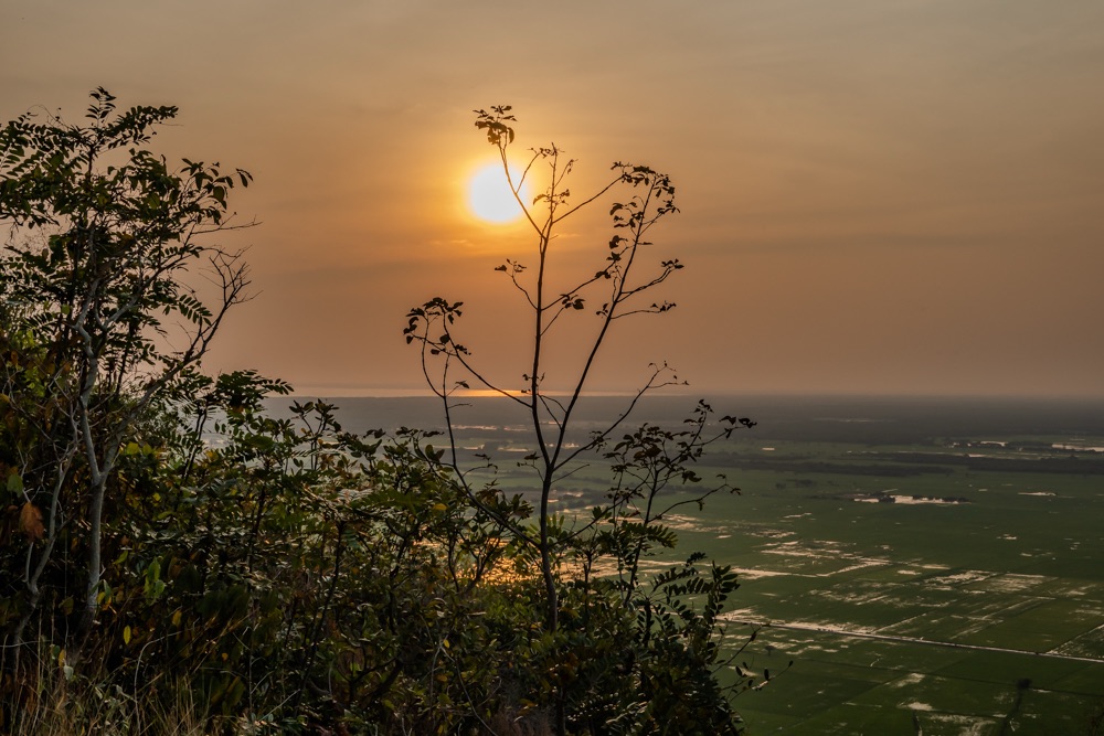 Aztán eljött az én pillanatom és kitaláltuk, hogy elindulunk naplementét nézni. A recepciós kislány javasolt egy kevésbé turistás helyet, a Phnom Krom Templom romot, ami a várostól délre van. A hindu templom a 9. század végén épült, Yasovarman király uralkodása idején Shivanak, Vishnunak és Brahmanak szentelve. Motoros hintóval érkeztünk a városkába, ahonnan még felgyalogoltunk egy hegyre, hogy a minden irányba elterülő végtelen zöld rizsföldekre rálátva, a helyiekkel romantikus naplementés esténk legyen.