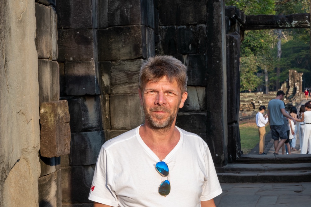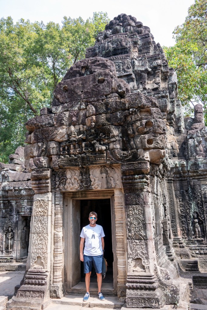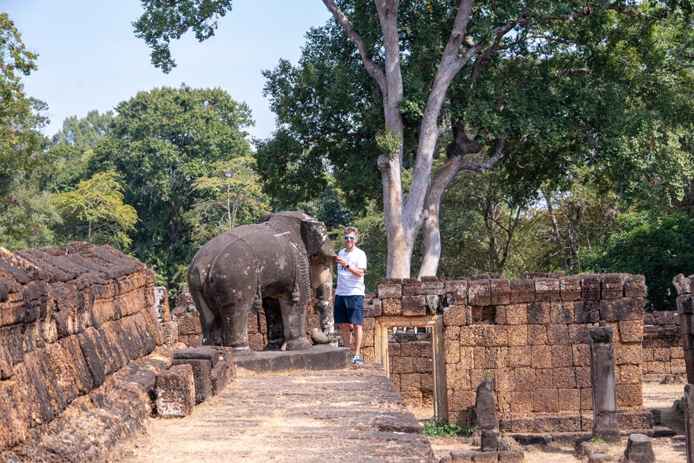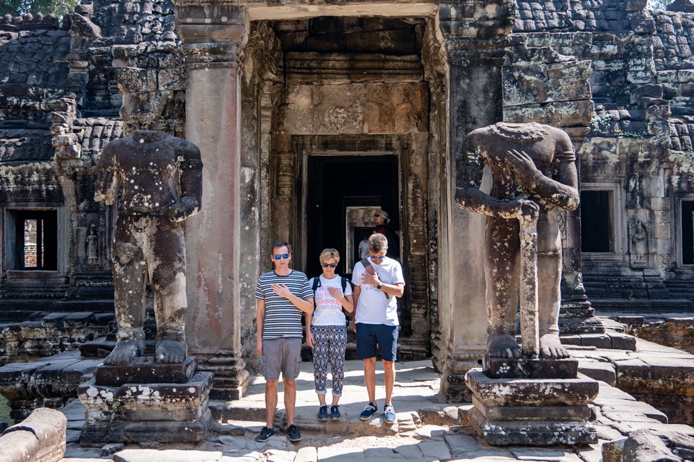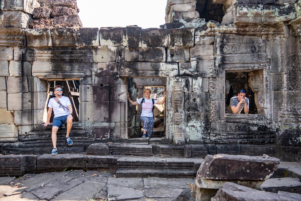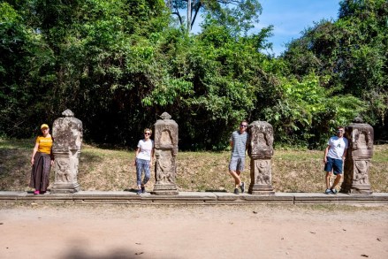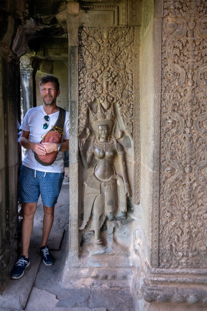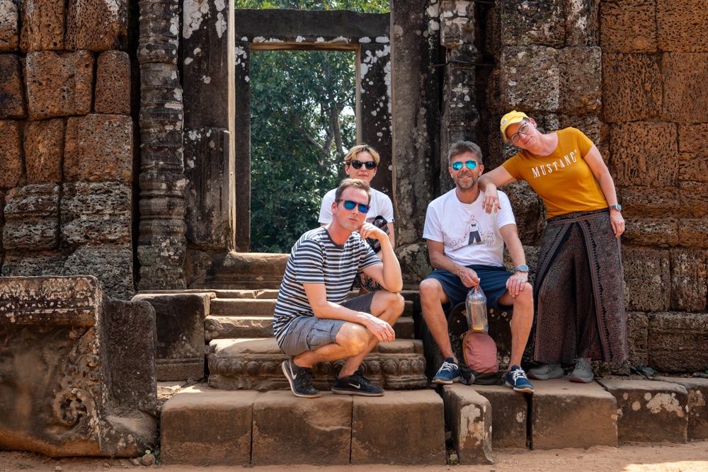 Tegnap megismerkedtünk egy helyi fazonnal, középkorú, erősebb testalkatú, mosolygós férfi. Itt elsősorban nem taxik vannak, hanem motor mögé szerelt “hintók”, avagy tuk-tuk, netán motoros riksa. Őket ugyanúgy lehet online rendelni az ázsiai taxis applikáción keresztül, a grab-on. Az appon rendelsz, ott is fizetsz kártyáról, ha akarsz adni borravalót azt is megteheted a rendszeren keresztül, és értékelheted a sofőrödet is. Pont úgy, mint az Uber app-ben. Emberünk, név szerint Mab, vitt tegnap egy ponton minket (az első templomtól a másodikig) grabon rendelve, majd megállapodtunk vele, hogy inkább megvár minket mindenhol, csak hadd vigyen fixen ő minket. Neki jó, mert van egy fix bevétele, nekünk jó, mert van egy fix emberünk és olcsóbban adta magát mint, ahogy a hotelünk kínál ilyen szolgáltatást. Nagyon sok a sofőr, valószínűleg ez nekik egy sokkal jobb megoldás, mint app-on keresztül egy-egy apró fuvar. Így aztán tegnap megnyert minket egész napra, és nagyon igyekezett, hogy mára is hadd legyen ő a mi emberünk. Telefonszámot cseréltünk, és a nap végén megállapodtunk vele, hogy ma 10 órára értünk jön. Mab tökéletesen pontos volt, és elvitt minket az Angkor-i nagy körre az előre megbeszélt fix áron. Öt templom volt betervezve, kicsit távolabb a többitől. Ahogy haladtunk az elsőhöz elhajtottunk a tegnapi utolsó templom előtt, ahol elég rendesen volt turista mennyiség. Tulajdonképpen tegnap egy templomnál volt csak “tömeg”, így ezt nagyon jó aránynak tartjuk.