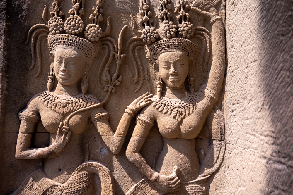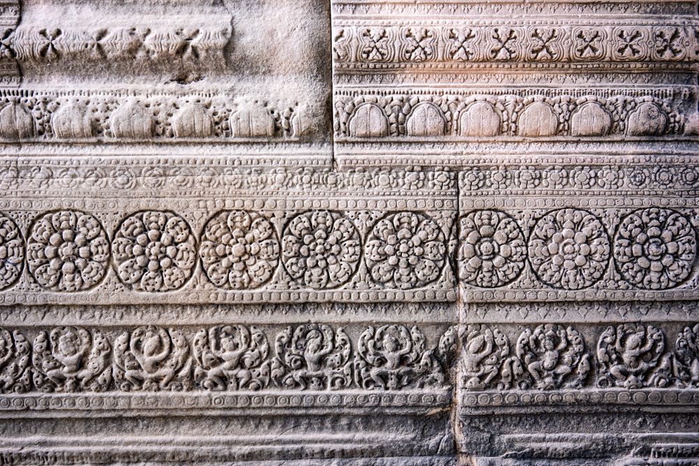 1, Angkor Wat: Angkor Wat a világ legnagyobb vallási célú épülete, mely feltehetően 50 000 munkás, 5000 szobrász és kőfaragó harminc évi munkájával készült el. Angkor Wat a khmer kultúra, művészetek aranykorának minden kincsében bővelkedik. II. Szurjavarmant a hinduizmusban gyökerező hit vezérelte Angkor Wat megépítésében, hogy majd halála után Visnu istenhez térhessen meg. Angkor Wat minden külső és belső építménye a hindu vallás szimbólumaira utal. II.Szurjavarman király halála után a templom hamar romlásnak indult, mind a természet, mind pedig az emberi rongálás nyomait láthatjuk rajta. 1177-ben Angkort megszállták és megrongálták a vietnámi csamok, így ekkor a fővárost is odébb helyezték egy másik templomban és a buddhista vallásra tértek át.