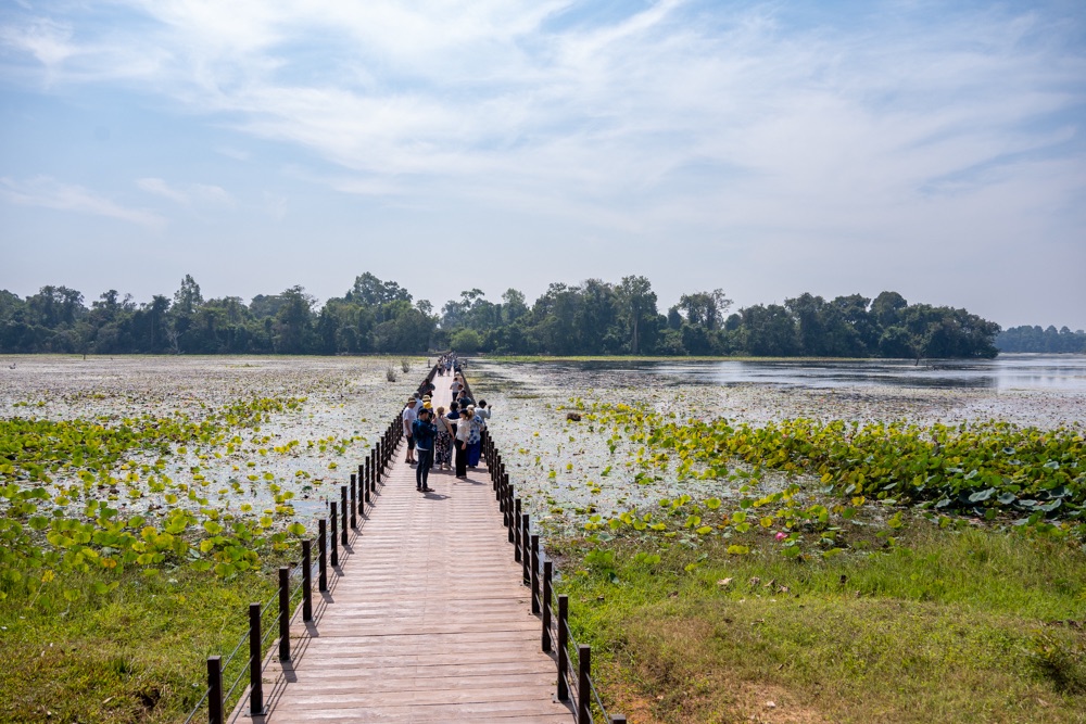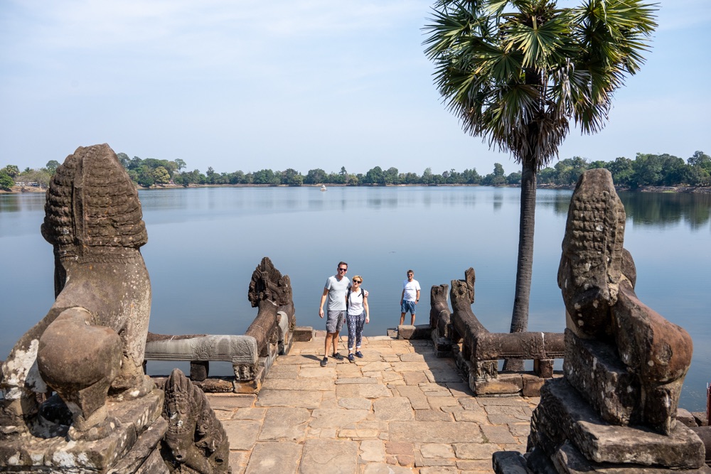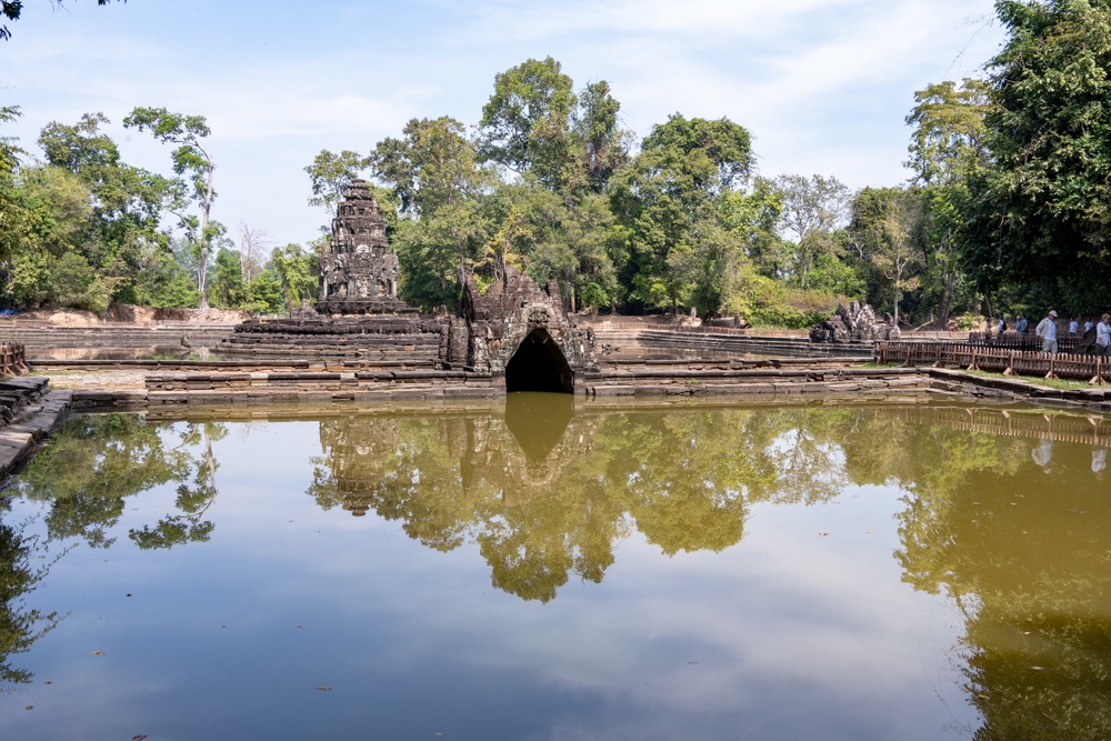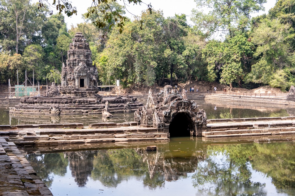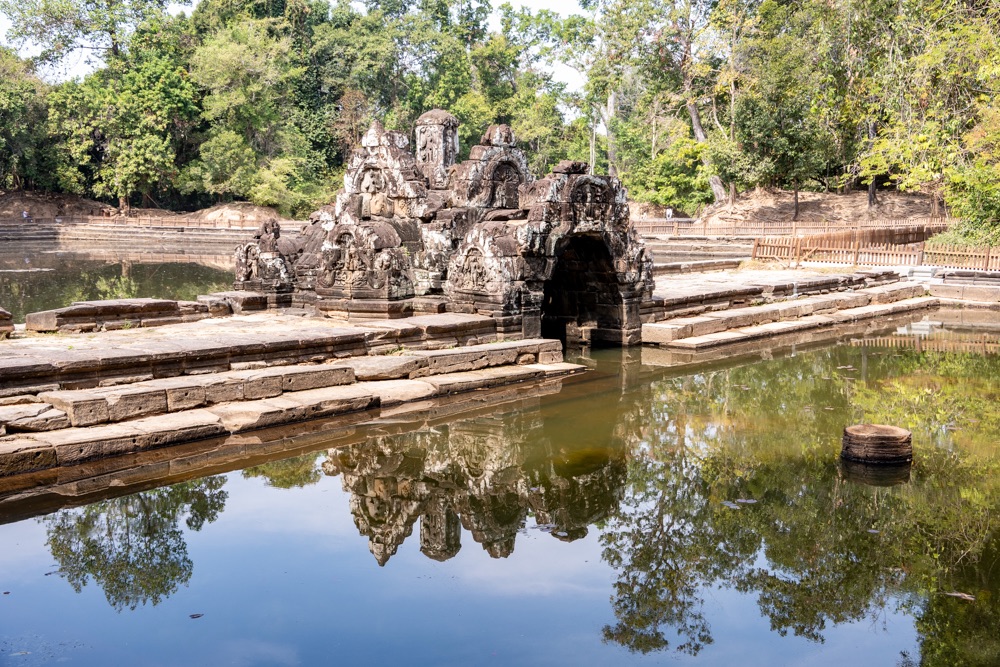 2: Neak Pean: buddhista templom, amely VII. Dzsajavarman király víztározó medencéje közepén, egy mesterséges szigeten áll. A 12. század végén épült „forrás templom” eredetileg orvosi, gyógyító célokra készült. A központi medencéhez kapcsolódó négy kisebb medence a négy őselem: a víz, a föld, a tűz és szél kifejeződése. Ezek közepén egy-egy szimbolikus vízforrás, elefánt-, ember-, oroszlán- és lófejet formázó szökőkutak, vízköpők álltak és táplálták a szentély központi medencéjét. Jelenleg a lófej egyedül, ami olyan állapotban van, hogy látható és felismerhető. A hitvilág szerint a medencében való megmártózás során az elemek betegséget okozó, megbomlott egyensúlya helyreáll, és a test bajai elmúlnak.