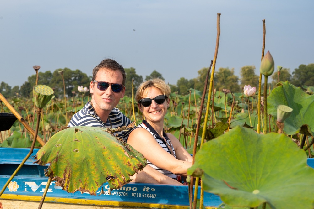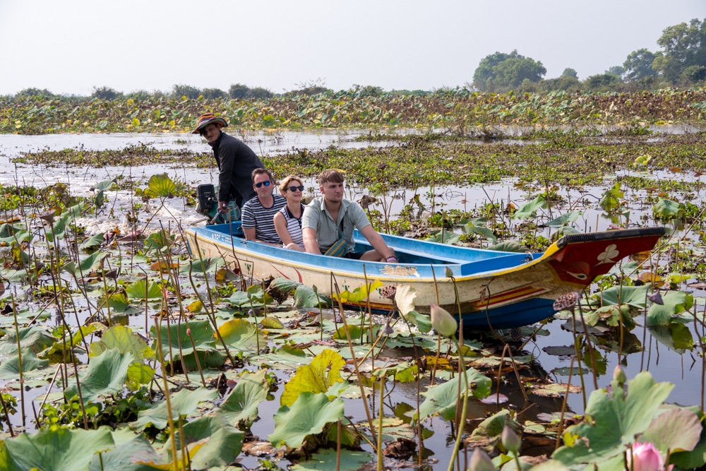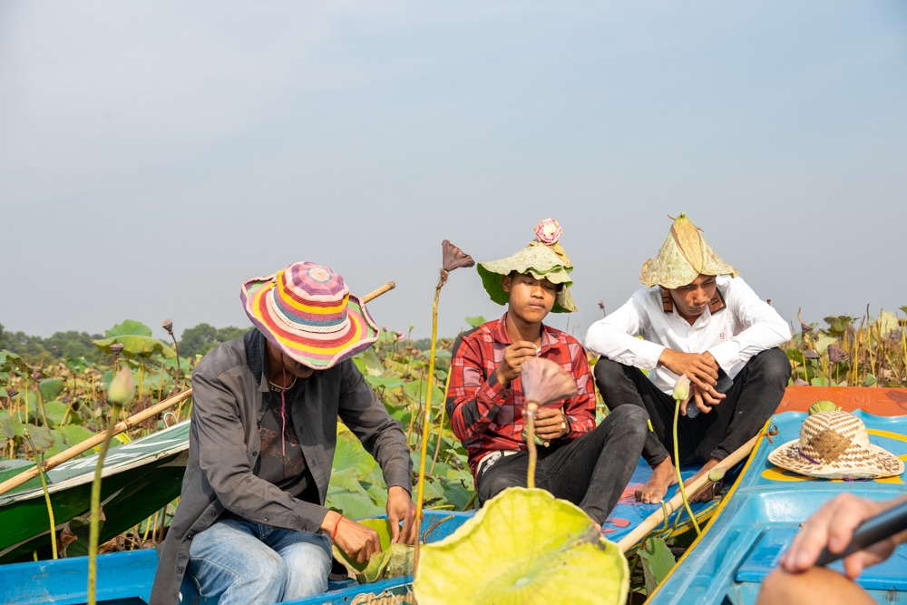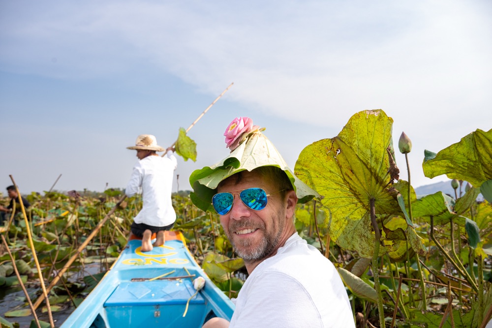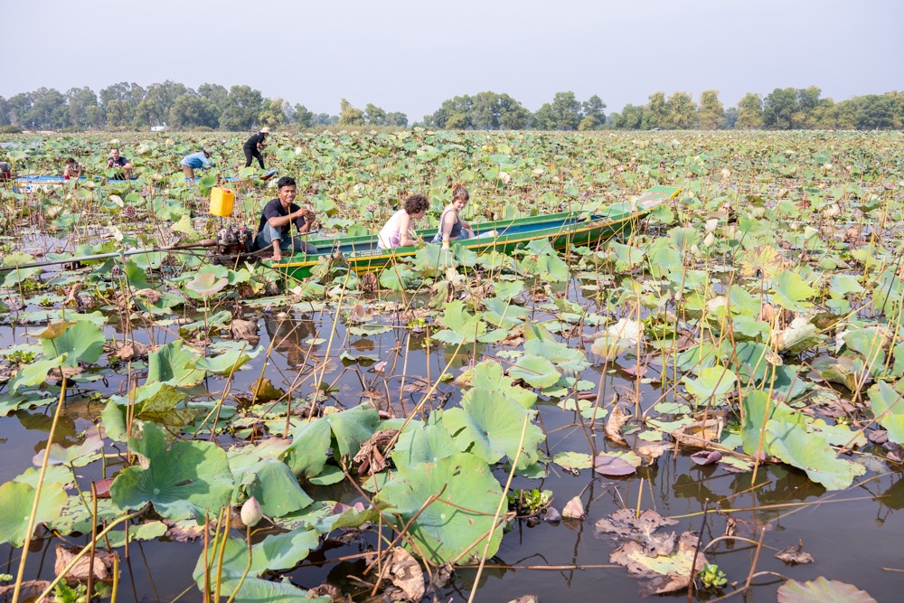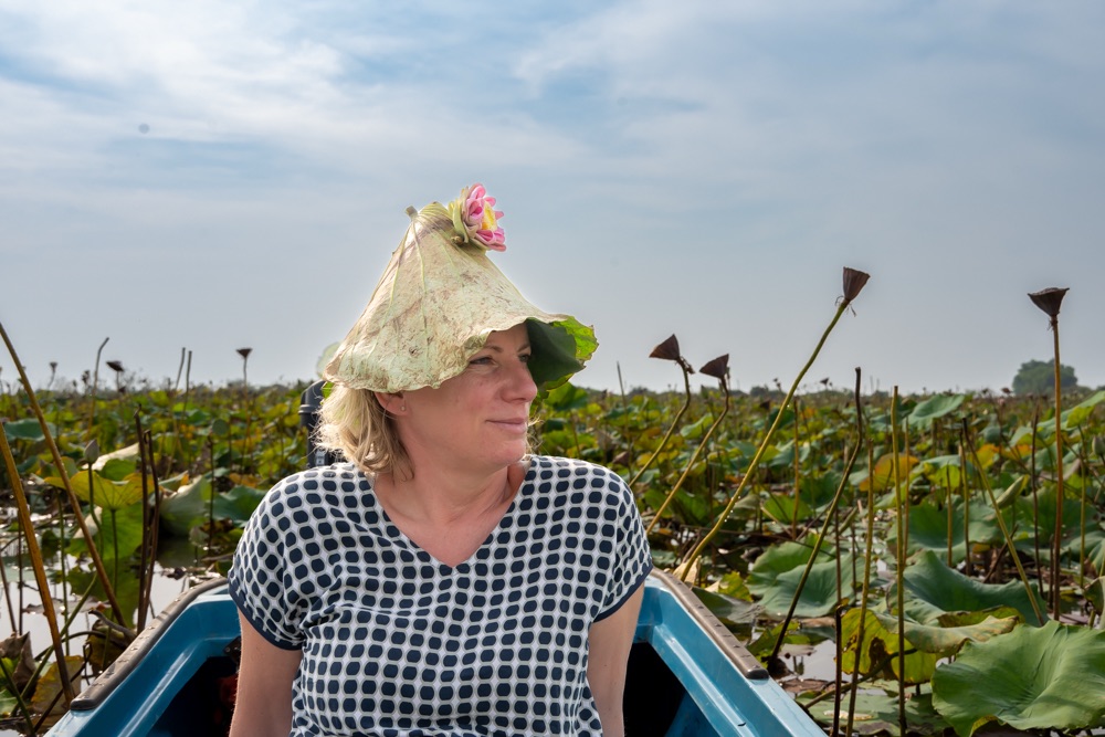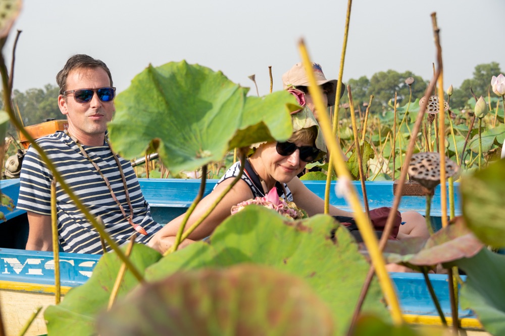 A térkép szerint szárazföldön voltunk, de az életben másfél-két méter mély vízzel borított terület volt, amin lótusz virágok hada úszott a víz tetején. A helyi srácok kivittek minket a virágok közé, szedtek nekünk virágot, kötöttek belőle csokrot, majd a virág leveléből még kalap is készült. Aranyos program volt, de azért ár-érték arányban röhejes.