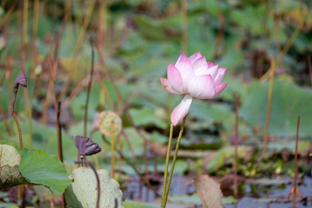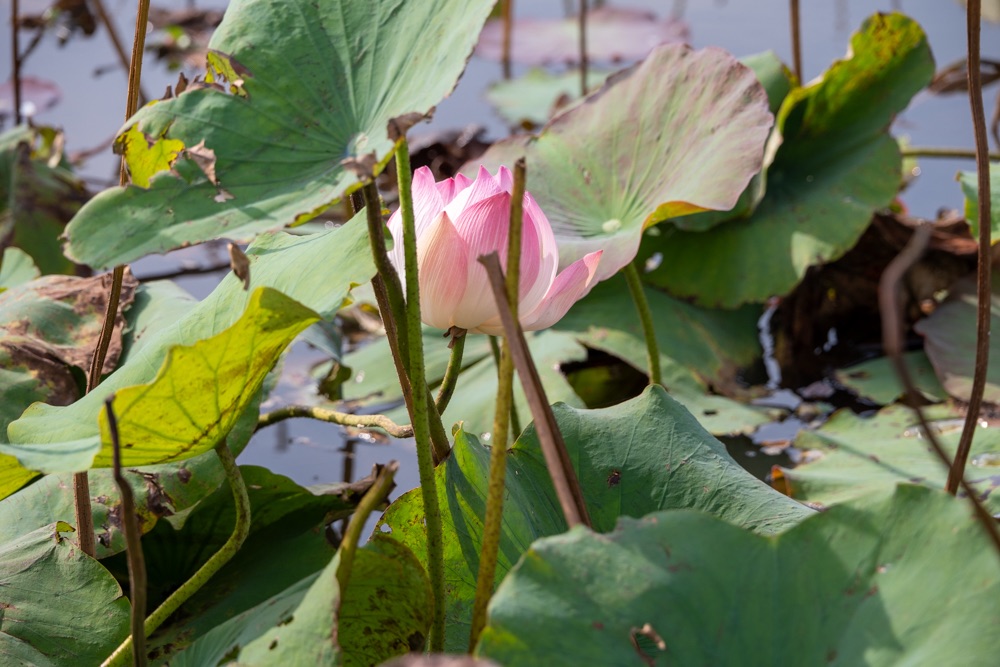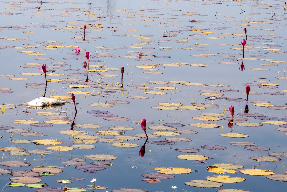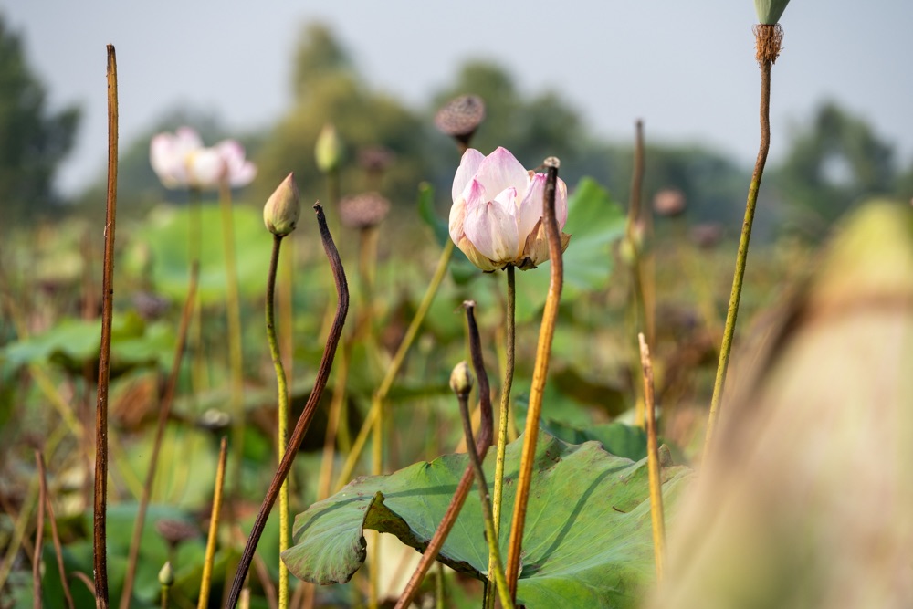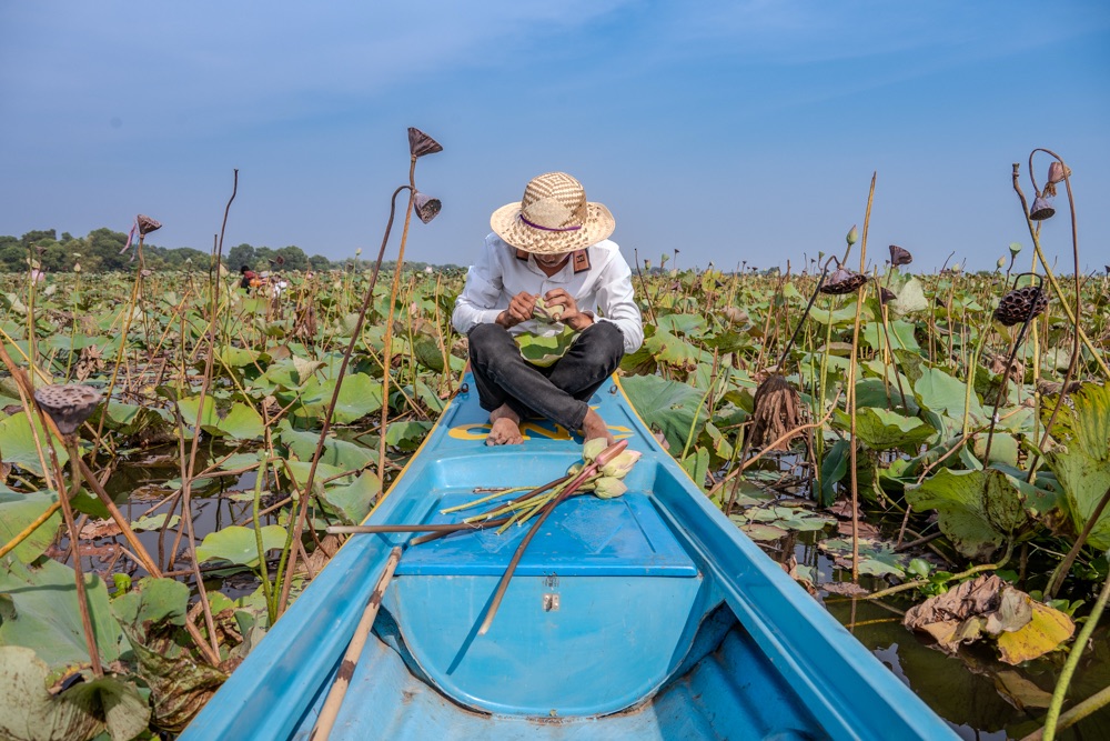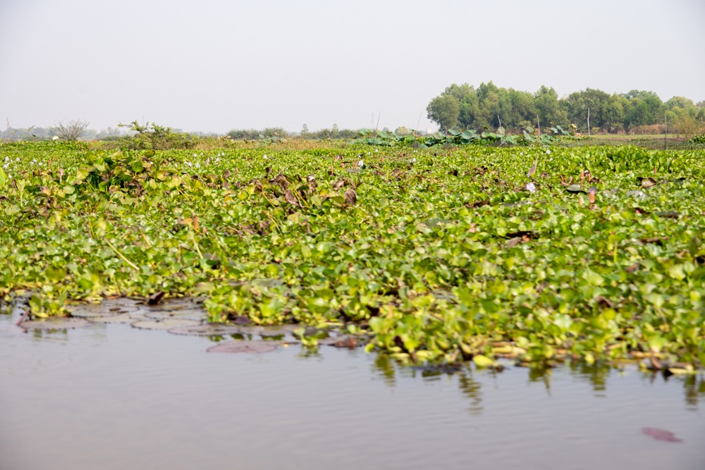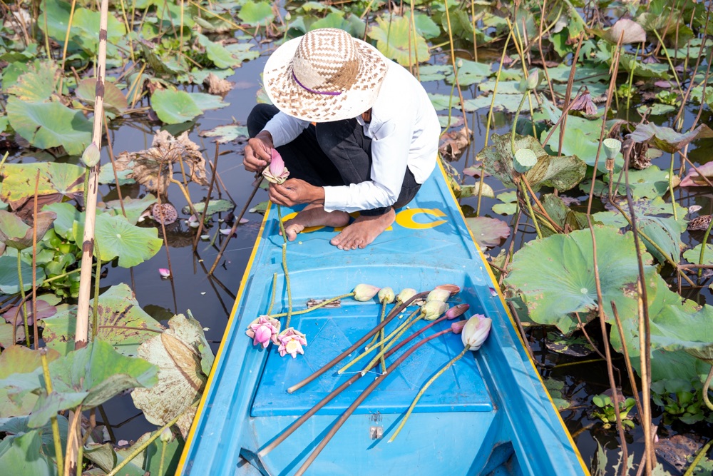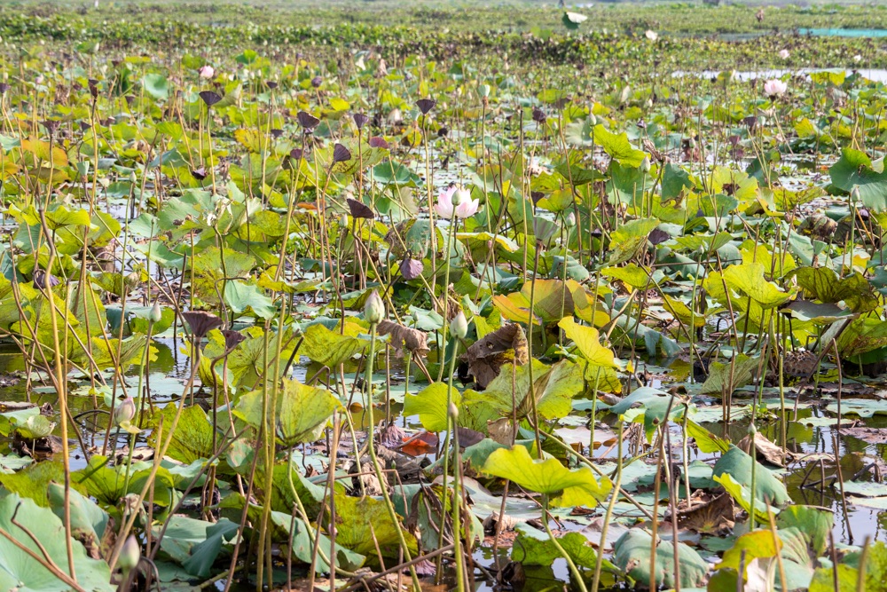 A térkép szerint szárazföldön voltunk, de az életben másfél-két méter mély vízzel borított terület volt, amin lótusz virágok hada úszott a víz tetején. A helyi srácok kivittek minket a virágok közé, szedtek nekünk virágot, kötöttek belőle csokrot, majd a virág leveléből még kalap is készült. Aranyos program volt, de azért ár-érték arányban röhejes.