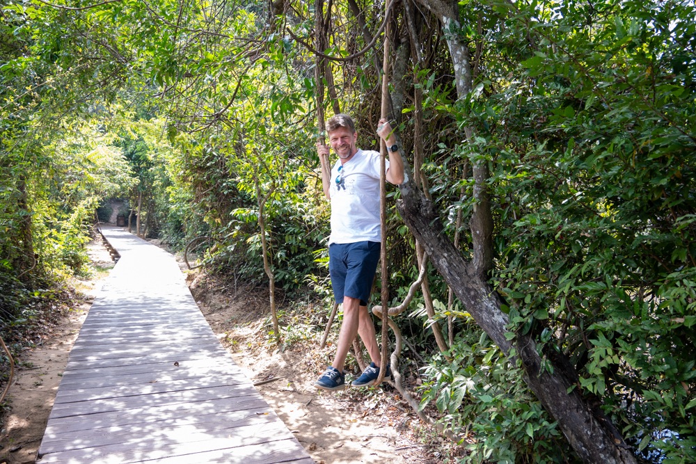 4, Ta Prohm Templom: a templom VII. Dzsajavarman király megbízására épült a 12 század végén, édesanyja emlékére. Ta Prohm az angkori templomegyüttes kedvelt látványossága, mert a régészek sok tekintetben abban az állapotban hagyták, ahogyan a franciák felfedezték az őserdő mélyén az 1860-as évek legelején. A dzsungel közepén, a fák fogságában magányosan álló Ta Prohmot az örökkévalóság aurája lengi körül. Bandinak abszolút ez volt a kedvence, mert a fák ezalatt a több száz év alatt  nagyon izgalmassá tették a helyet. Utólag a képeket visszanézve, látom mi fogta meg Bandit, de ez a templom annyira népszerű, és talán nem is jó időpontban voltunk ott, hogy nyomasztóan sok turista volt rajtunk kívül. Én konkrétan menekültem kifelé minél előbb átfutva a helyen. Lehet ide még visszajövünk egy reggeli időpontban…