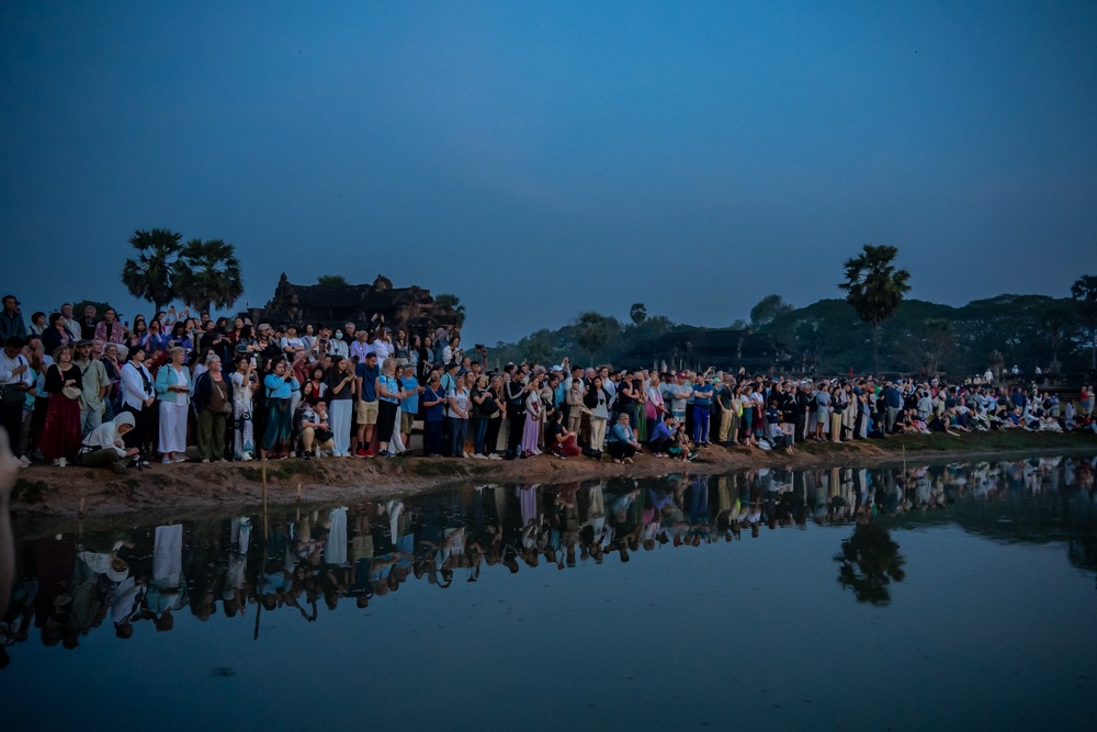 Mint a birkák álltunk (néhányan az első sorban guggoltak) szorosan egymás mellett ott a korom sötét ég alatt, ahol a Hold is csak éppen pislákolt, várva a világosságot, mint valami Messiást. Ezeket a pillanatokat mindig olyan abszurdnak érzem. Aztán szépen lassan a sötétséget elkezdte felváltani a világosság, apránként felsejlett az előttünk álló csoda tükröződve az aprócska tóban, ami előtt várakoztunk. Fél hétre kivilágosodott, amit a várakozó tömeg megtapsolt.