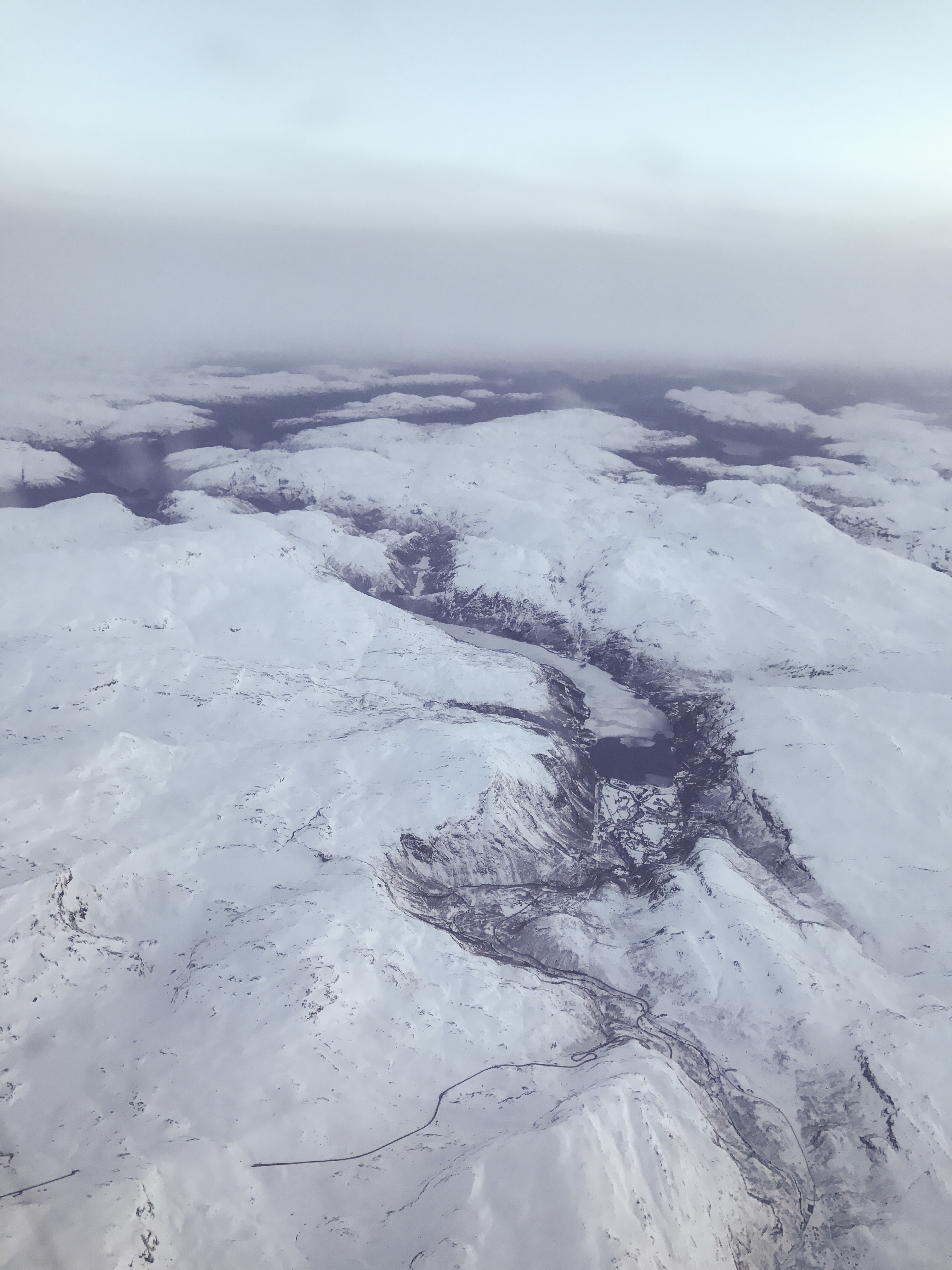Szóval a gép tök tele volt. De jó helyen ültünk, második sorban középen (vagyis nem az ablak mellett). 9 óra előtt kicsivel mikor már ereszkedett a gép Bandi kérdezi, hogy látok-e valamit. Még csak kezdeti szürkületben voltunk, lopva kinéztem a mellettem ülő srácon keresztül, majd hanyagul közöltem, hogy minden felhő alattunk. Vagy mégse?!?! Valami olyan fura volt… Újra kinéztem kissé közelebb húzódva a sráchoz, mire látom, hogy ez nem felhő, de fehér. És igen, minden fehér.