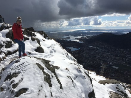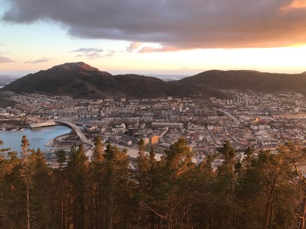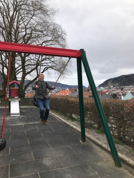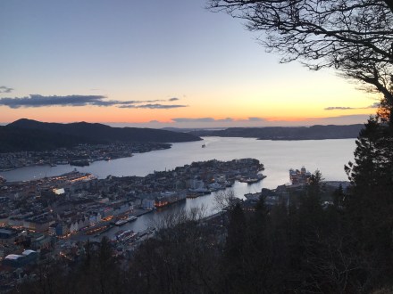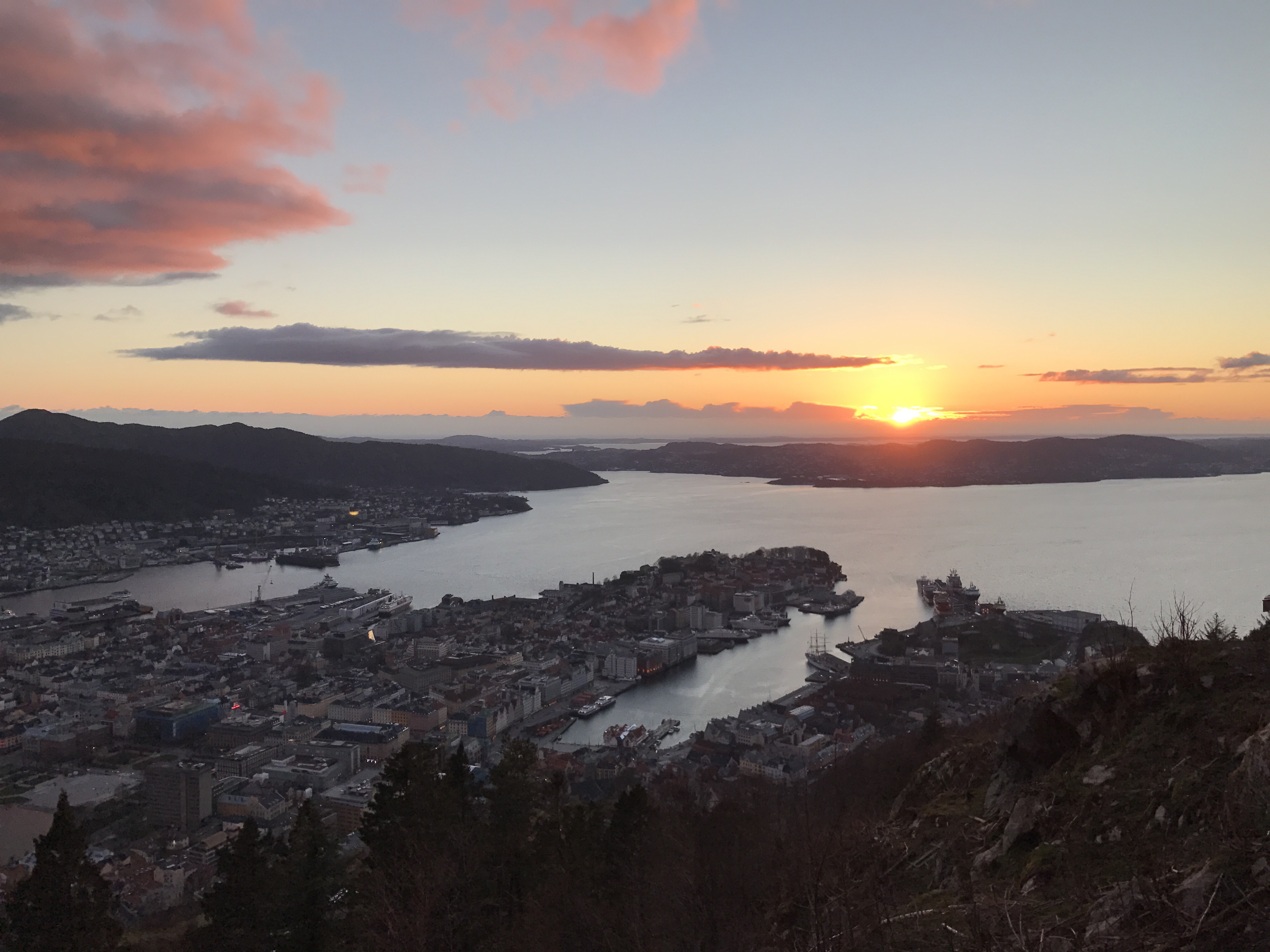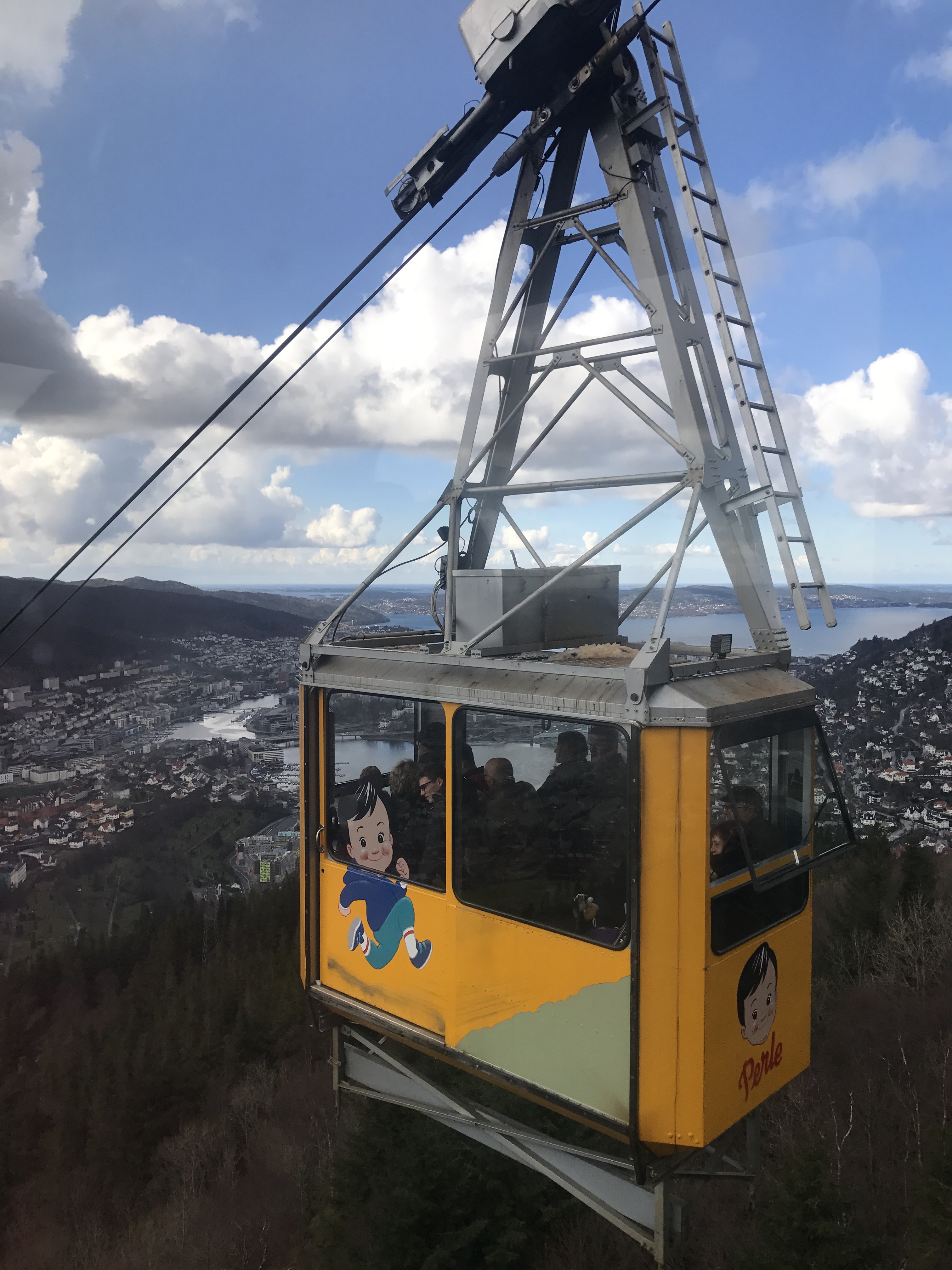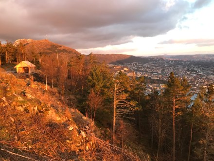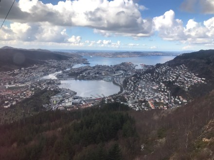 Amikor a Bandi keresgélte a fjord túrát a neten, akkor talált egy egynapos túrát is, ami a vasútállomásról indul. Arra gondoltunk, hogy ezek után hétfőn elmehetnénk erre az egész napos útra, hiszen a repülő csak este f10-kor indul haza. Kisétáltunk a vasútállomásra, csak hogy felmérjük merre van, mennyi idő gyalog és hogy egyáltalán húsvét hétfőn van e ez az út. Mikor mindent megtudtunk, akkor szúrtuk ki, hogy van egy messzebb, a város szélén lévő hegy is, ahova szintén visz fel felvonó. Buszra pattantunk és elmentünk oda. Csudi szép napsütés volt, így igazán szép volt a városra a kilátás.
