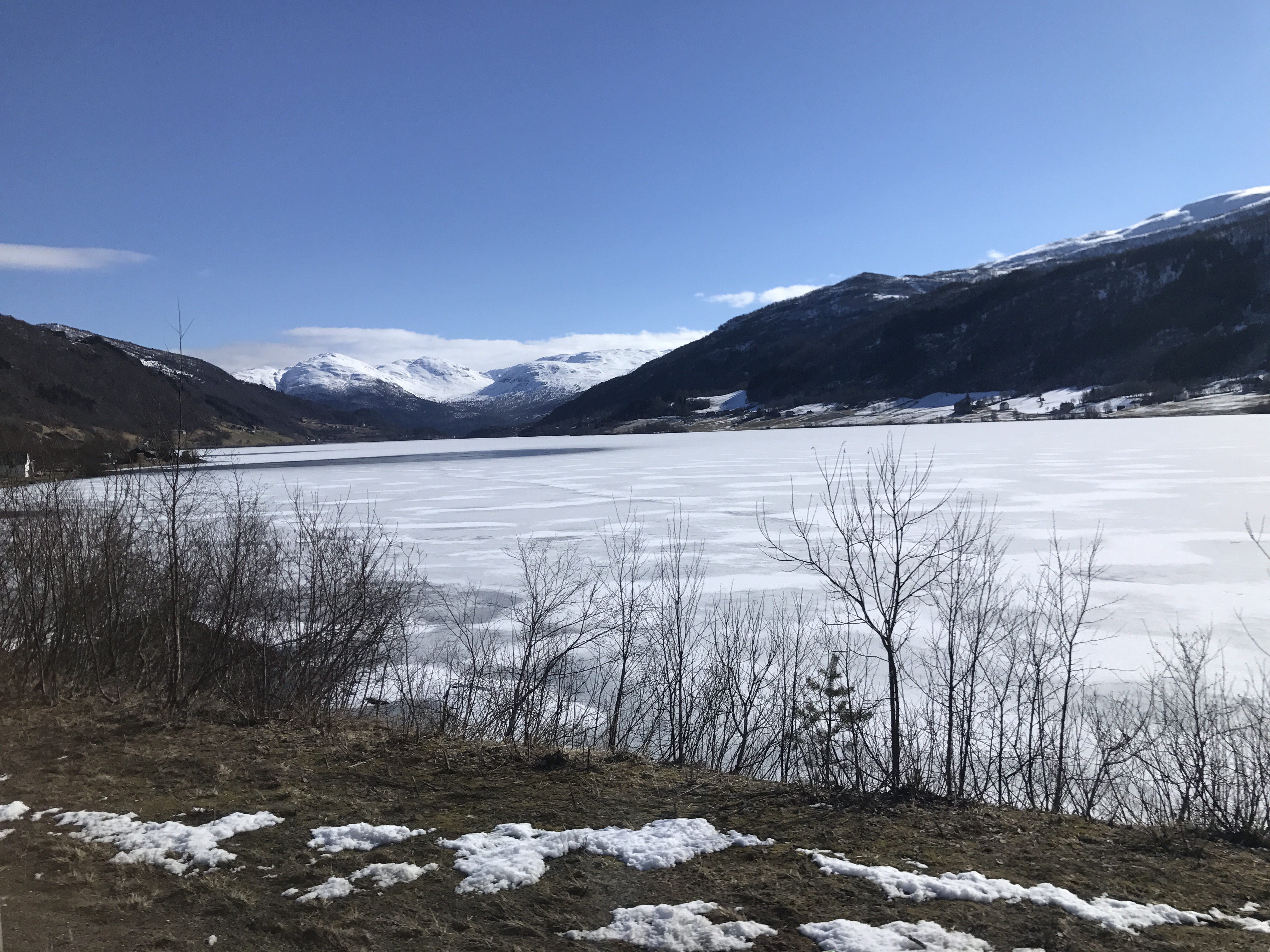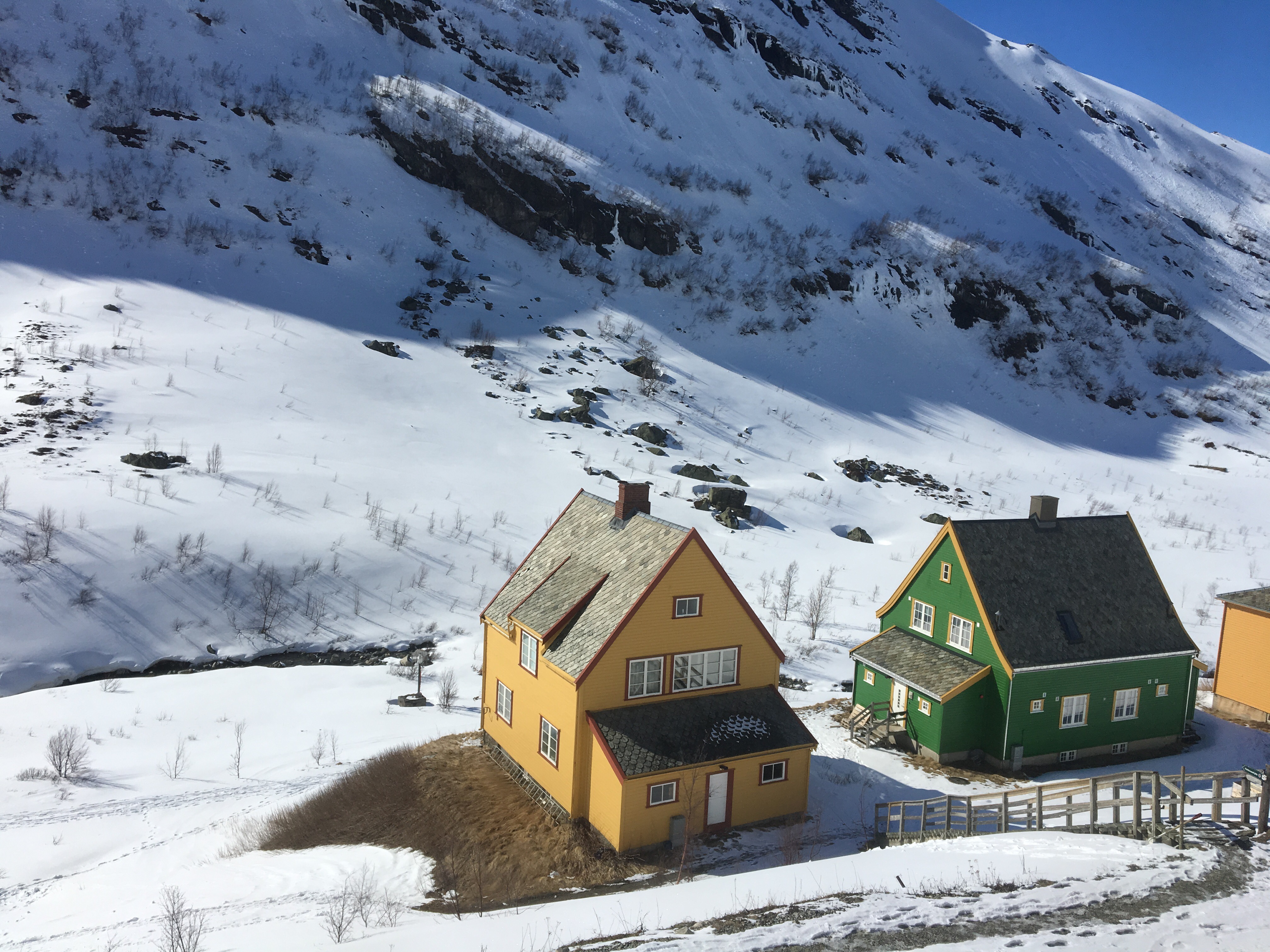 Vossból busszal mentünk egy óra hosszat gyönyörű hófedte hegyek és színes faházas kis falvak között, ahol az út mentén vagy folyó vagy befagyott tó színezte tovább a tájat. Gudvangenben állt meg a busz, ahol volt egy óránk a tájban gyönyörködni, fotózni, enni-inni, pisilni, pénzt költeni.