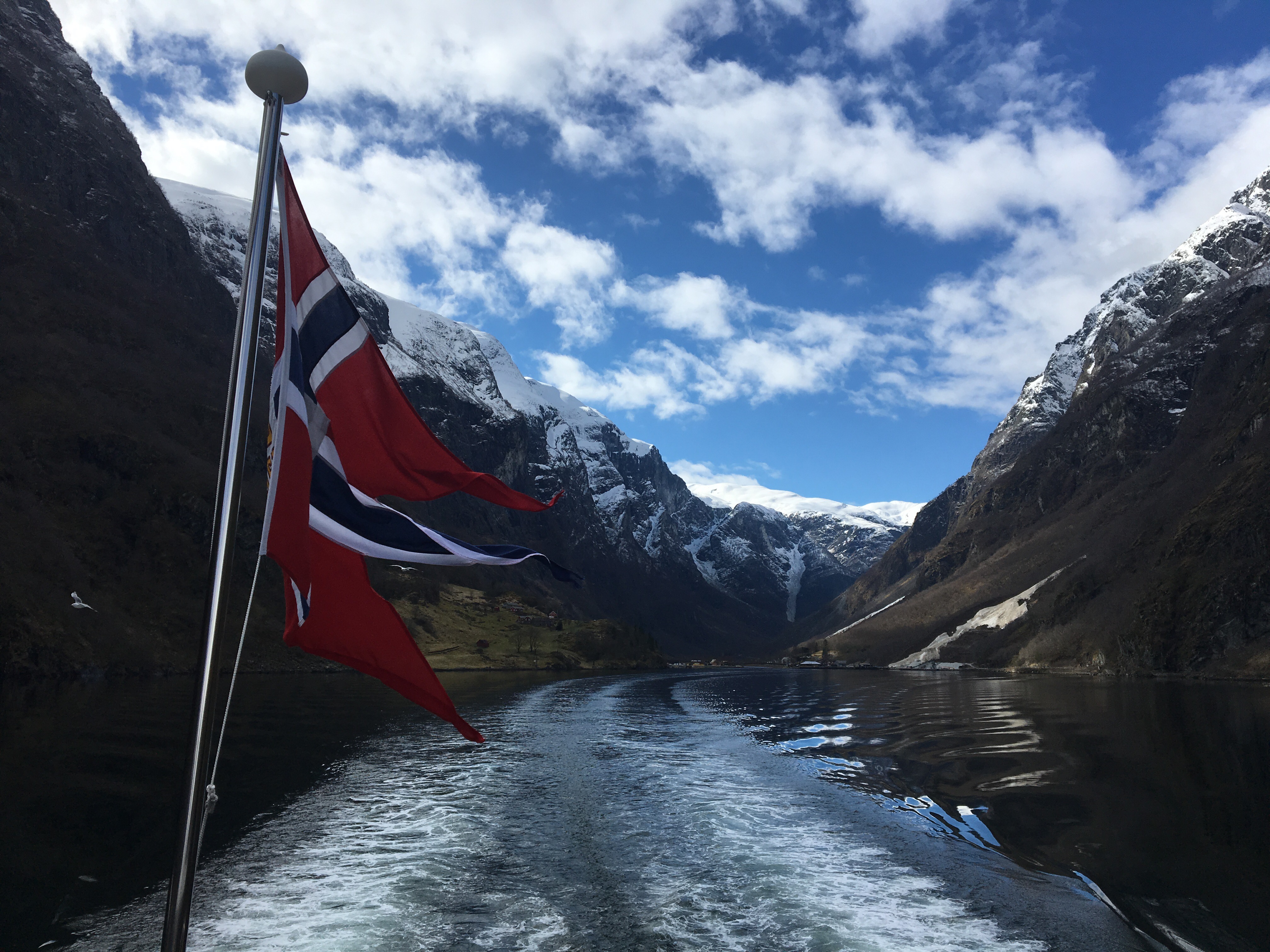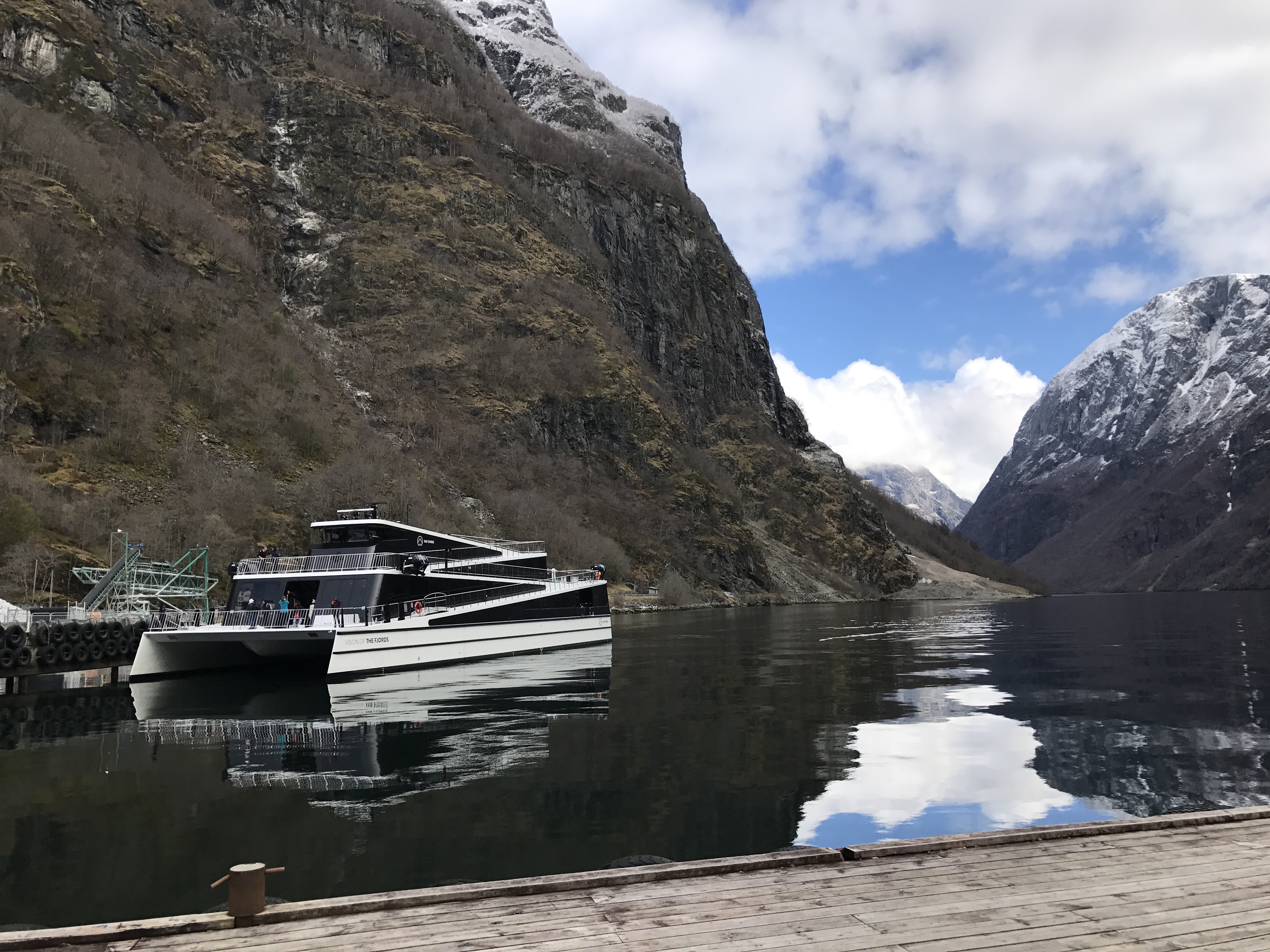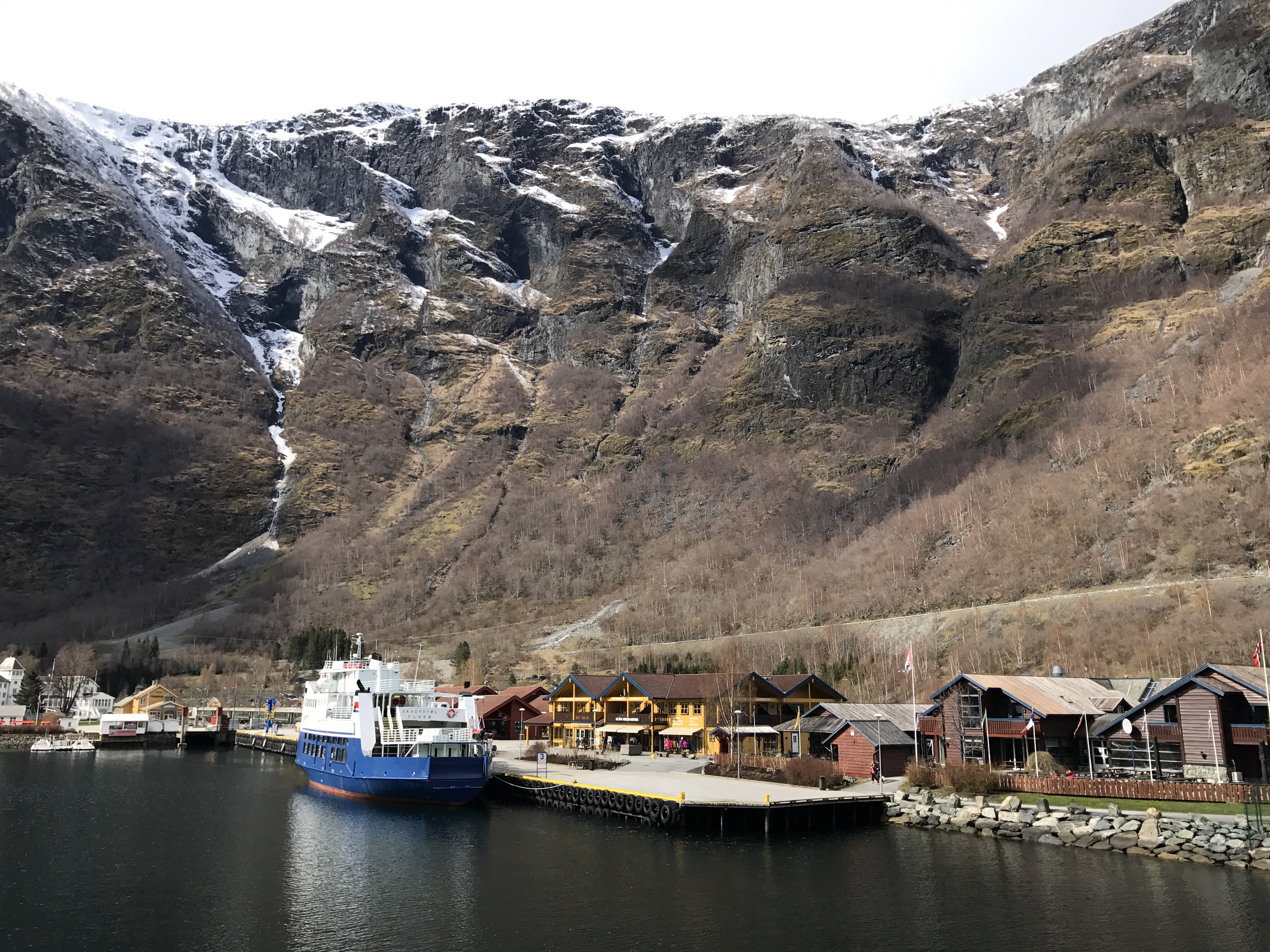 Gudvangenből egy nagy hajóval indultunk tovább déli 12-kor. A hajó Nærøyfjord-on és az Aurlandsfjordon át vitt minket 2 óra alatt el Flåm városkába.
