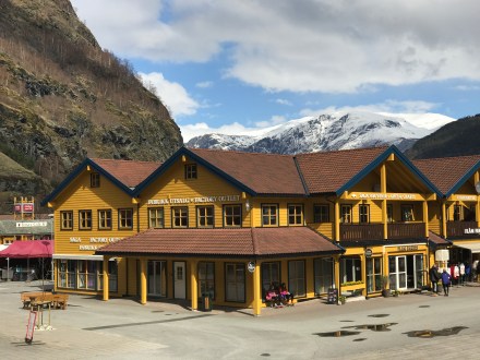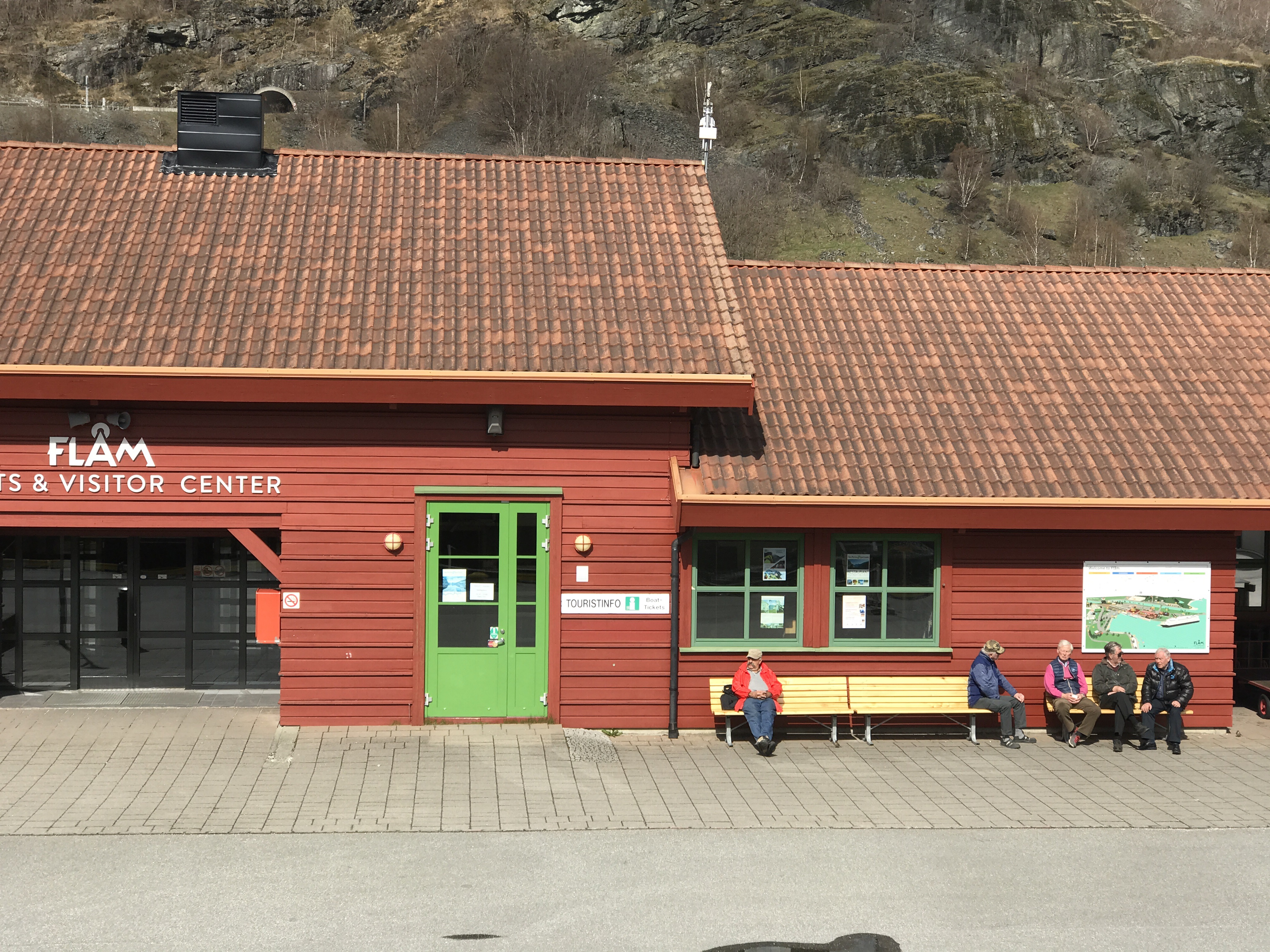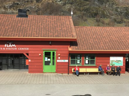 Flåm nagyon pici. Aggódtunk, hogy csak 40 percünk lesz ott, és majd tuti kevés lesz. Mivel ezen utazók tartják életben a várost, így ajándék bolt, norvégmintás pulóver bolt és kajálda van. Mi ettünk a hajón és norvégmintás pulóverre se vágytunk, így hamar bejártuk a “várost”. Gyönyörűen sütött a nap, egy szavunk se lehet az időjárásra.
