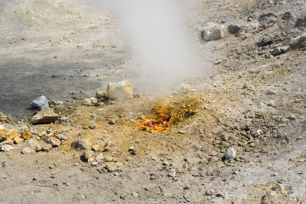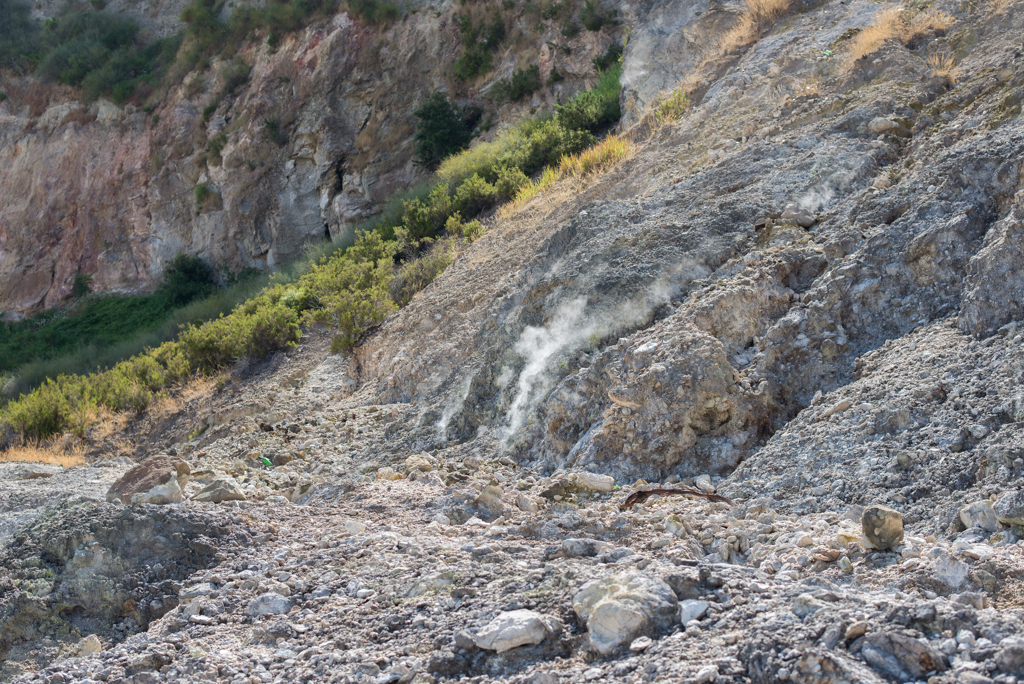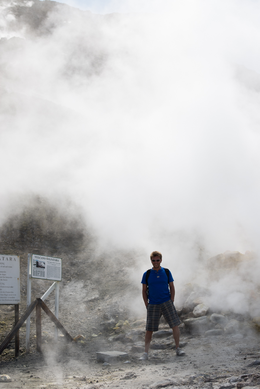 Első utunk Vulcano Solfatara-ra vezetett, ami a szállásunktól csak 3 km-re volt. Ez a Vezúvnak egy mellékága, amely 160 fokos gőzt ereget félelmetesen erős kén szaggal. Jó volt, mert nem volt sok turista, és kellőképp közel lehetett menni.