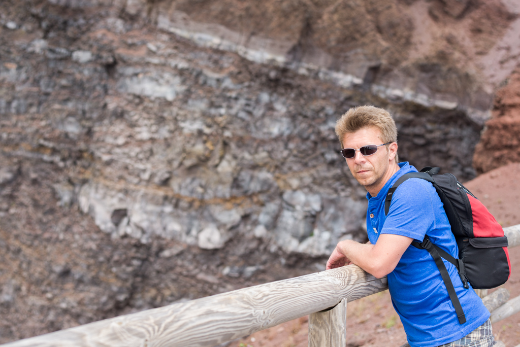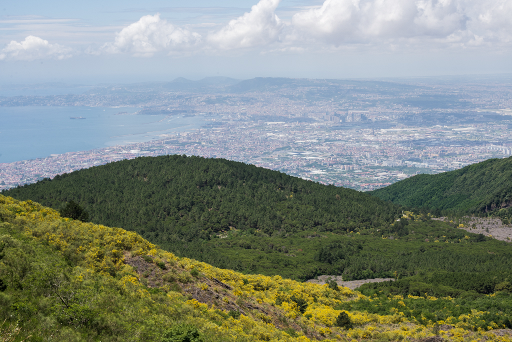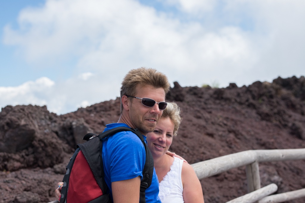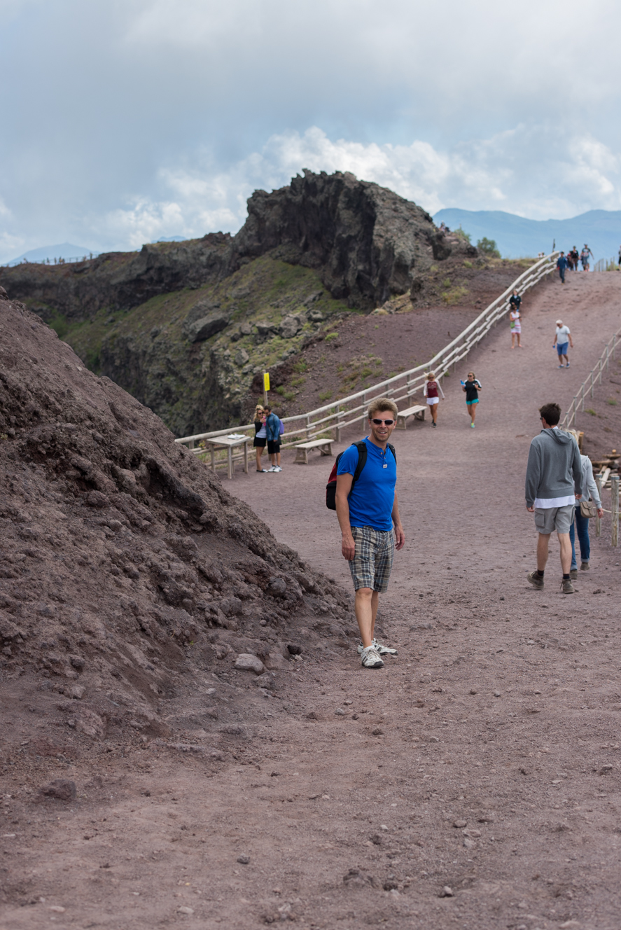 És ha már vulkán napot tartunk, akkor a Vezúvval folytattuk. Jó kis szerpentines úton fel egy kicsit magasabbra mint 1000 méter, onnan pedig még egy 264 méteres szintkülönbséget kellett leküzdjünk gyalog egy másfél kilométeres túrával. A Vezúv eredetileg 2300 méter magas volt, de az i.sz.-i 79-es nagy kitörése után ennek már csak a maradványait láthatjuk, aminek közepe 200 méter mély és 1500 méter kerületű kráter lett. Ahhoz képest hogy július közepe van, nem volt vészesen sok a turista.