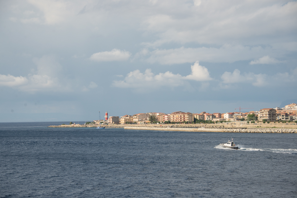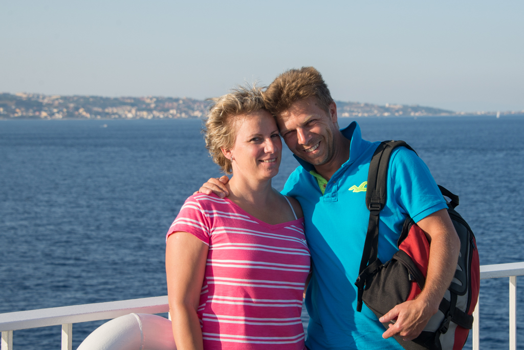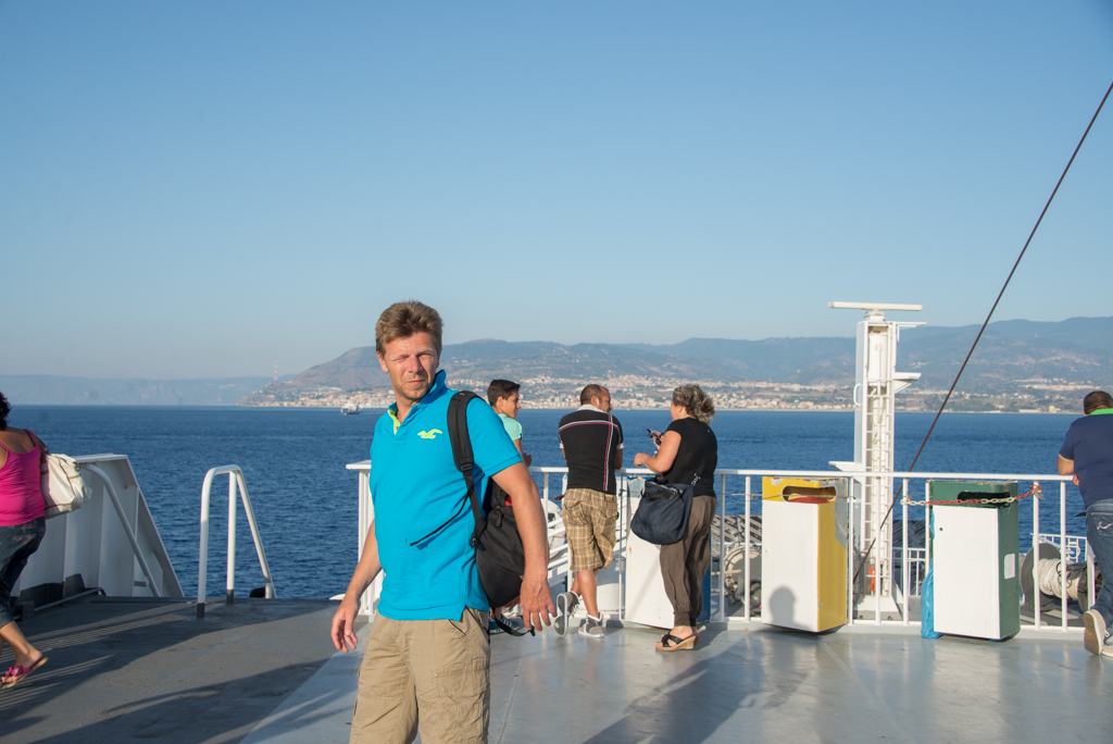 Innen irányba raktuk magunkat, már az autópálya is kitisztult, és igyekeztünk a komphoz. Tudtuk, hogy 40 percenként jár, a jegyünk már meg volt (Szicíliába menet oda-vissza jegyet vettünk). A kompos városban, Messinában nem volt túl jól kitáblázva, hogy merre is kellene menjünk a komphoz, és a GPS is rossz irányba küldött minket. Mire visszafordultunk, és a komp kiindulási pontjához értünk, addigra két perc volt már csak a komp menetrendszerinti indulásáig. Már biztosak voltunk benne, hogy csak a következővel mehetünk. De az első meglepetés az volt, hogy vasárnap este fél 7 után nem is volt olyan nagy a forgalom, mint amire számítottunk, emiatt aztán a komphoz se állt sor, és ráadásul minket még fel is engedtek a kompra. Mire kiszálltunk a kocsiból és felmentünk az utastérbe, már nem is voltunk a kikötőben. Húsz perc múlva pedig már tényleg a Csizma orrában voltunk.