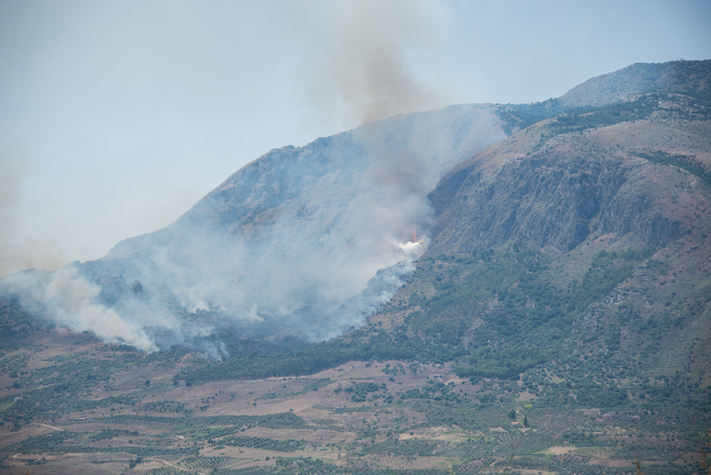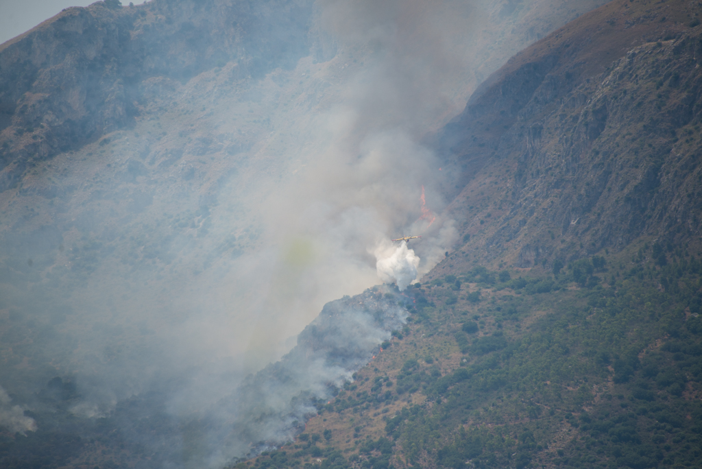 Közben a városka tóloldalán lévő hegyoldalban egy nagy erdőtűzre lettünk figyelmesek. Mire megittuk a kávénkat, addigra már repülővel oltották a tűzet. A hegyoldal előtt egy tó terült el, abból vették a vizet a repcsik, és már fordultak is vissza a hegyoldalra oltani.