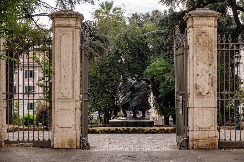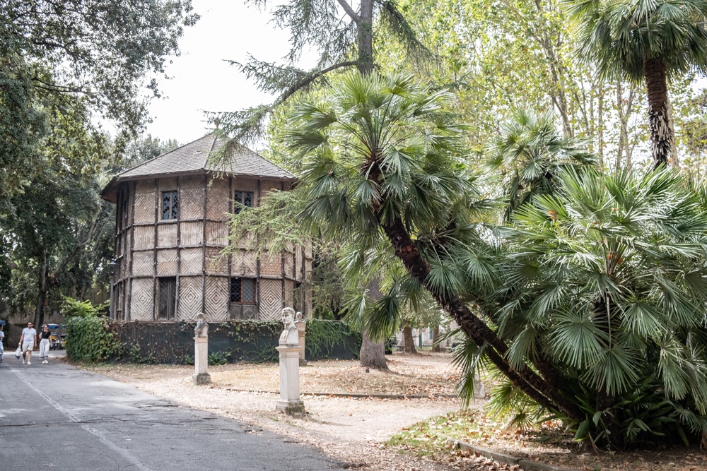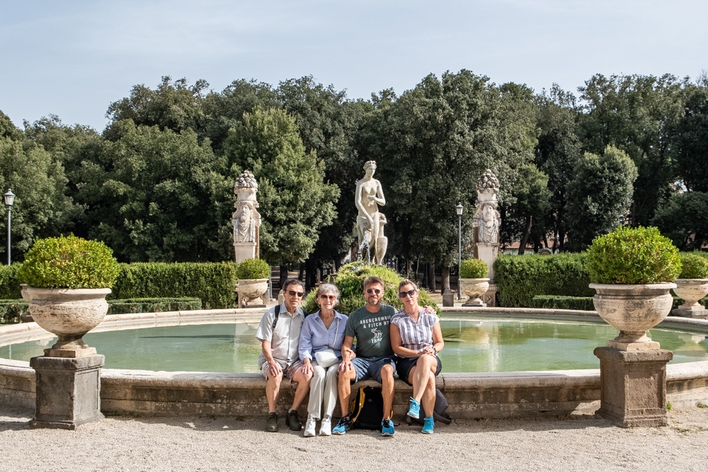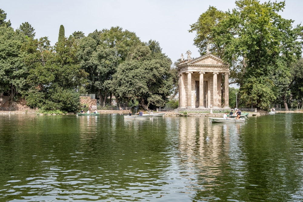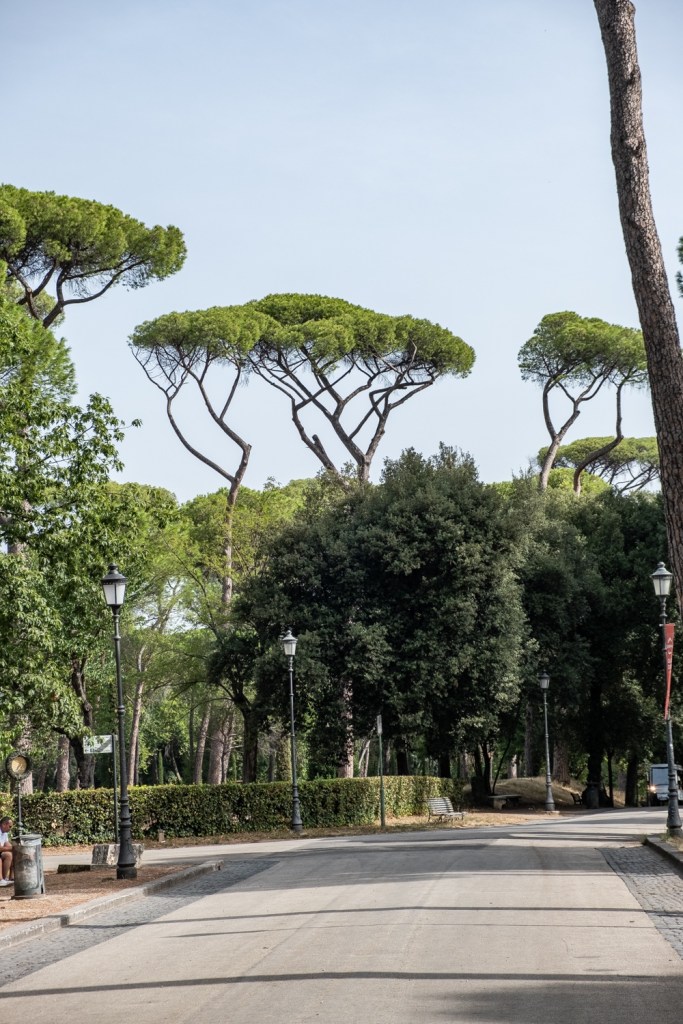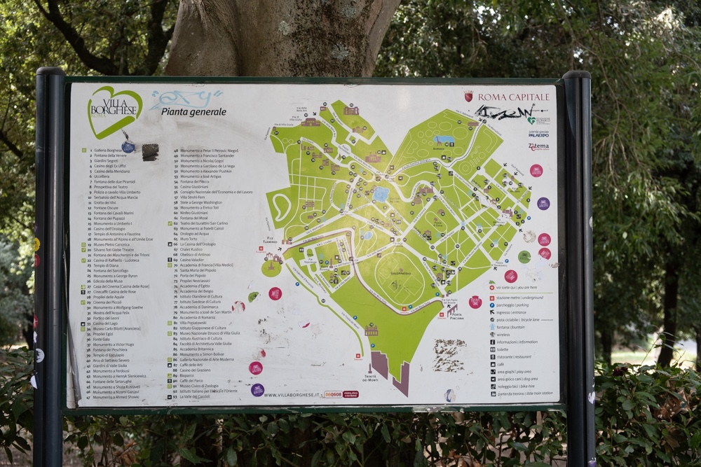 Nem kapkodtunk reggel, de 10 órára ki kellett jelentkeznünk a szállásról utolsó nap lévén. A reggeli után megbeszéltem a recepcióssal, hogy maradhatnak a csomagjaink csak pakoljunk össze. A szállás szállodának kicsi, de nem is egy egyszobás Airbnb. Egy belvárosi ház harmadik emeletén, tök szépen felújított 8 szobából plusz reggelizőből álló mini szálló kedves fiatal recepciósokkal. Így aztán 10 óra volt mikor otthagyva a csomagjainkat elindultunk felfedezni azt a parkot, ami tőlünk 15 perc sétára van és egyik este már rápillantottunk. Egy picit városliget jellegű, a város forgatagából és zajából hirtelen kiszakadva egy nagy zöld területen találtuk magunkat hatalmas fákkal és kiégett fűvel (ami tavasszal szebb lehet, ha több eső esik), kis tavakkal, szökőkutakkal. A szív alakú 80 hektáros terület Róma harmadik legnagyobb és legnépszerűbb parkja. Az 1600-as évek legelején Scipione Borghese (Pál pápa műkedvelő unokaöccse, aki bíboros volt) hozta létre a park korábbi változatát felvásárolva a város szélén lévő szőlőst, hogy itt akár kedvenc időtöltésének, a vadászatnak is hódolhasson. Később, a XVIII. században Marcantonio Borghese herceg alakíttatta ki a ma is meglévő angolkert-stílust a parkban. Akkoriban itt végződött Róma, és csak a kiváltságosok sétálhattak a Villa sétányain. Ma bármelyik római és bármelyik turista megteheti ezt