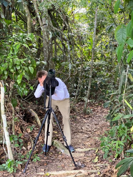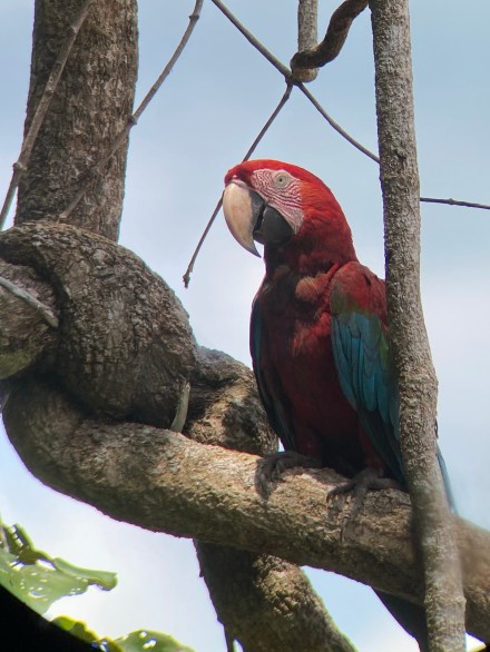 9-kor pont ugyanoda visszamentünk, ahol reggel nem jártunk sikerrel, mondván a délelőtt a majmoké. A túravezetőnk, Oscar, kihelyezett minket az egyik lesnél, elmondta a tudnivalókat, ő pedig átment a másik leshez, hogy ellenőrizze nem ott jelennek-e meg a majmok. Azt mondta, hogy ne nagyon dumáljunk és figyeljünk. Ha megjelenik egy majom, akkor pláne legyünk csendben, mert ő azért jön majd, hogy feltérképezze a terepet, mennyire biztonságos. Ahogy a srác elment mi lelkesen csendben ültünk egymás mellett négyen a lesben és csak kamilláztunk kifelé. Eltelt fél óra, mi még mindig tök csöndben ültünk és néztük a természetet, néha egy-egy madár csiripelt egy kicsit, de makiknak nyoma se volt. Én egyszer csak azon vettem észre magam, hogy lebukik a fejem és délelőtti csendespihenőn vagyok. Egy idő után már álcázni se akartam, hogy alszok, mert annyira elkapott a kóma. 20 perc elég is volt. Aztán eljött az a pont, hogy azt gondoltam kandikamera áldozatai lettünk, megnézik meddig bírjuk és hogy oldjuk majd meg a helyzetet. A többieknek is ekkortájt fogyatkozott meg a türelme, felálltunk, sétálgattunk, nyújtóztunk egyet, igyekeztünk más szemszögből is felmérni a terepet, de persze némán, minden nessz nélkül. Bandi elkezdte bűvölni az ott hagyott távcsővet, és talált is egy madarat egy messzi fán. Méghozzá egy ara papagájt. Bő fél óra múlva elkezdtek megjelenni a papagájok. Gyönyörű piros – kék színben pompázva egyre hangosabban mondták a magukét. Mi meg csak forgattuk a fejünket és a távcsövet a hang irányába. 11 órára, mire kellőképp sok papagáj megjelent, visszajött emberünk is. Tudomásul vette, hogy nem makik, hanem papagájok vannak és velünk együtt figyelte a madarakat. Még egy órán át csodáltuk őket, aztán délben visszasétáltunk a bázisra.
