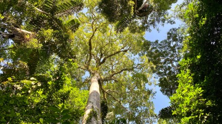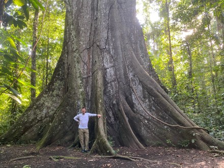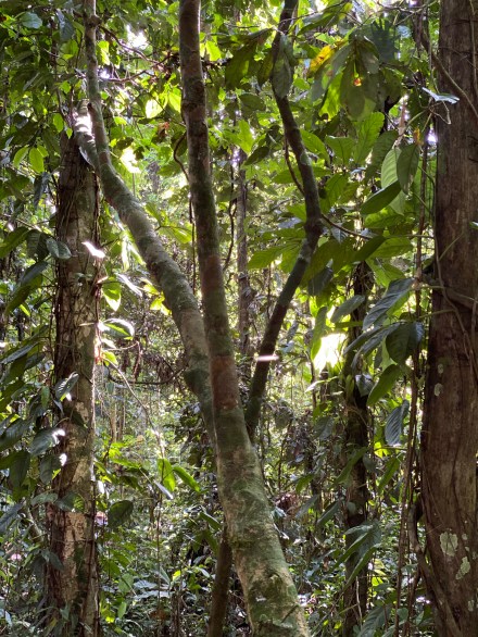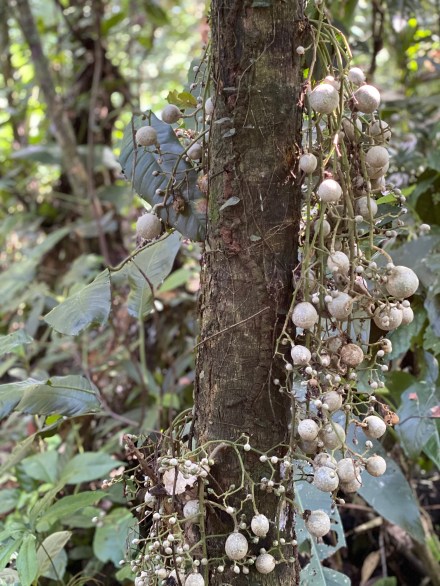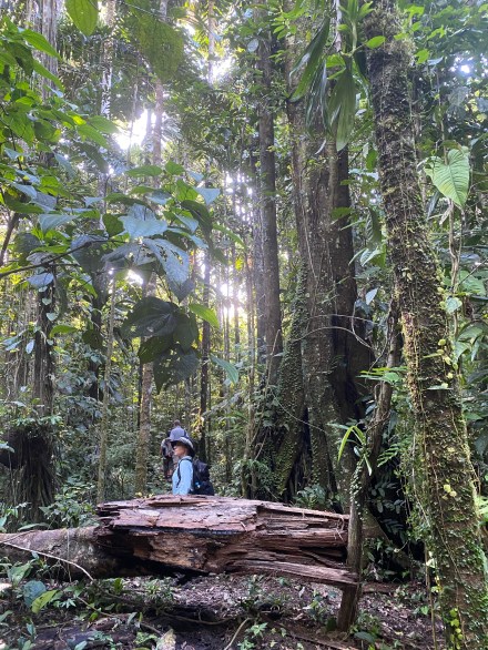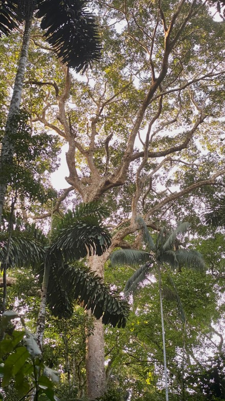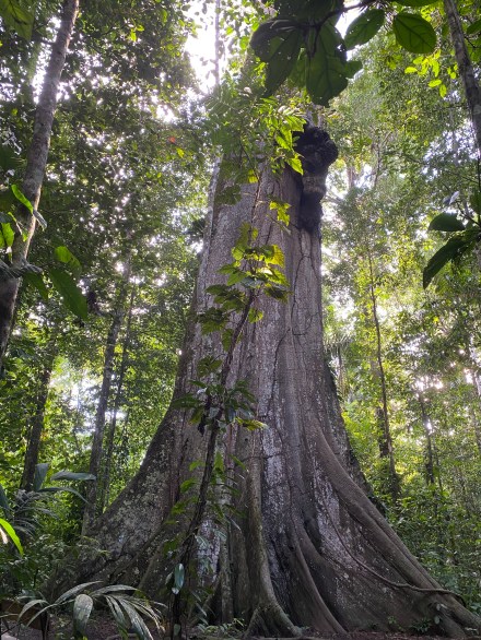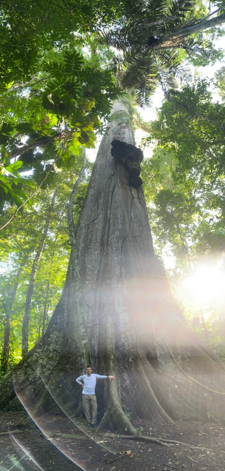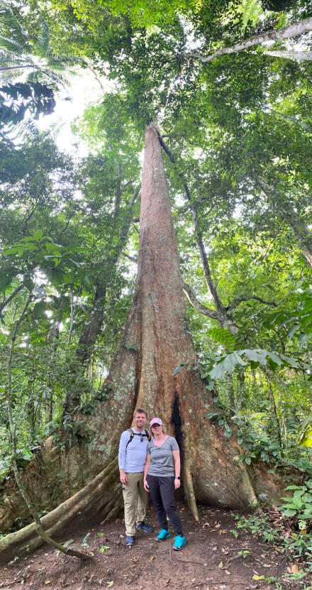 Délután szimplán csak izzadtunk mert olyan meleg van, és olyan magas a páratartalom. Aztán 4 óra előtt elindultunk a mai túravezetőnkkel. Ő kevésbé beszédes, mint az előző túravezetőink. Azon az úton indultunk, amin tegnap este mentünk éjszakai túrára. Gondoltam magamban, nagyon izgalmas lesz, ha mégegyszer ugyanazt megnézzük, csak éppen világosban… De hamar túlmentünk az éjszakai túrás szakaszon, majd jött az igazán dzsungel. Vad buja növényzet, átlagosan 30-40 méter magas fák indákkal és mindenféle más zöld növénnyel befutva. Kapkodtuk a szemünk, na meg a lábunk is. És már épp megjegyeztem Bandinak, hogy hova sietünk ennyire, amikor megpillantottuk a világ második legnagyobb fáját (a legnagyobb Amerikában, a Sequoia Nemzeti Parkban lévő mammut fenyő), és csak álltunk és bámultunk. Esélytelen visszaadni képen. A 300-400 éves fát körbejárva csodáltuk. Megtudtuk, hogy ez a fa kb kétszer olyan magas, mint itt az átlagos 30 méteres fák. A közelében volt egy másik óriás fa, aminek bár a törzse jóval karcsúbb volt, ámde a korát 800-1000 évre becsülik. A fa mindenkit az Avatar filmre emlékeztetett, mert 40 méteres magasságba a keresztágakon különféle növények telepedtek meg és zöldelltek rajta. Fantasztikus volt.