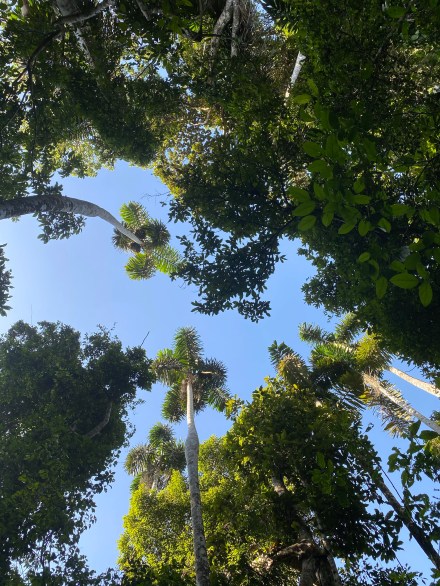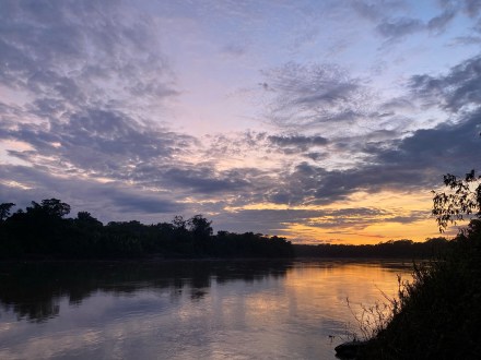 Mi nem madárcsicsergésre ébredünk, hanem maki makogásra. 5:15-kor olyan hangzavart csináltak az “ablakunk” melletti erdős részen, hogy pizsamában kimentünk makit keresni/nézni. Nem is volt baj, mert 6-kor indulni akart a 4 fős kis csapatunk ara papagájokat nézni. Egy pár perces sétára a folyó partján van két madárles. Oda mentünk, ahol jellemzően megjelennek reggel 6 és 7 óra között. De ma reggel sajnos mégsem nekünk kedvezett a természet, a papagájok nem jöttek erre a területre. A leshez gyalogolva egy fa legtetején láttunk két ilyen papagájt tanácskozni, lehet akkor beszélték meg, hogy ezekkel a turistákkal ma kiszúrunk.