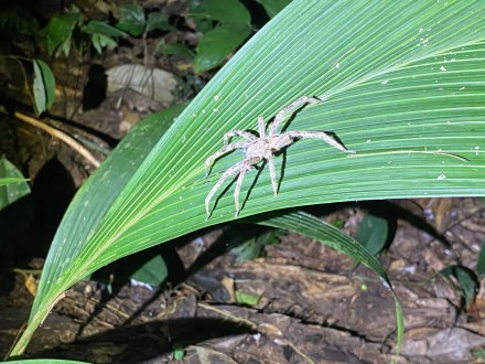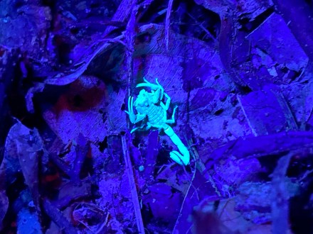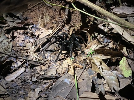 Ugyan 6 órára visszaértünk a “birtokra”, de akkor egyből indult is az éjszakai túránk. 6 órakor kezd sötétedni, negyed 7-kor már csak az elemlámpáink világítottak. Ez volt az a pont, ahol én végképp kiléptem a komfortzónámból. Éjszaka ugyanis lehetőség nyílik arra, hogy a nappal nem látható emlősökkel és rovarokkal is találkozzunk. Egy kicsit olyan érzésünk volt Bandival, mint mikor búvárkodtunk, és lemerülve a húszon méter mélyre keresgéltük a tengeri kincseket. Itt is a túravezető ment elől, próbálta felfedezni a terepet, mi meg csak bámultunk, hogy mi minden kerül itt elő. Találkoztunk denevérrel, olyan hatalmas hangyával, aminek a csípése 24 órán át durván fáj, botsáskával, mindenféle bogárral, éjszakai lepkével, bolíviai békával, gekkoval, ugró pókkal, majd egy tenyérnyi méretű tarantula pókkal, aztán pedig egy másik helyen sok kis baby tarantulával (ami mondanom se kell, hogy így is túl nagy volt), és néhány fán ugráló majommal. Na és láttunk skorpiót is, ami uv fényben volt igazán jól látható.