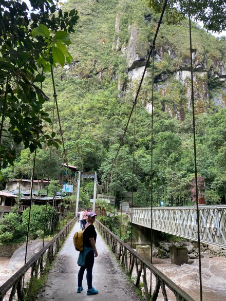A vonat a hegy lábánál lévő falucskába, Aguas Calientesbe ment. A falu próbál az idegenforgalomból megélni, látszik, hogy sok a fejlesztés, de közben meg olyan ciki épületek is vannak a falu közepén, hogy nem is érted, hogy lehet az ott. Ollantaytambotól egész Aguas Calientes-ig az Urubamba folyó mentén mentünk, ami nagyon látványos, erős sodrású folyó, bár a színe ha jóindulatú akarok lenni akkor is maximum csokibarna. Innen a faluból egy pici sétával eljutottunk a buszhoz, ami 10 percenként (de ha kell sűrűbben) jár és hozza-viszi a turistákat a faluból fel a Machu Picchura meg vissza. Aki nem akar busszal menni, az felmehet gyalog is, de annak több mint 1350 méteres szintkülönbséget kell lépcsőn felfelé megtennie.