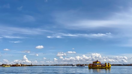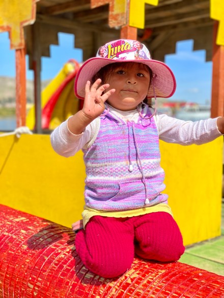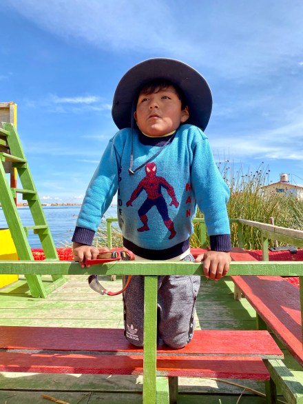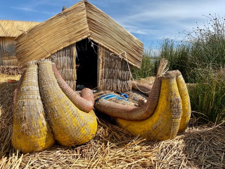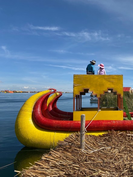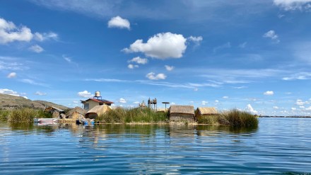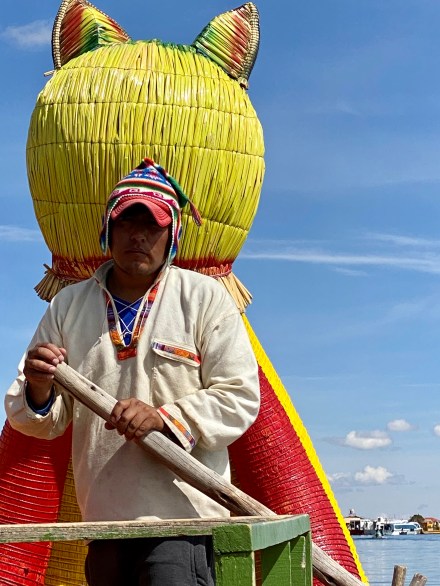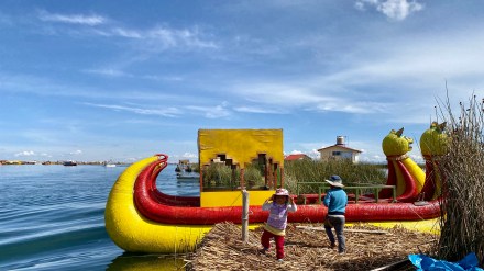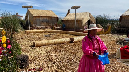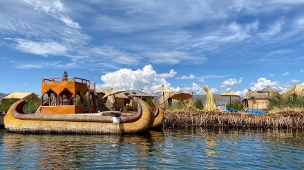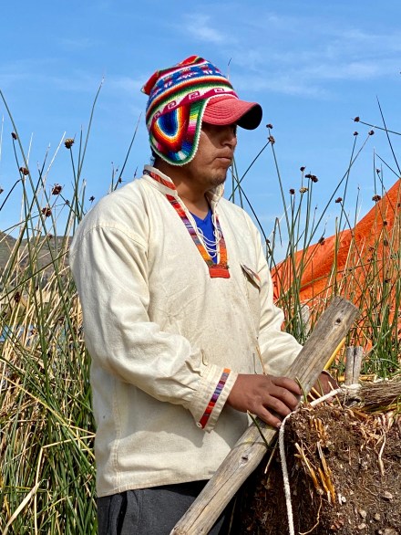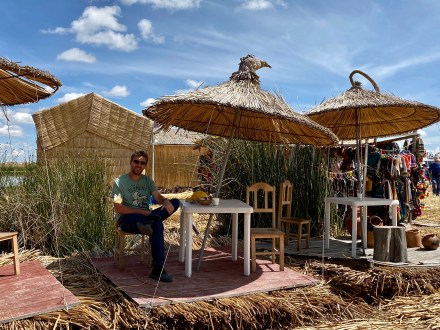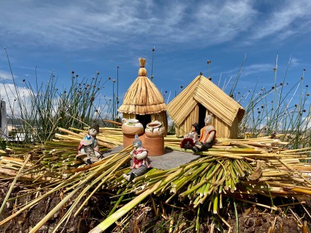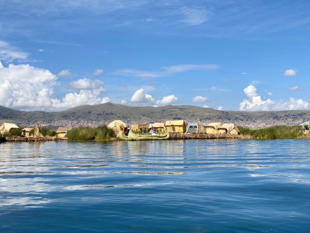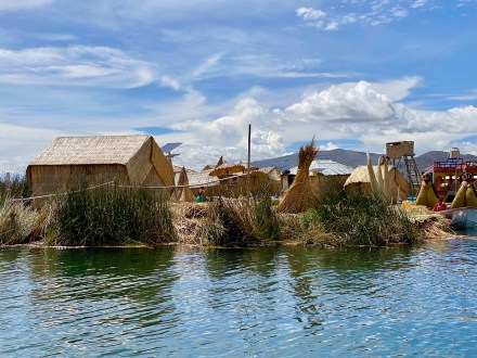 Punotól 5 km-re találhatóak az úszó szigetek. Az uruk a collák és az inkák elől menekülve hozták létre saját szigeteiket, lakhelyeiket. Nagyjából kétezren lehetnek, több tucat szigettel. Szigeteiket a tavon növő totora nádból készítik. Az alap a gyökérzet, erre szövik rá nádból az újabb rétegeket, amelyeket folyamatosan frissíteni kell. A nádszigeteket kötéllel rögzítik. De az uruk nem csak szigeteiket készítik totrából, hanem házaikat, csónakaikat, bútoraikat és használati tárgyaik egy részét is. A turista hajók kikötnek egy-egy ilyen család szigetén, ahol aztán megmutatják, hogy hogyan élnek. A mi hajónkban 16-an voltunk, ami elég ideális szerintem. Ahová először ki akart kötni a hajónk, oda kötött ki épp egy másik is. Még mondtam is Bandinak, hogy eddig tartott, hogy csak 16-an vagyunk. De tovább mentünk és keresett a túravezetőnk és a kapitányunk egy olyan családot, ahol nem volt senki. Kifejezetten kedves, szimpatikus családnál kötöttünk ki. Megmutatták és elmagyarázták, hogy hogyan épül fel az úszó sziget, mire kell figyeljenek. Megmutatták, hogy hol és miként alszanak, miket készítenek a nők: a karkötőtől a párnahuzaton át egészen a terítőig. Természetesen céljuk volt ebből minél többet eladni. Majd a saját maguk által épített hajójukon átvittek a ”helyi piacra” minket, ahol a mi hajónk ott várt ránk. Az úszó szigeteken majd két órát töltöttünk.