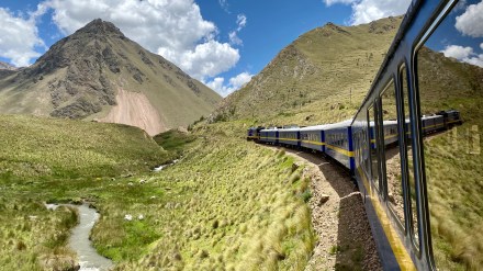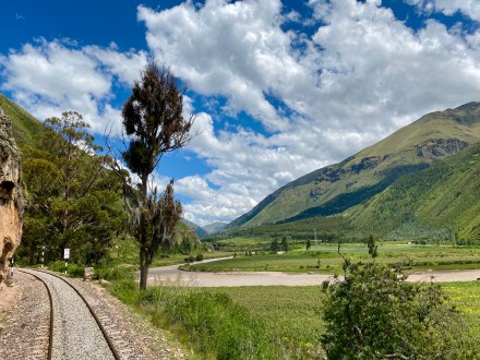 Mire lelépcsőztük magunkat a faluba, addigra már sétálhattunk is a vonatállomásra. Ittunk egy jó kávét, és szinte szállhattunk is fel a két kocsiból álló Aguas Calientesből – Ollantaytamboba tartó vonatra. Ugyan Cuscoba kellett eljussunk, de a vonat január 1-április 30 között csak rövidebb szakaszon jár karbantartás miatt. Ez már akkor kiderült mikor vettem a jegyet, a rendszer automatikusan adta a buszjegyet a második szakaszra. És most megtudtuk mi a különbség a reggeli olcsóbb vonat és az eggyel drágább vonat között. Eleve kis szendviccsel, sütivel és itallal vártak minket majd a vonat személyzete egy vicces műsort tartott és végül jött a divatbemutató (melyet szinten a személyzet adott elő) baby alpakából készített termékekkel, amit aztán aránylag magas áron meg is lehetett venni. Nagyon szép cuccokat árultak. Ahhoz, hogy elérjük a félúton lévő buszunkat bő másfél órát vonatoztunk.