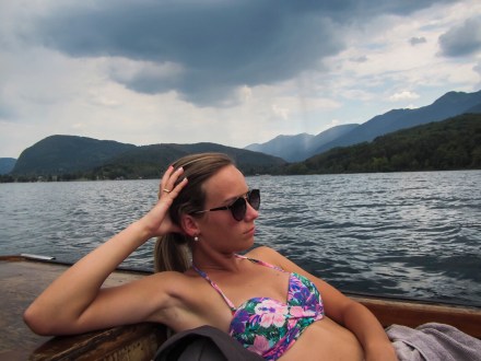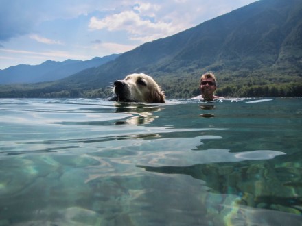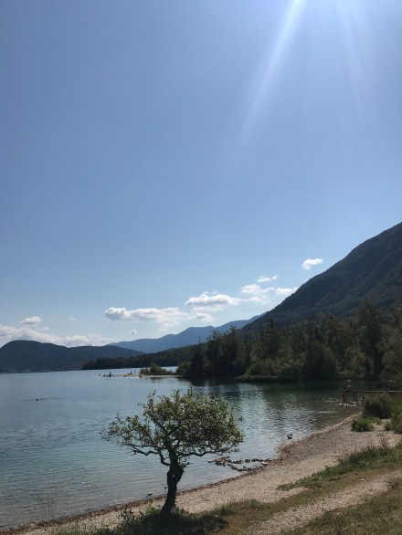 Mire megreggeliztünk már nyoma sem volt a ködös reggelnek, sütött a nap. Az időjárás-előrejelzés erre a völgyre az elkövetkezendő tíz nap közül csak mára ígért napsütést. Sőt a többi napra esőt jósol. (Mondjuk mi ebben nem hiszünk!) Egyértelmű volt, hogy akkor ma tavazunk. Elindultunk Lidiéknek megmutatva az általunk már ismert szakaszokat: a tó Ukanc felőli végéből a másik végéig mentünk imitt-amott megállva egy kicsit fürdeni, egy kicsit pihenni. Boogie előtt le a kalappal. Jövő héten lesz 4 hónapos, de a kis nyurga lábaival lelkesen és töretlenül végignyomta ma velünk a túrát.