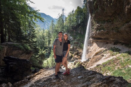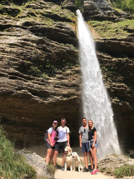 A Pericnik vízeséshez mentünk el, ami egy bő órás autóútra volt. 10 után indultunk, és amikor megérkeztünk, akkor először megetettük a srácokat, mondván nehogy a kocsiba köszöjön vissza a reggeli.