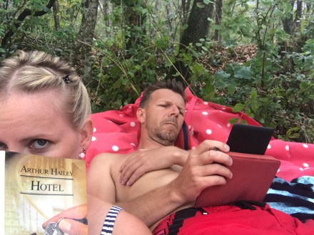 Aztán majd dél volt mire lebattyogtunk a tópartra a kis könyveinkkel, fekhellyel, kutyával felszerelkezve. Nem volt valami őrült kánikula, de azért csak bementünk a vízbe. (Még én is!).