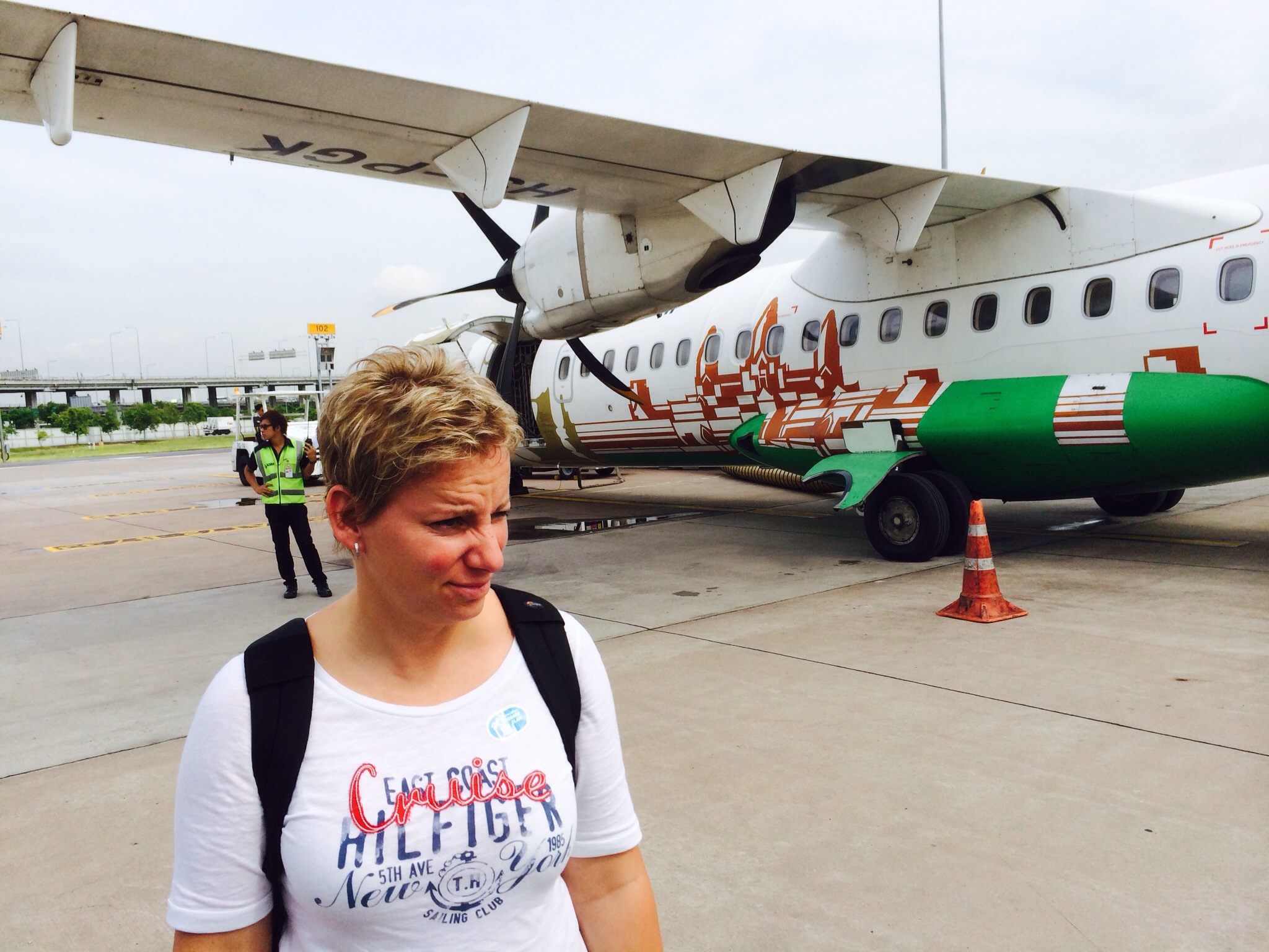 A nap, amely nem 24 órából állt, hanem 29-ből. Reggel korán keltünk, gyors csomagolás és reggeli után elköszöntünk Rékától. Bangkoki idő szerint 8 óra után picivel indultunk a szállásról a reptérre. Nem nagyon tudtuk kiszámolni, hogy milyen lesz a forgalom, és már kétszer is ültünk dugóban a két nap alatt, így nem mertünk kockáztatni. Oly gyorsan kiértünk, hogy 3 óránk volt a gép indulásáig. Na nem kellett szenvedjünk, hogy mivel töltsük el azt a 3 órát, mert az útlevél vizsgálat baromi hosszas volt. Ráadásul az országba való belépéskor ki kellett tölteni egy űrlapot, aminek az egyik felét maguknál tartották a hivatalnokok, a másikat lepecsételve visszaadták, hogy majd kilépéskor kell leadni. A fiúknak még be is tűzték az útlevelükbe, így ők nem hagyták el. Mondjuk Eszto se hagyta el, csak én… Volt nagy dilemma, hogy most akkor mi lesz. Dió megnyugtatott, hogy tuti nem én vagyok az első ember, aki elhagyja. Valószínűleg igaza volt, ugyanis a hosszú sor végén volt egy pult, ahol ki voltak rakva ilyen űrlapok. Hamar kitöltöttem, és amikor sorra kerültem akkor elővettem a legszebb mosolyom, majd őszintén bevallottam, hogy a kilépő papírom elhagytam, de már rajzoltam helyette újat. Emberünk pedig szimplán bólintott, jelezve, hogy tudomásul vette, majd küldött még egy visszamosolyt.