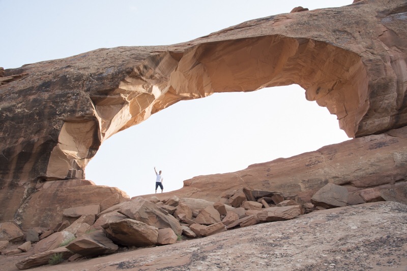 A következő célpontunk Moab városa, ahonnan két nemzeti parkot is meg tudunk majd közelíteni, így itt két éjszakát fogunk eltölteni. Ez csak másfél órányira volt, de sokszínű út volt: volt olyan szakasz, mintha a sivatagban nagy vakondtúrások lennének, aztán volt olyan szakasz, mintha tök trehányul lehányták volna a köveket (itt megjegyeztem a Bandinak, hogy micsoda rumli van, mire megkérdezte, hogy megálljon-e, rendet rakok-e?), és volt olyan szakasz, ahol a gyönyörű vörös sziklák meredtek az ég felé. Délután 2 után nem sokkal érkeztünk meg, viszont mind a ketten vágytunk egy délutáni pihenésre. Egy óra hosszat nem csináltunk semmit, majd rájöttünk, hogy most vagyunk itt, most kell menni.