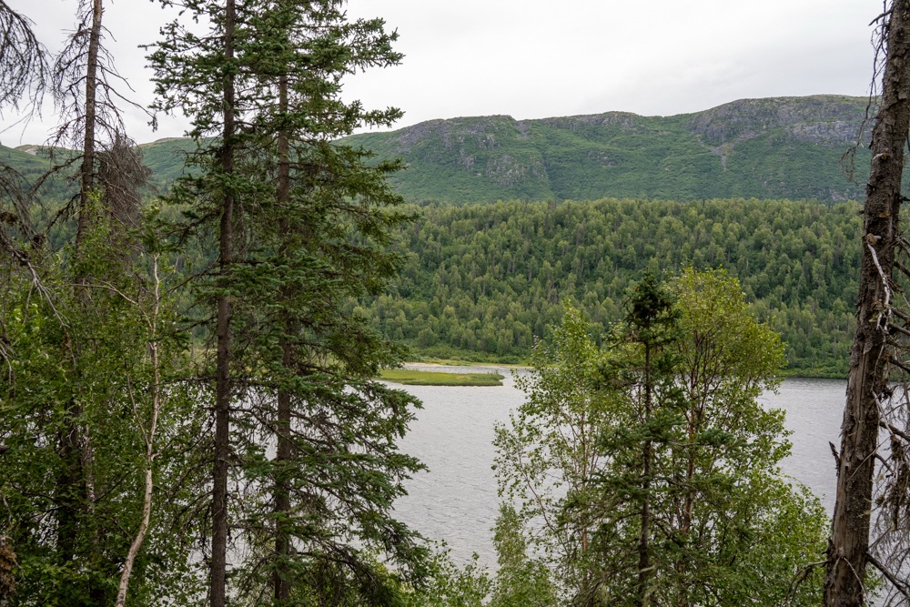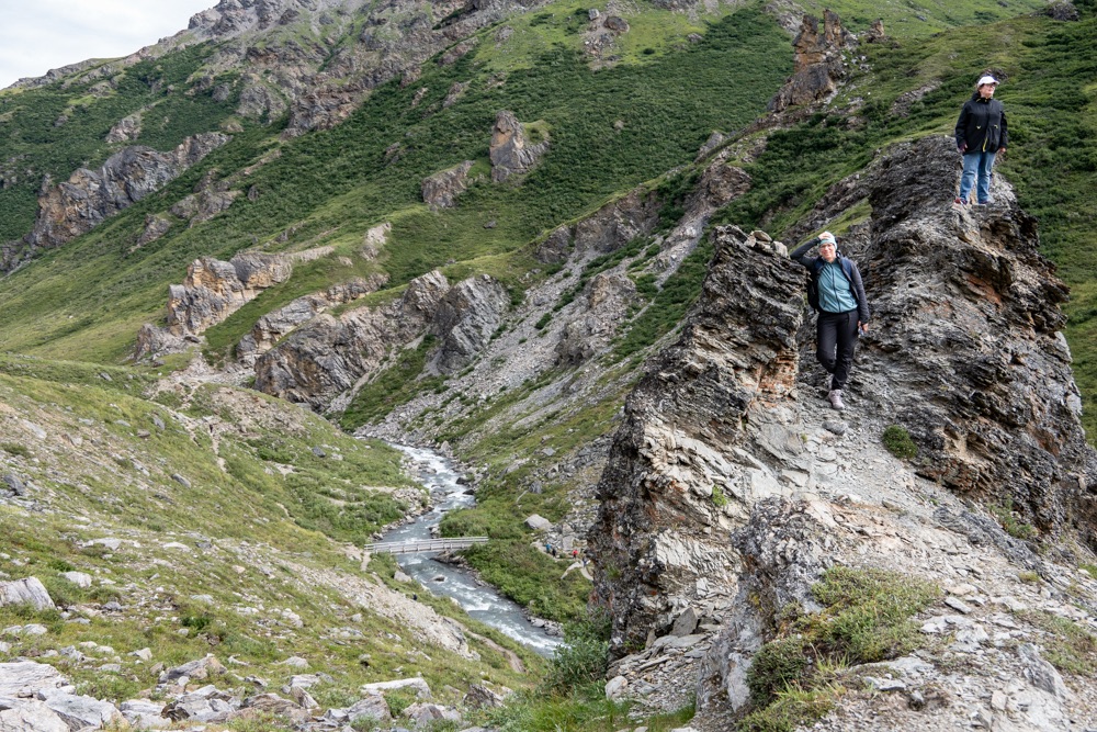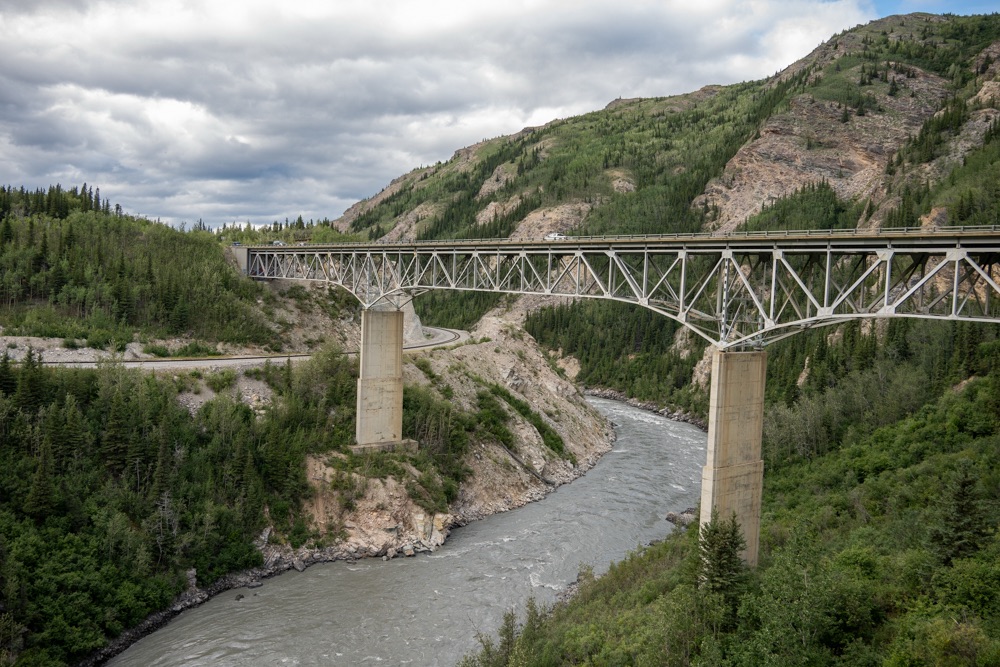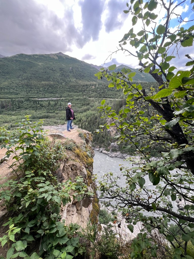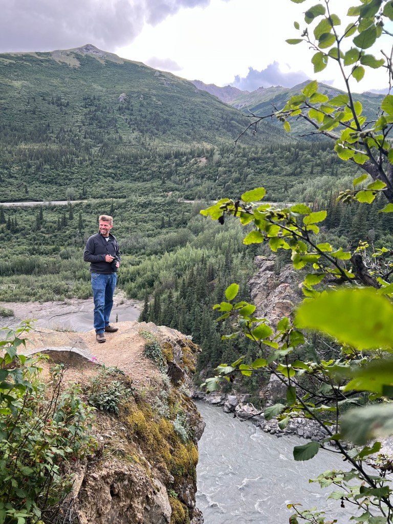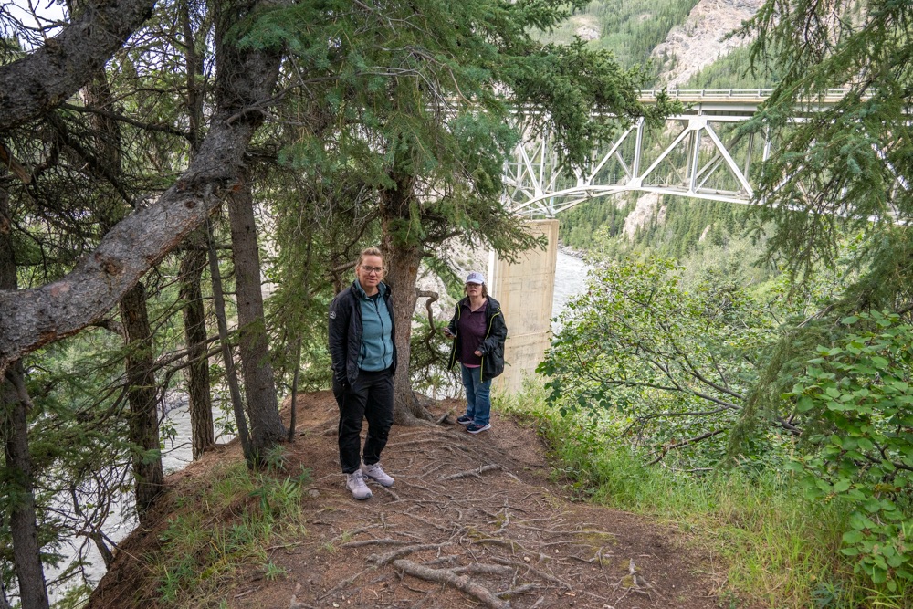 A nap poénja az volt, amikor jöttünk visszafelé a boltból, akkor a Nenana folyó felett átkeltünk egy magasan lévő hídon, és közvetlenül utána volt egy poros, koszos kis kiálló, ahol Bandi leparkolt, mondván hátha ki tudunk sétálni, körbenézni. Egy vékony kis ösvényt találtunk, ami kivitt minket egy szikla szélére, ahonnan a folyóra is szép volt a lelátás és a hídra is. Fotóztunk és élveztük a látványt, majd libasorban elindultunk vissza. Én mentem elől, de félre kellett állni, mert jött szembe egy korunkbeli srác motoros ruhában. Megkérdi egyszerű angolsággal, hogy szép-e a kilátás. Mondom igen, érdemes kisétálni (hasonlóan egyszerű angolsággal). Majd Bandi mond nekem valamit, mire a srác: Csak nem magyarok vagytok? – Ő Szegeden él, de kijött a nagynénjéhez San Franciscoba úgy egy hónapra, hogy közben motorral túrázik Alaszkában. Minden évben kijön, a motor fixen meg van, és a nemzeti parkokat járja be. Idén Alaszka van neki soron. Ez is egy élet. De szimpi srác volt.