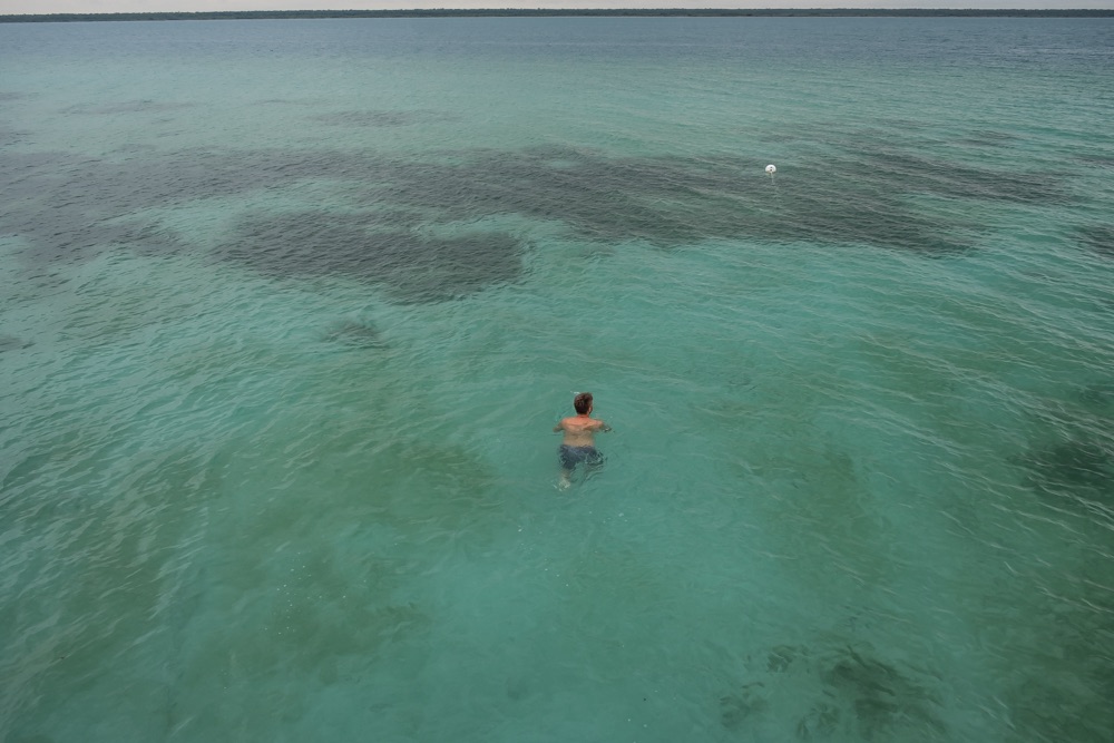 Campeche óta a kamionokat és a kátyúkat kerülgettük, ami még nekem is fárasztó volt az anyós ülésen. Nehezebben ment a napközbeni kocsiban való szunyókálás. De Bacalart elhagyva Mahahual irányába legalább a kamionok megszűntek. Viszont Mahahualból Tulumba úgy lehet eljutni, ha visszamegyünk a kamionos építkezős útra. Még mindig a vasutat építik, elég nagy projektnek tűnik.
