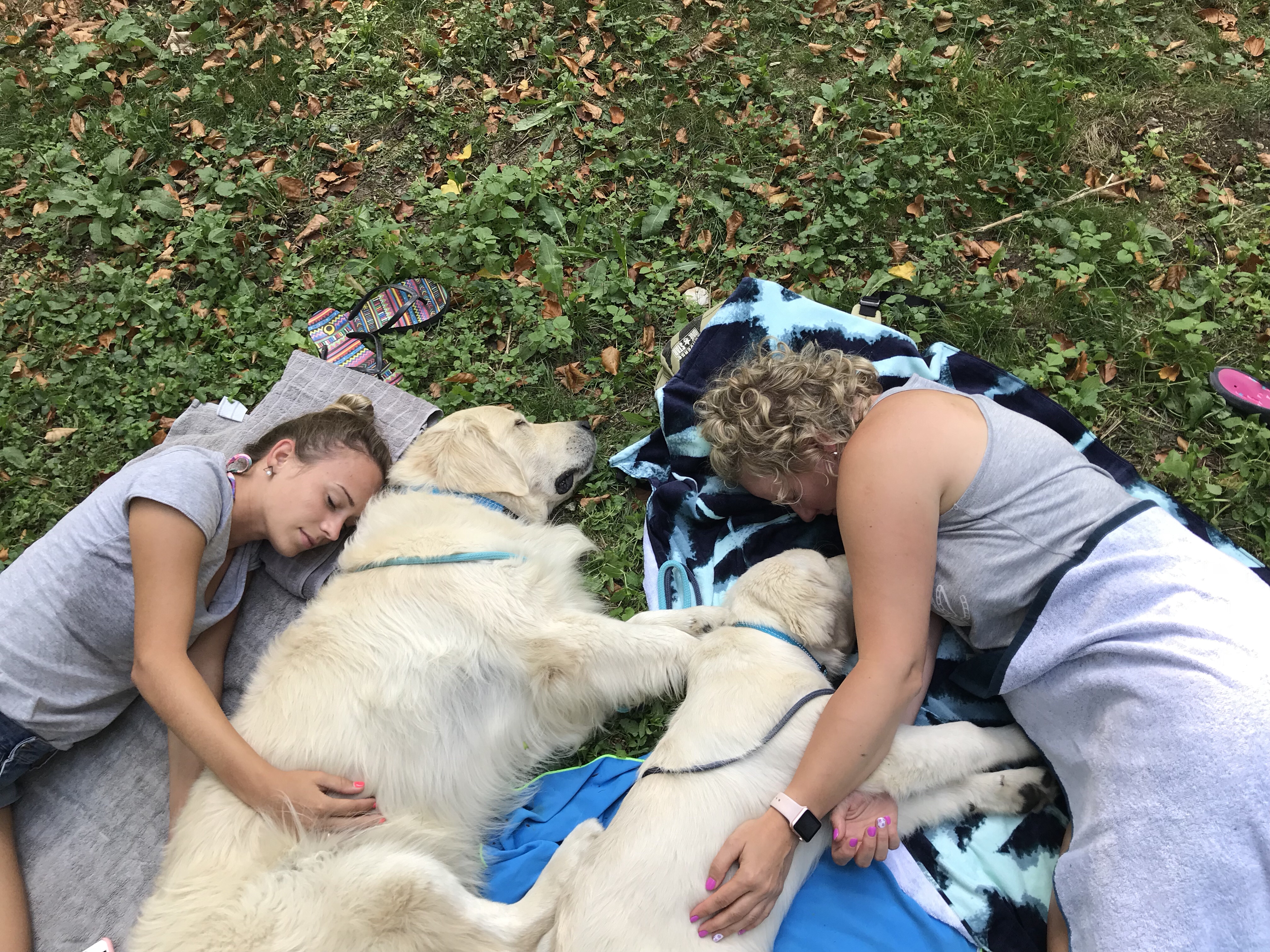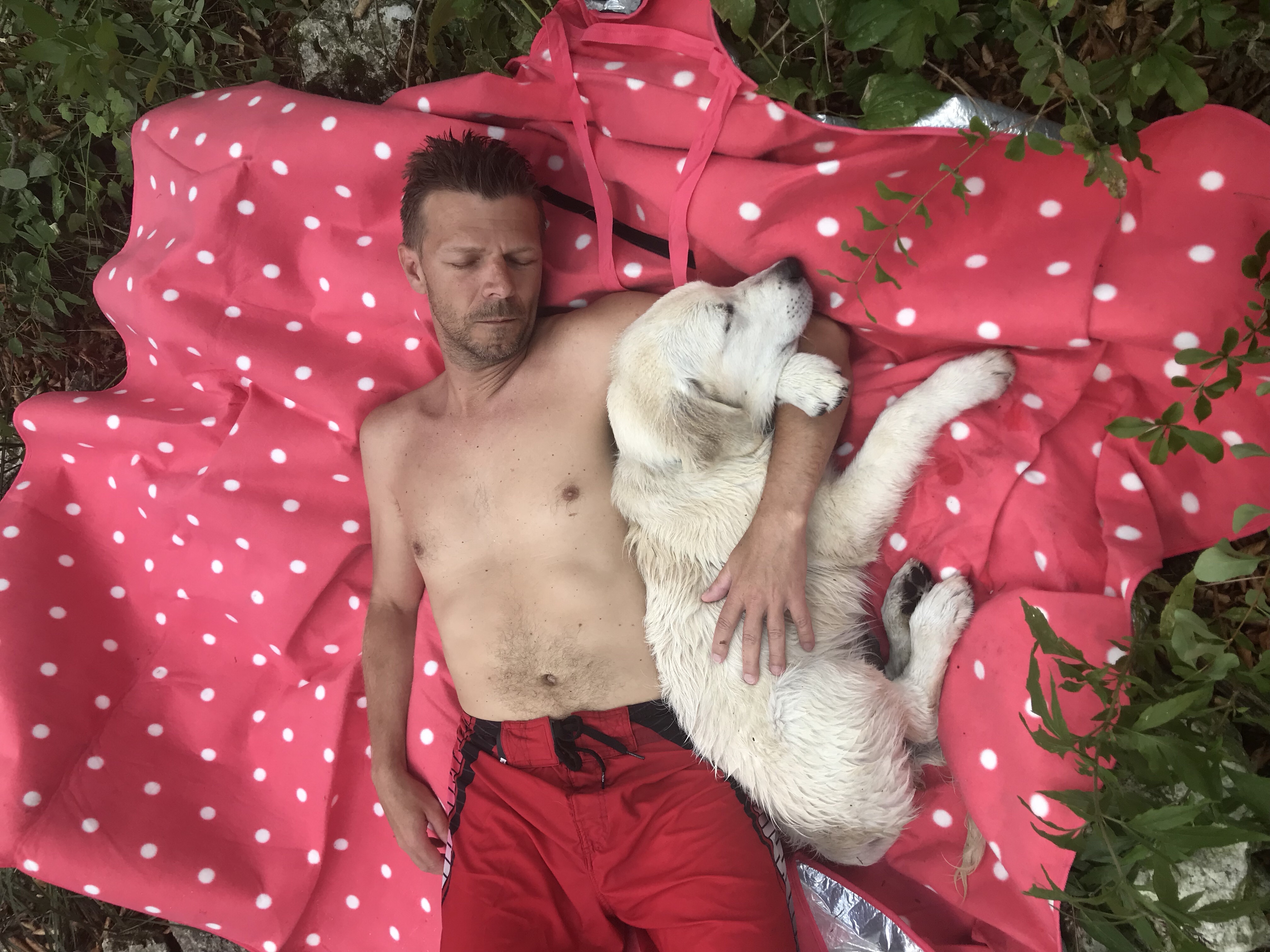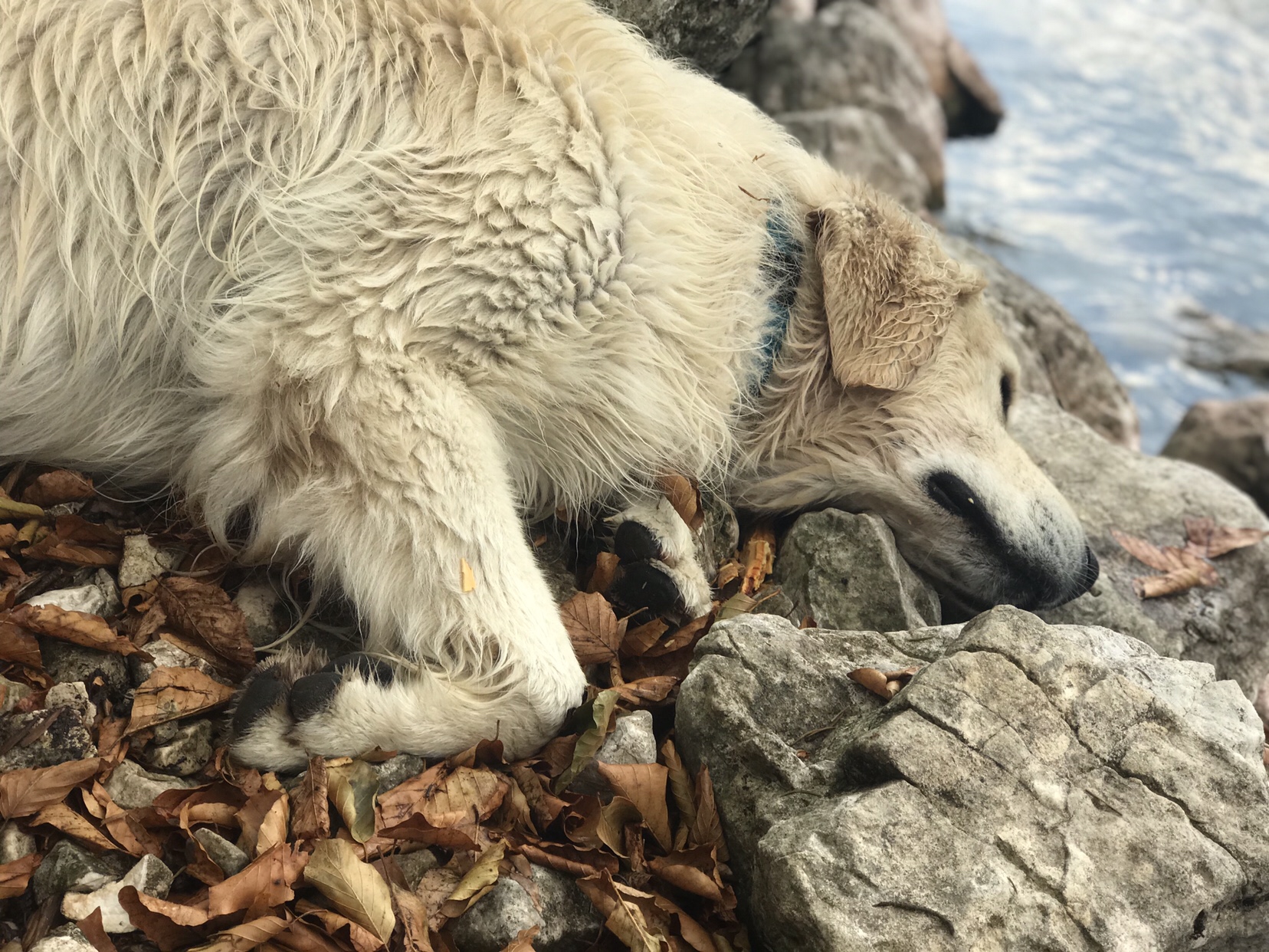 Végül a tó túlsó felén maradtunk, mert még 8 km lett volna visszamenni. Boogie viszont kipurcant a végére. Beültünk enni és mindkét kuty csak feküdt és aludt. Bandi visszasétált a kocsiért mi pedig csak lefeküdtünk a kutyák mellé egy zöld terepre.